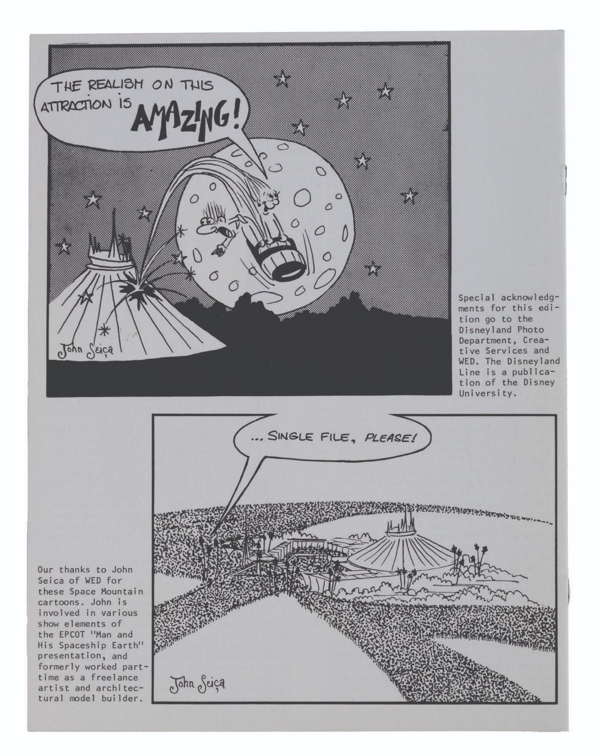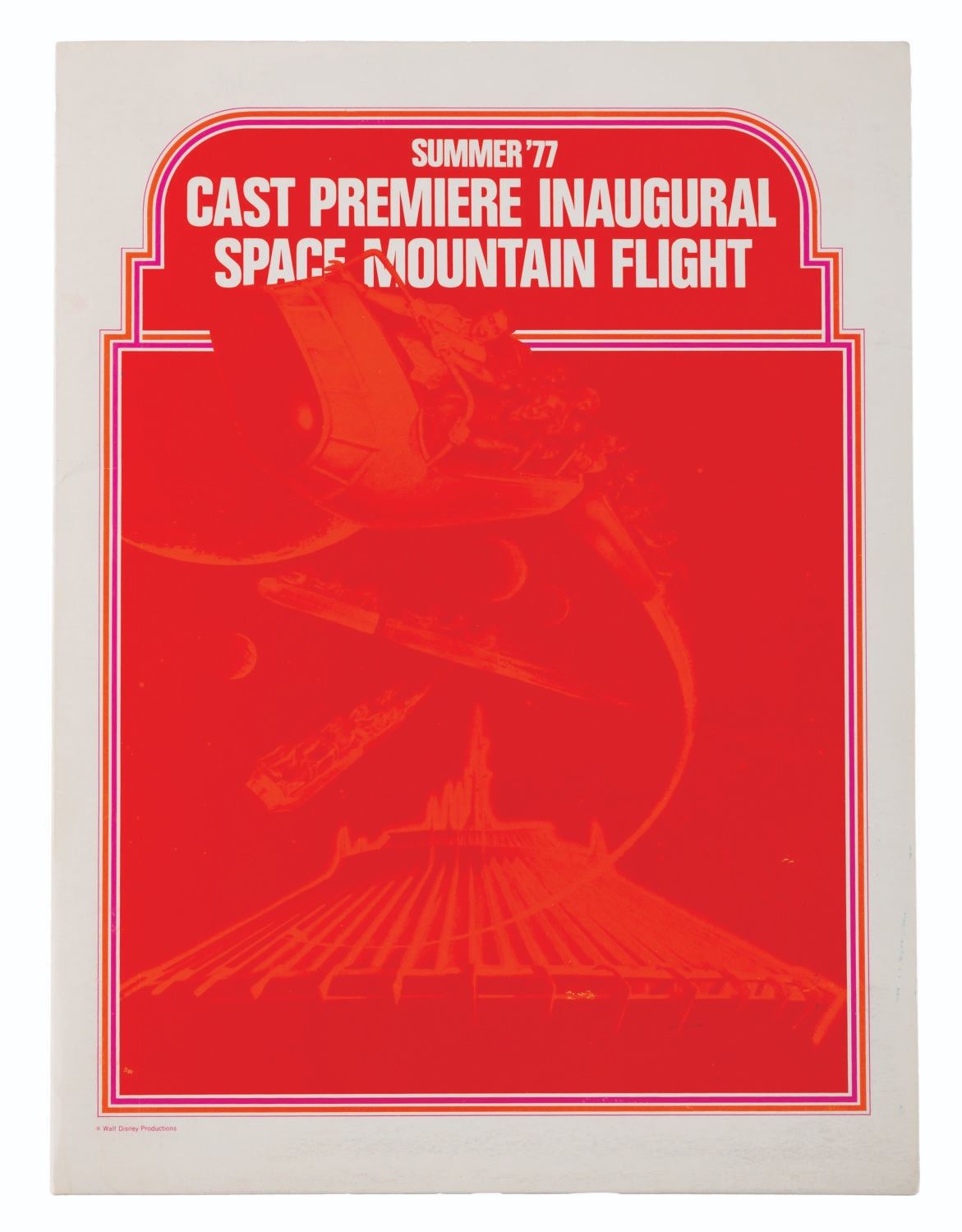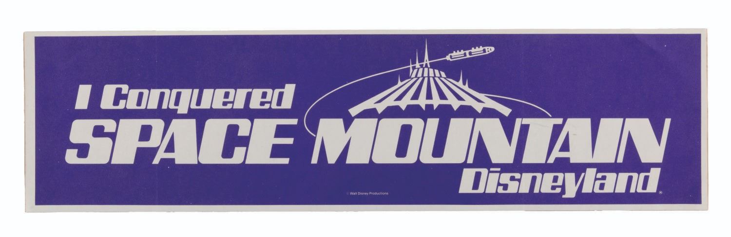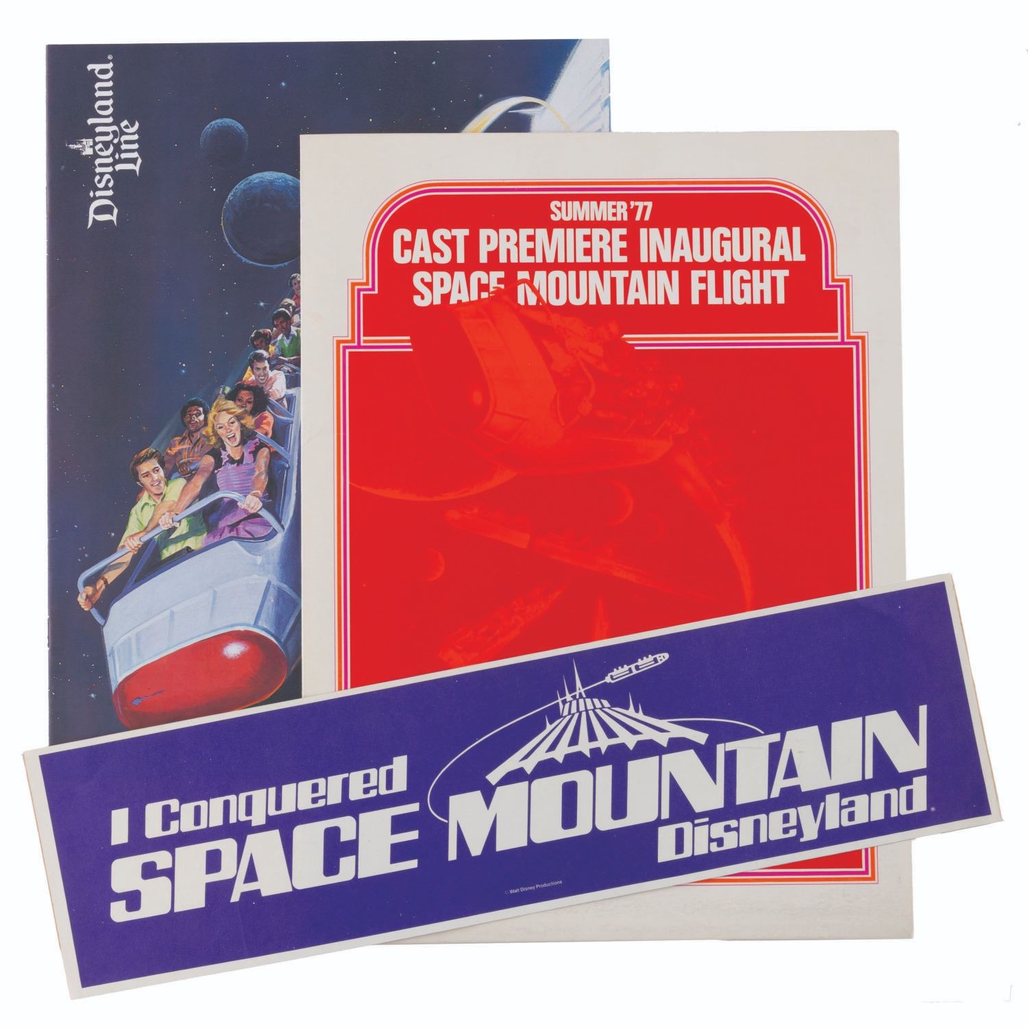(Disneyland, 1977) A Cast Member Folder for the Space Mountain Inaugural Flight Event in the summer of 1977. Included inside are the special Space Mountain issue of Disneyland Line, the Cast Member newsletter, and an "I Conquered Space Mountain Disneyland " bumper sticker. The 3.75 " x 14 " bumper sticker and 8.5 " x 11 " Disneyland Line are in very good condition with very light handling wear, and the 9 " x 12 " folder is in good condition with light wear and spotting to the back cover.