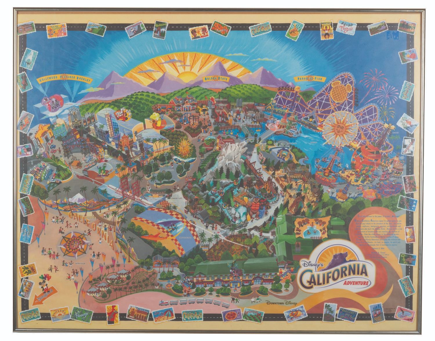(Disney's California Adventure, 2001) A stylized illustrated map of Disney's California Adventure Park in its opening year of 2001. Rolled as issued, the map measures 26.5 " x 34 " and is in good condition with very light waviness throughout, and the left edge previously folded to fit into a frame.