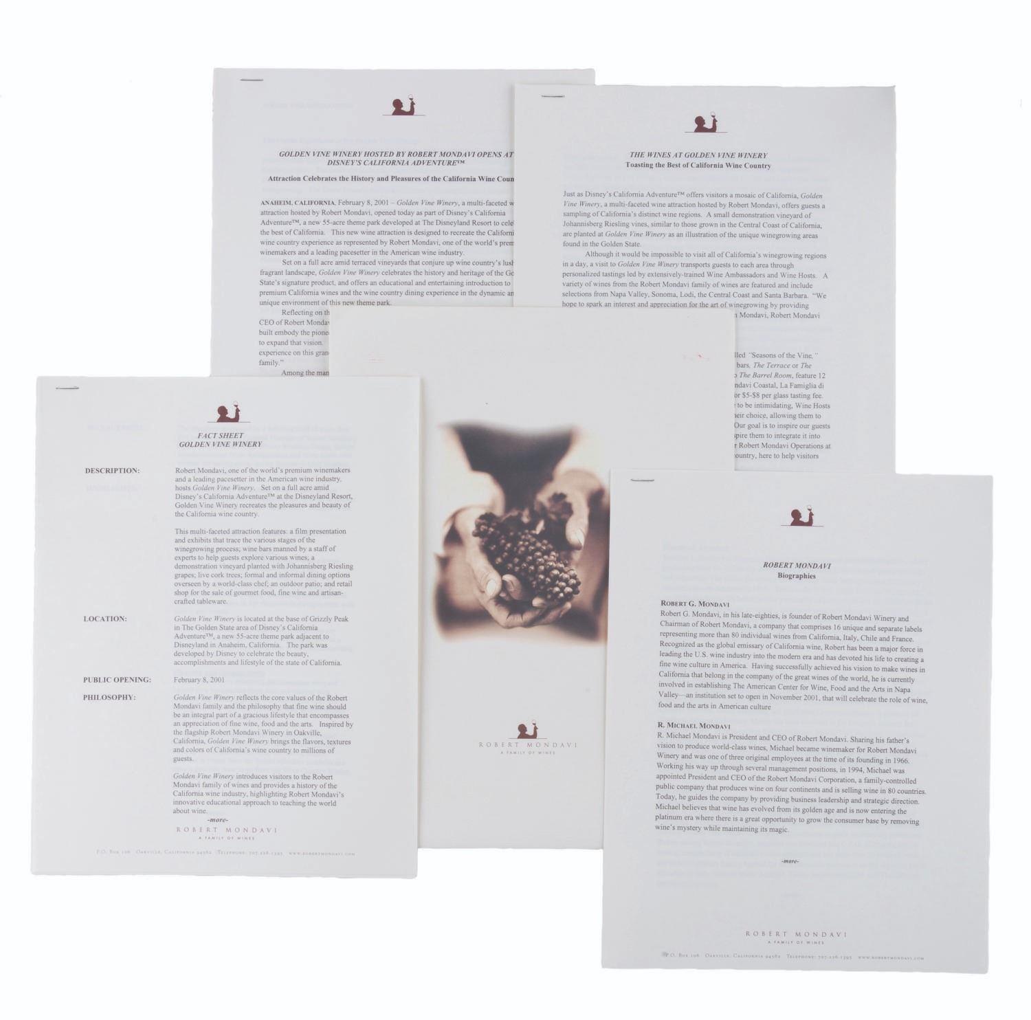 (Disney's California Adventure, 2001) A press kit for the Golden Vine Winery attraction and dining space at Disney’s California Adventure, presented by acclaimed winemakers the Robert Mondavi Family. Inside of the folder are two press releases, biographies, and a fact sheet, providing an early look at the opening day attraction. Measuring 9 " x 12 ", the press kit displays in very good condition with creases, handling wear, and spots of discoloration.