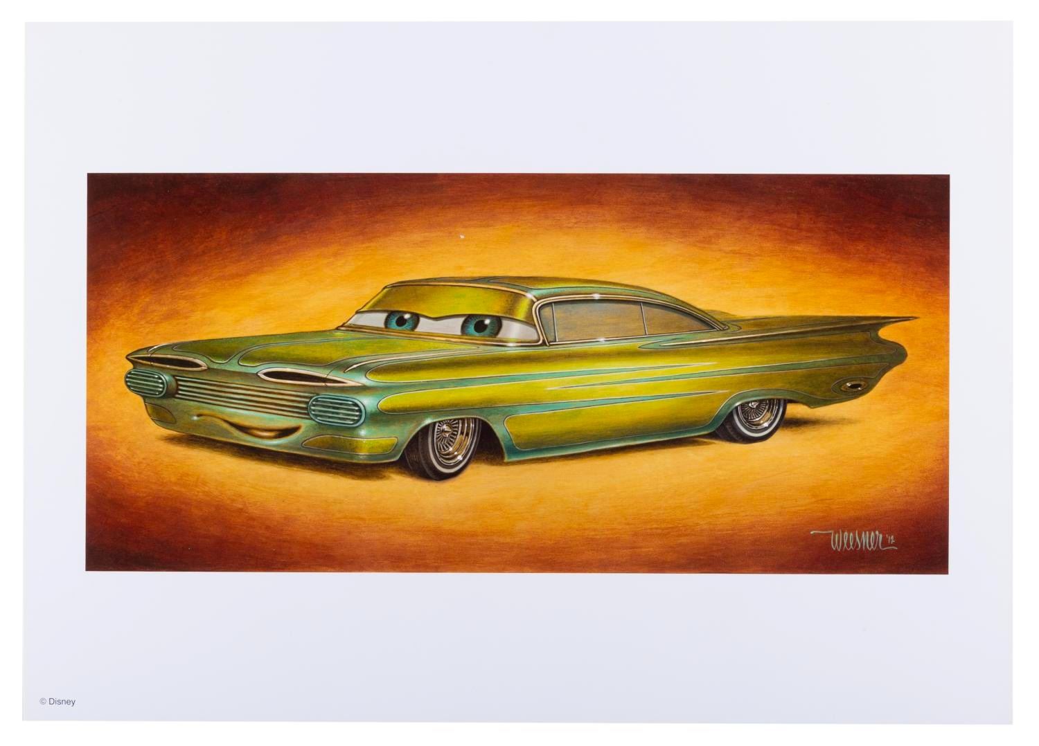 (Disney California Adventure, 2012) A print of Ramone by artist Keith Weesner from the opening year of Cars Land in Disney California Adventure. With an image size of 6.25 " x 13.5 " and measuring 11 " x 15.5 " overall, the print displays in very good condition with scuffs, creases, and light wear.