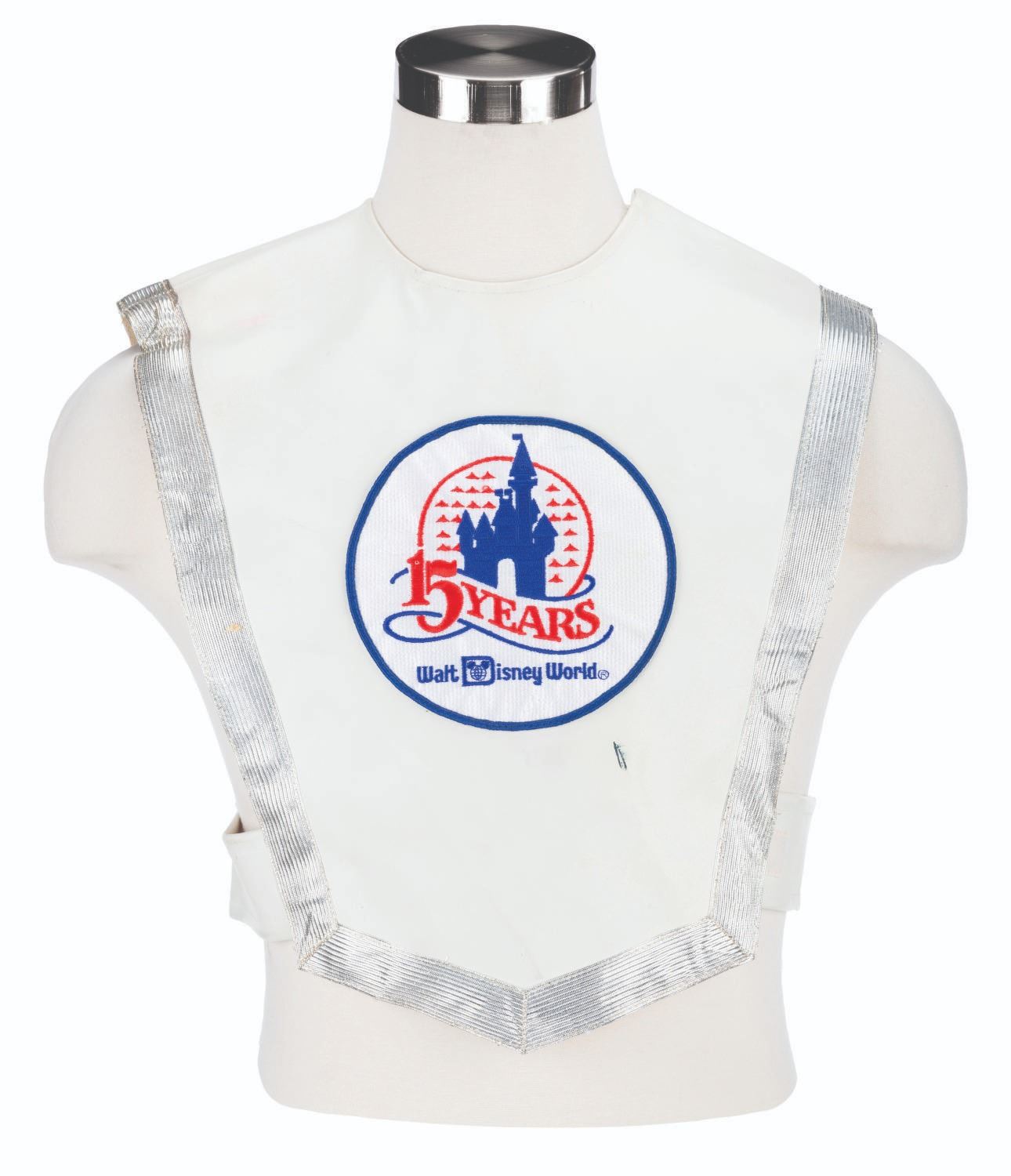 (Walt Disney World, 1986) A vest worn by marching band Cast Members during the Walt Disney World Resort's 15th anniversary celebration. With no size labeled and featuring adjustable side straps, the vest is in good condition with stains and wear from Resort use.