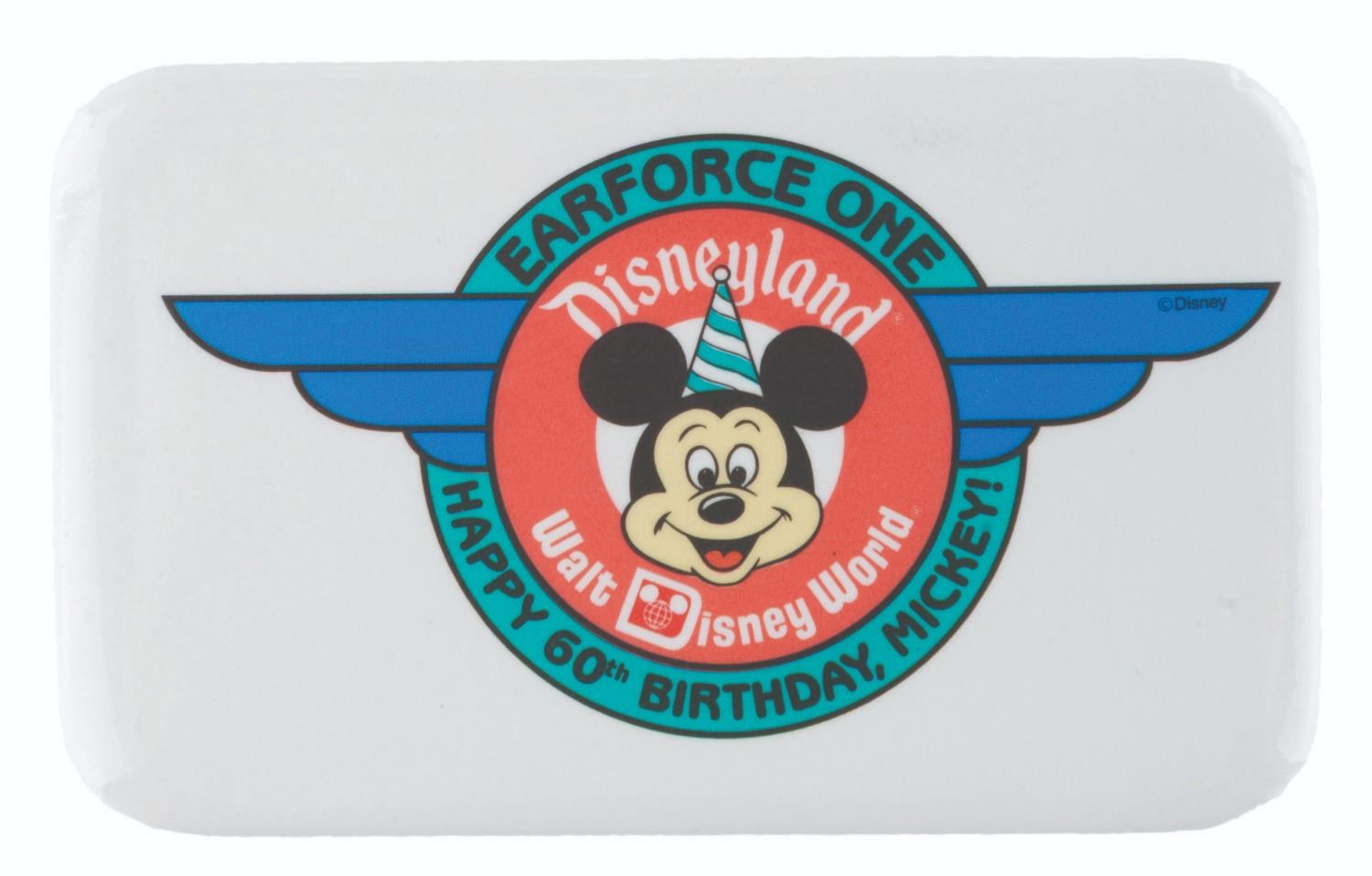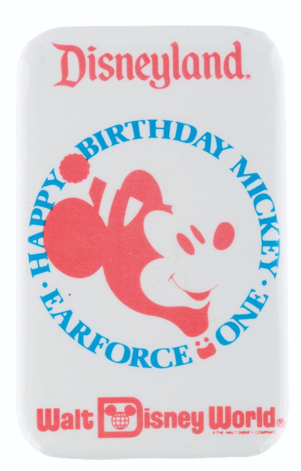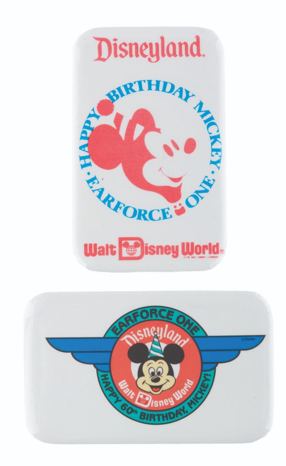 (Disney, 1986/88) A pair of buttons celebrating Earforce One, the Mickey-shaped hot air balloon, from the U.S. Disney Parks. The balloon debuted at Walt Disney World in 1986, and visited Disneyland for Mickey’s 60th birthday in 1988. Each measuring 1.75 " x 2.75 ", the buttons are in very good to fine condition.