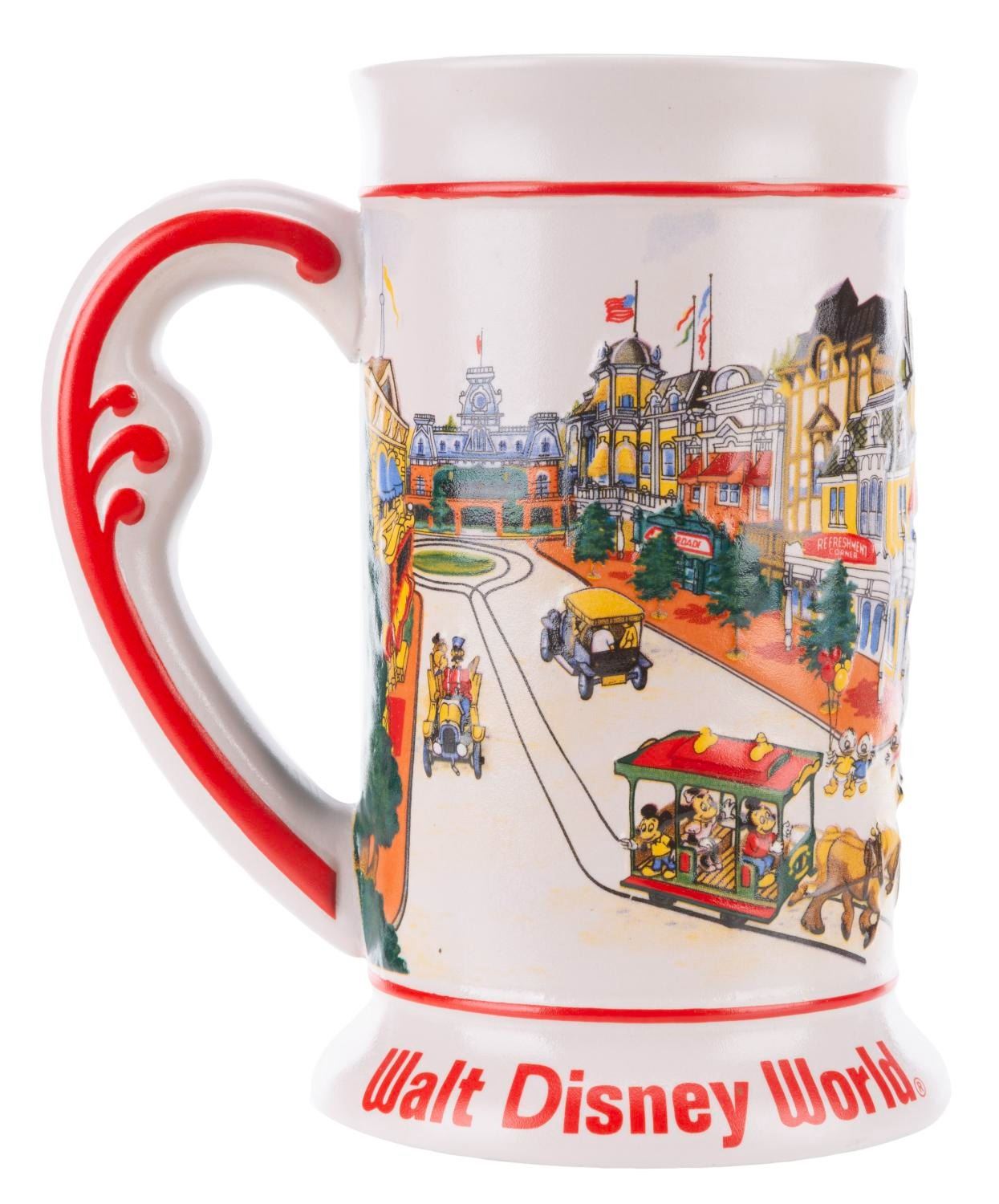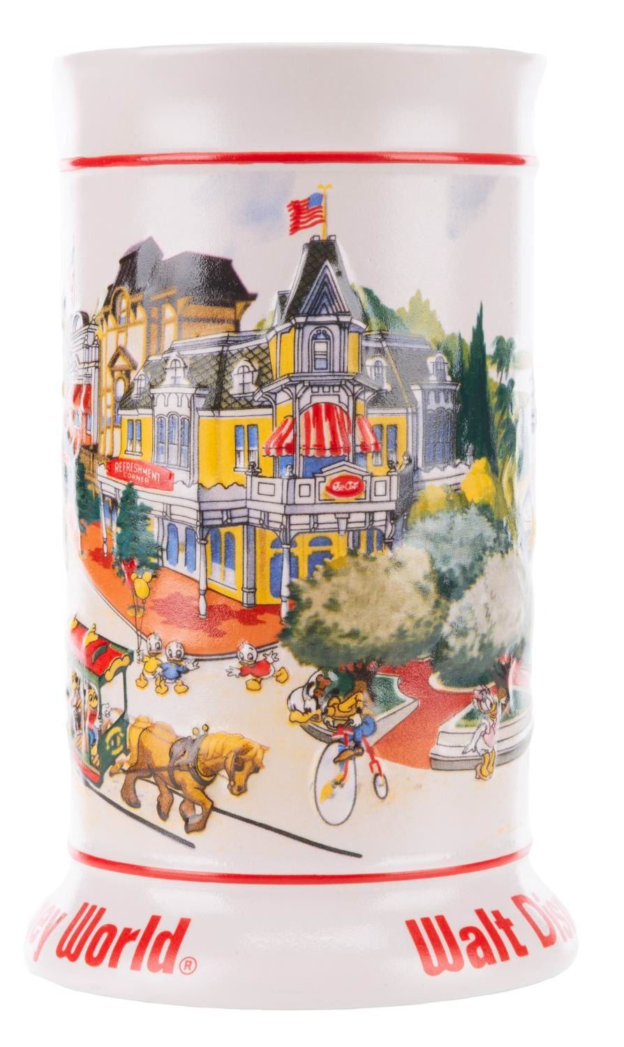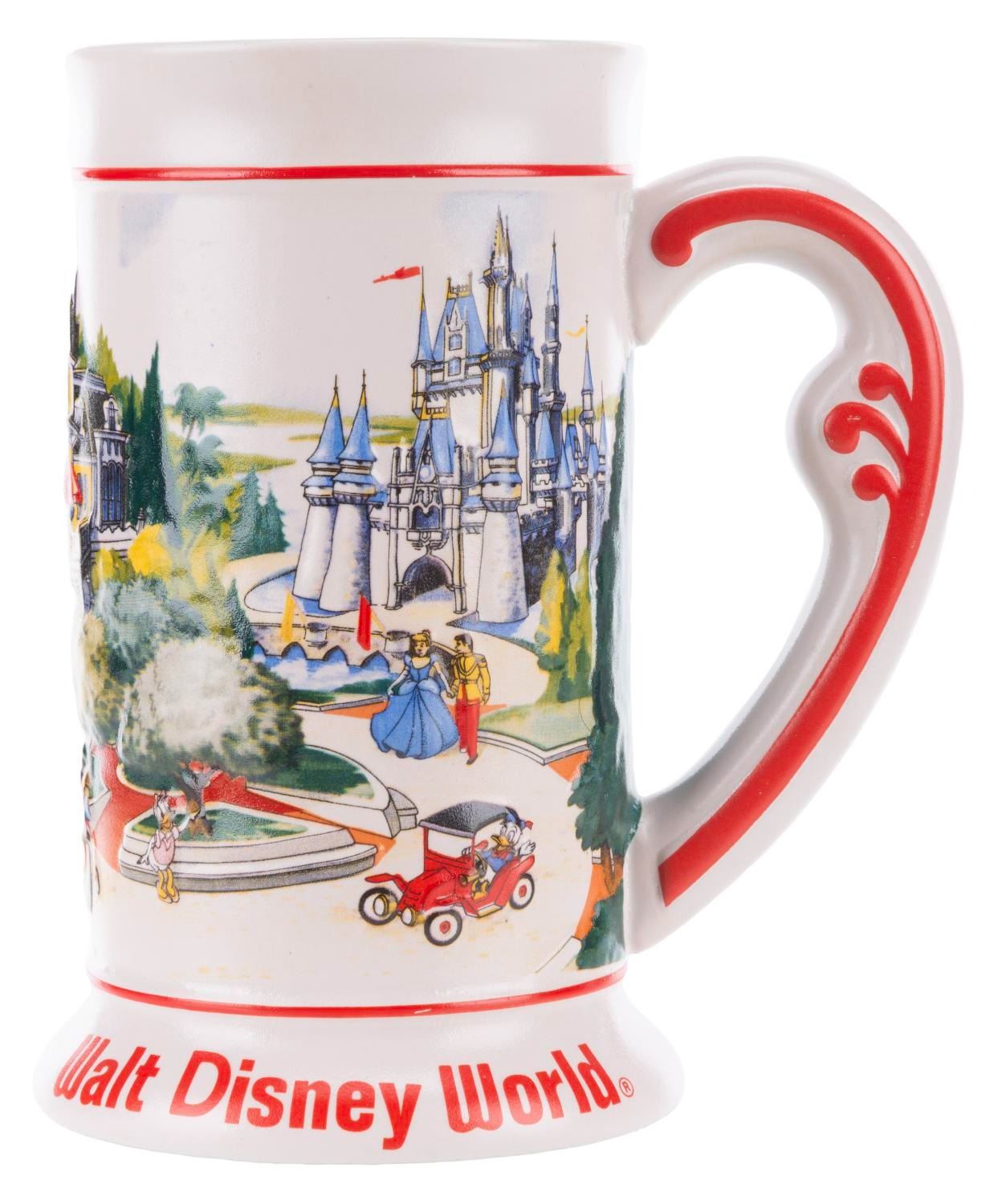(Walt Disney World, 1990s) A souvenir Walt Disney World tankard manufactured by Ceramante of Brazil. During the early 1990s, Ceramante manufactured two styles of mugs intended expressly for distribution at Disneyland and Walt Disney World. Measuring 4 " in diameter and 6.5 " tall, the ceramic stein is in very good condition with spots of discoloration and light wear.