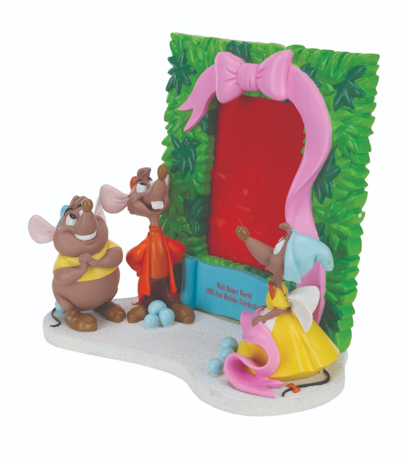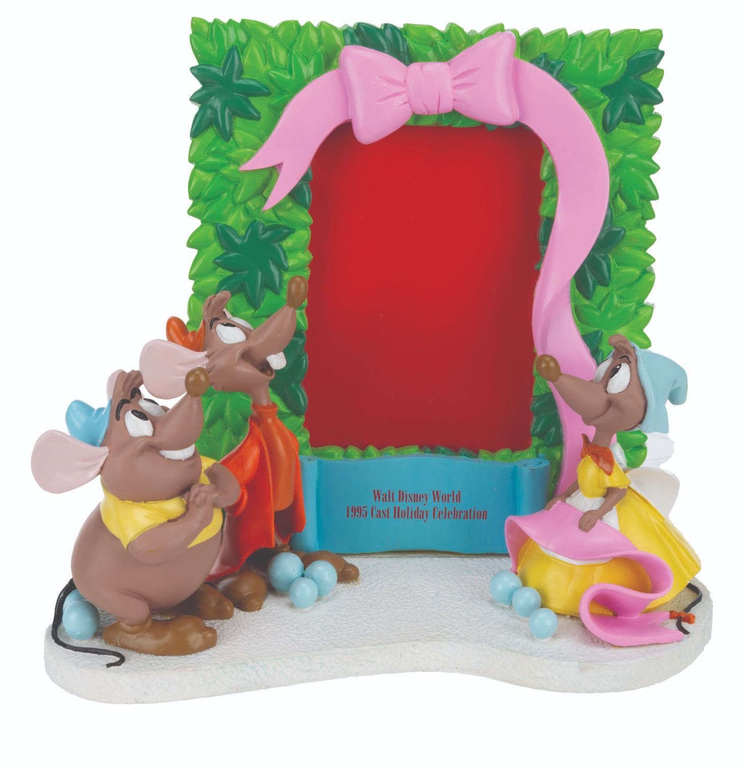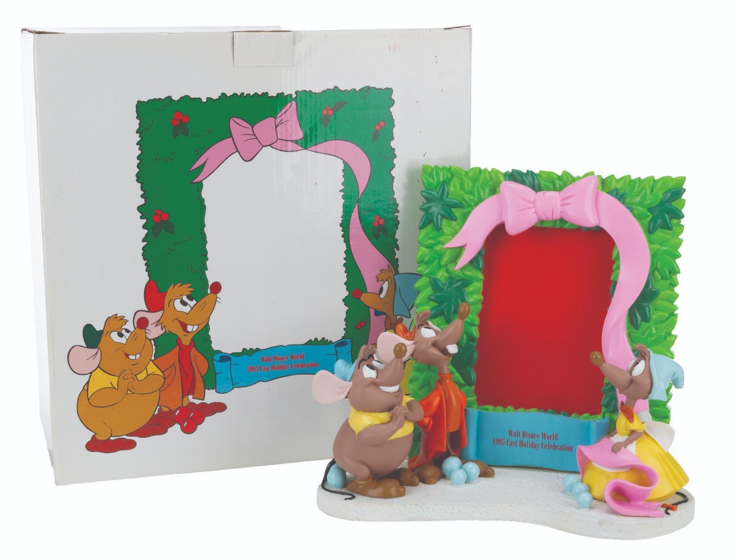 (Walt Disney World, 1995) A "Cinderella " picture frame featuring Gus, Jaq, and a female mouse, available exclusively at the 1995 Walt Disney World Cast Holiday Celebration. Measuring 9.5 " x 4.5 " x 8.5 " tall, the picture frame comes with its original box and is in very good condition with light wear.