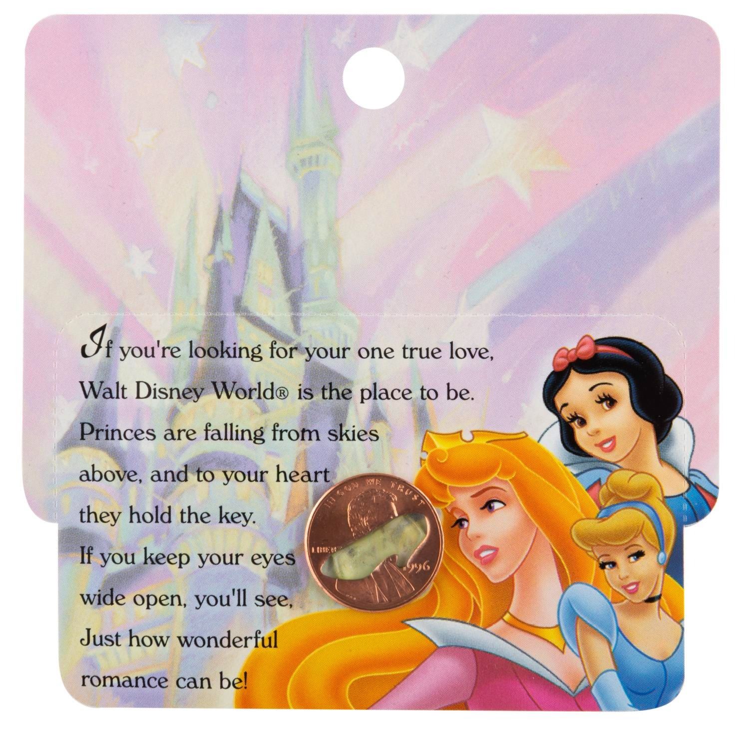 (Walt Disney World, 1990s-2000s) A souvenir 1996 penny with a cut-out "Cinderella " slipper, adhered to its original card. Measuring 0.75 " in diameter, the penny is in fine condition, while the card is in very good condition with light scratches and minor warping.