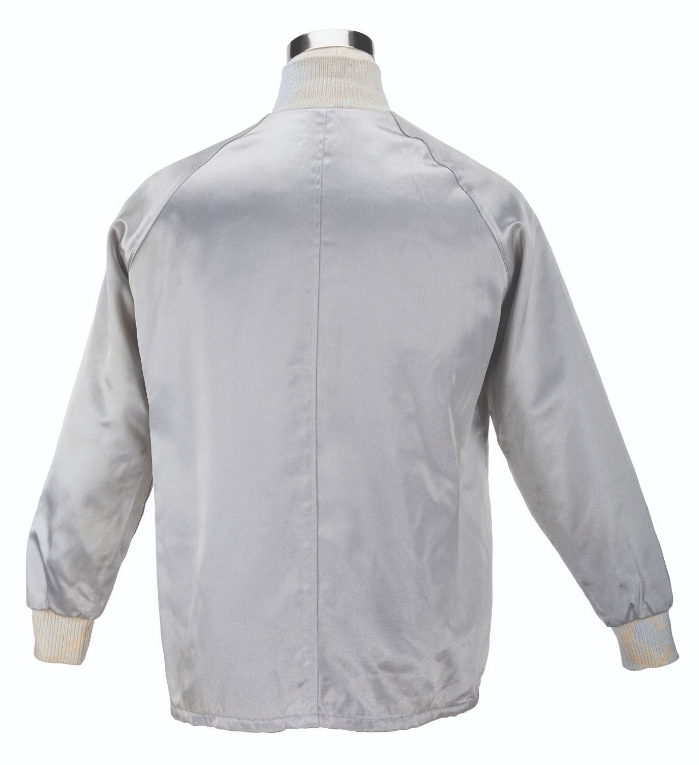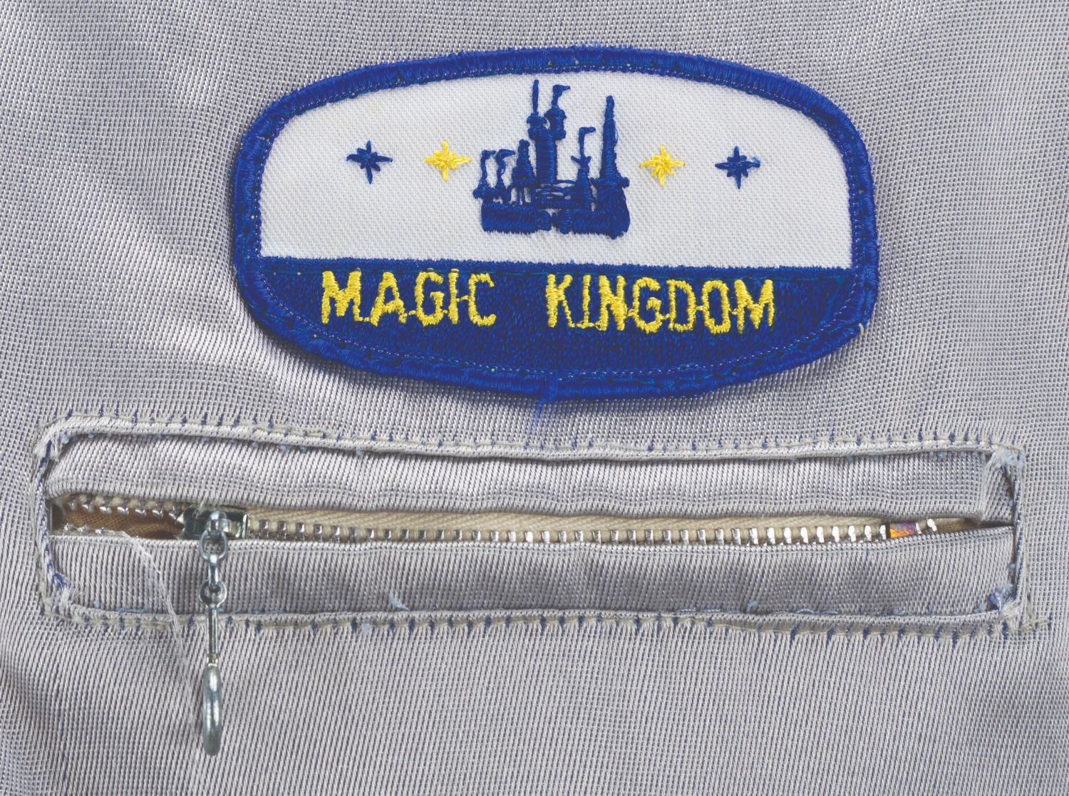 (Walt Disney World, 1970s-90s) A silver jacket worn by Cast Members working at the Magic Kingdom. Labeled a size L, the jacket displays in good condition with light wear and heavy stains on the collar, sleeve trim, and interior.