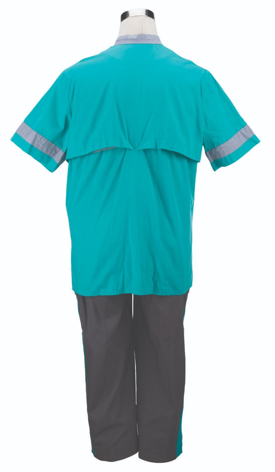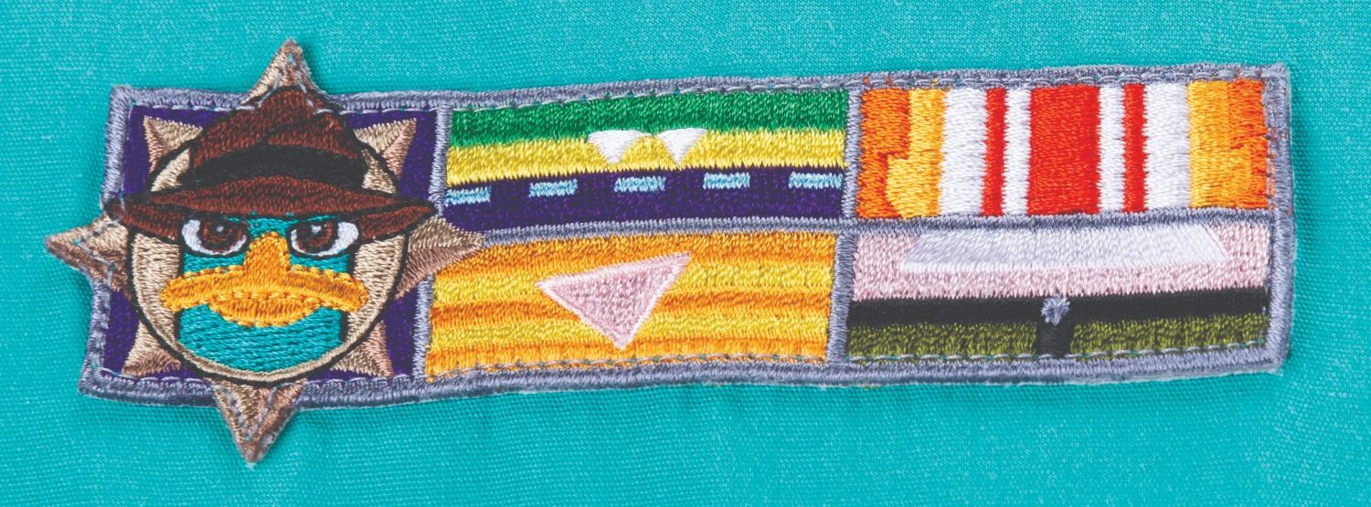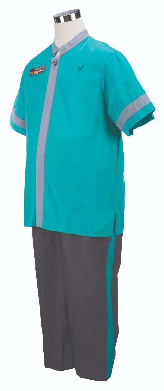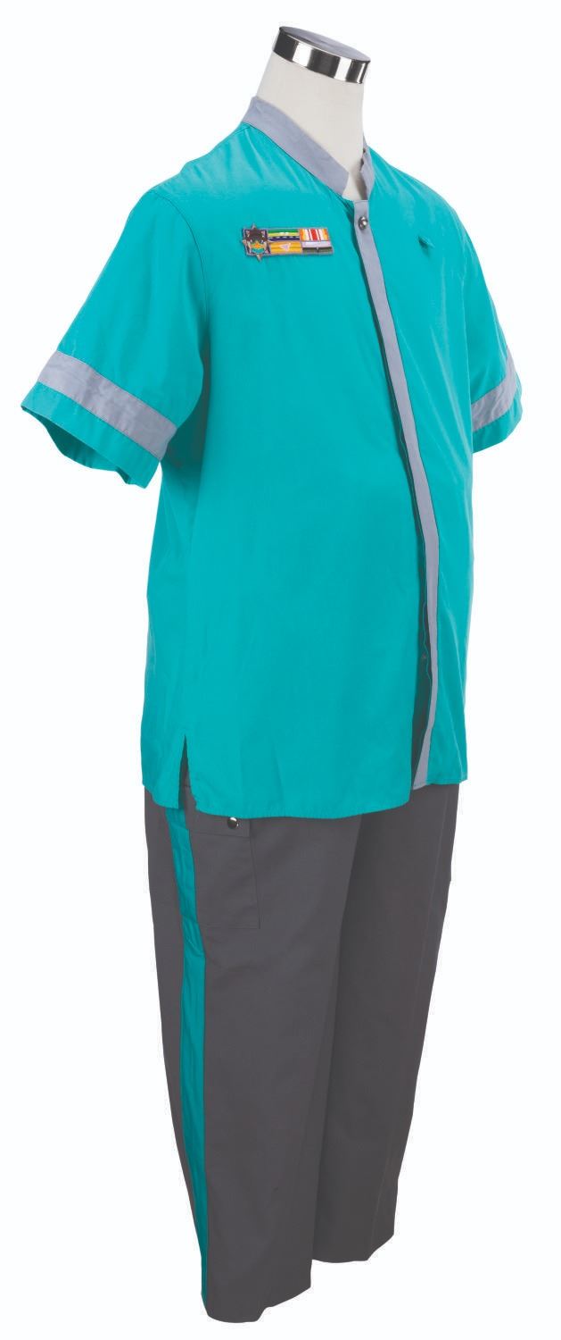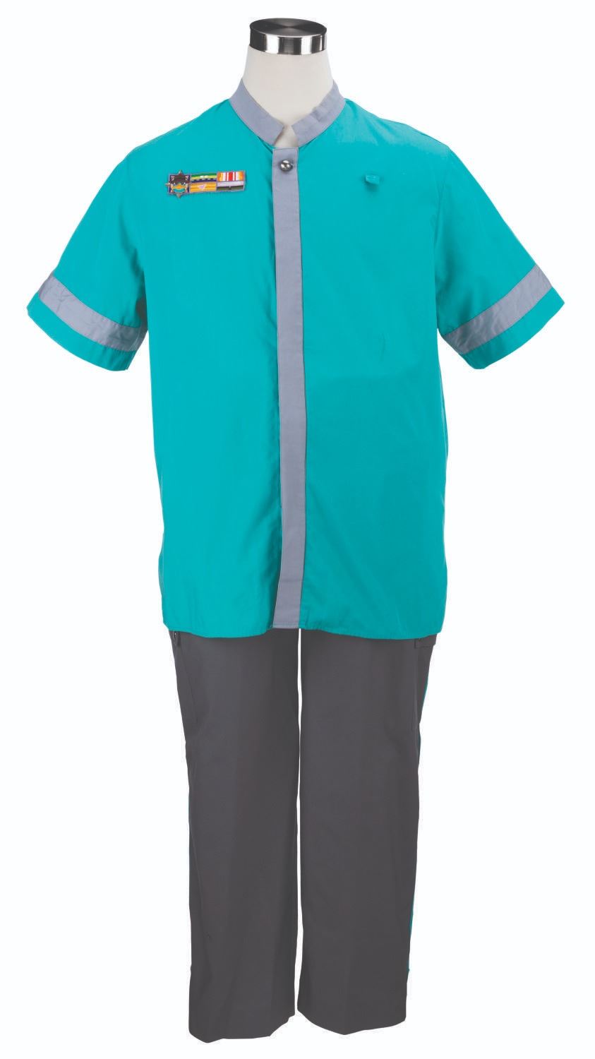 (Epcot, 2012-2020) A uniform shirt and pair of pants worn by Cast Members working the Agent P's World Showcase Adventure interactive attraction starring Perry the Platypus from "Phineas and Ferb. " The shirt is labeled a size XL, and the pants 42/44x28, both displaying in very good condition with pilling, wear from Resort use, a stain on the shirt, and the second button from the top missing.