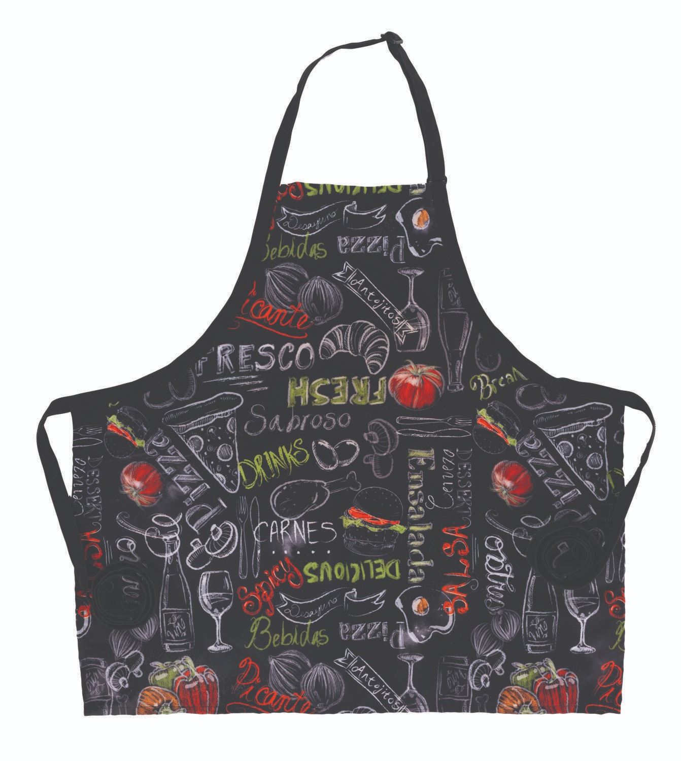 (Disney Parks, 2000s) An apron featuring food, wine, and phrases in Spanish and English, used by Cast Members working food service. Labeled a unisex OSFA, the apron is in very good condition with light wear from Park use.