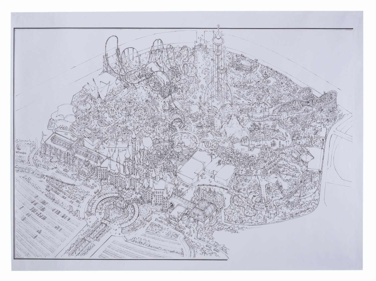 (Legacy Entertainment, 2009) A large concept art map print for the Hot Go Dreamworld theme park in Fuchun, China. With elements such as a Shanghai Disneyland castle clone, the map shows a hugely ambitious layout, but the Park itself remains unopened, under construction since 2015. Measuring 36 " x 50 ", the print is in good condition overall with some minor creasing and handling wear from use.