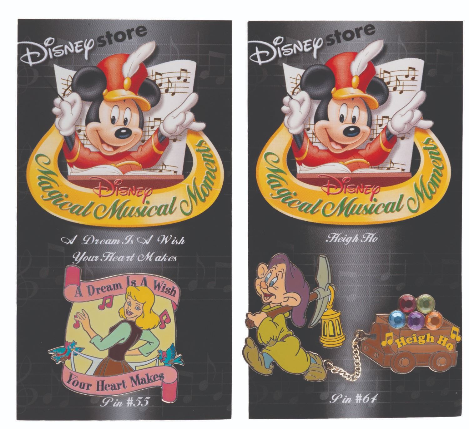 (Disney Store, 2002) A pair of Disney Magical Musical Moments pins, including "A Dream Is A Wish Your Heart Makes " featuring Cinderella and "Heigh Ho " featuring Dopey, pins #55 and #64 in the series. The pins are on their original cards and in fine condition.