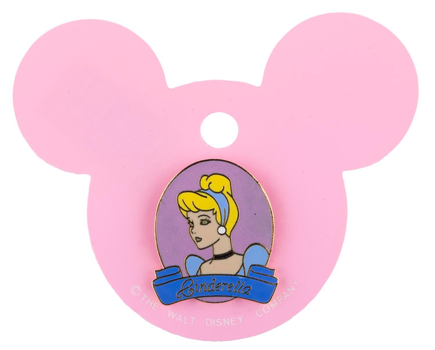 (Disney, 1990s) A Cinderella pin on the original card. The pin is in very good condition with slight manufacturing, enamel defects.