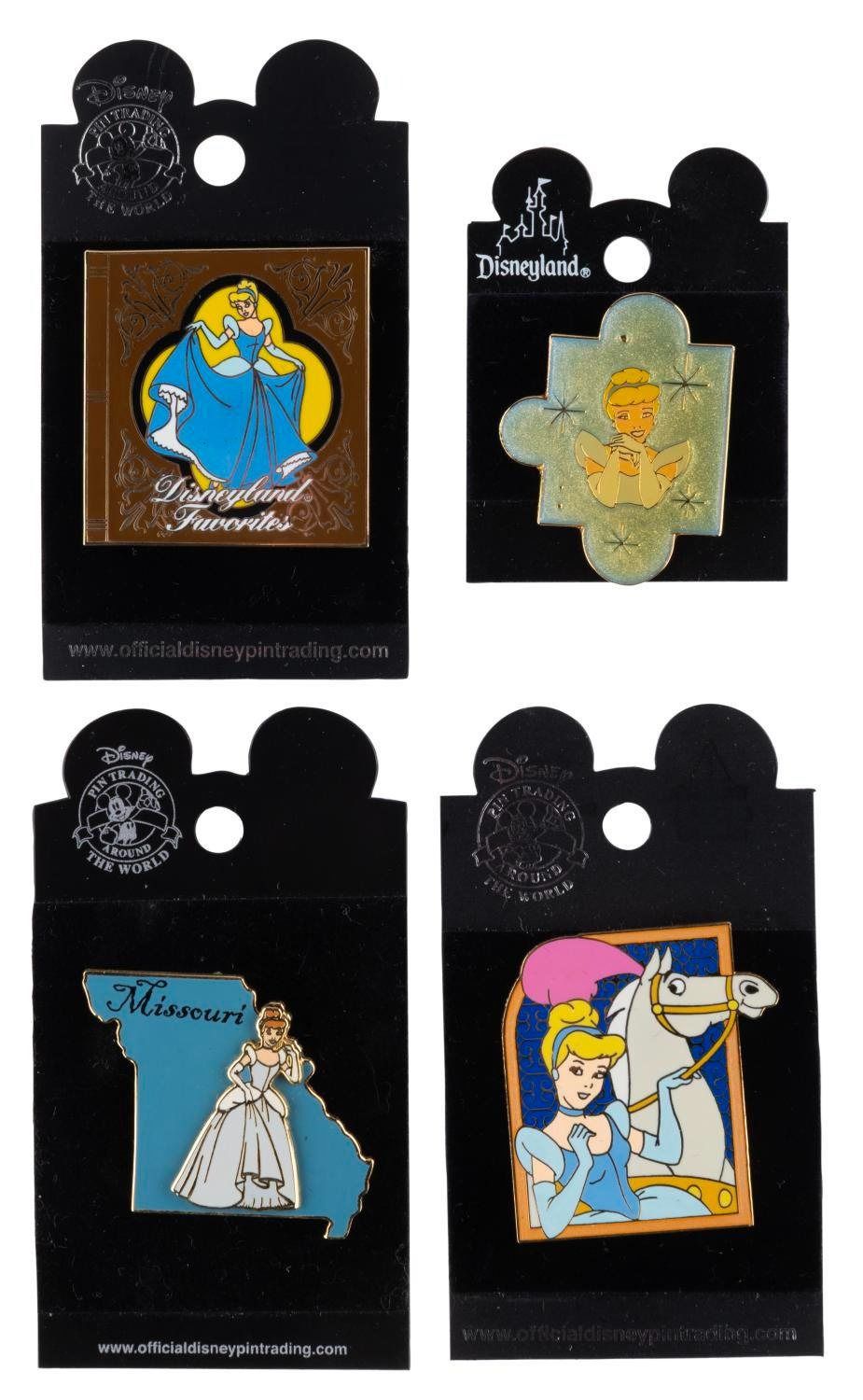(Disney, 2000s) A collection of four "Cinderella " pins, including Cinderella with the state of Missouri, a puzzle piece, a horse, and on a storybook titled "Disneyland Favorites. " The pins are all in fine condition on their original cards.