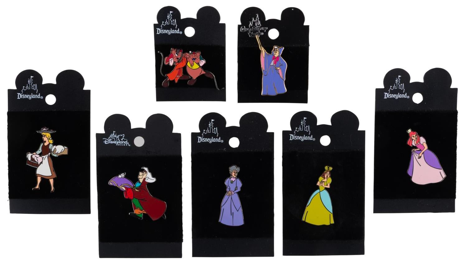 (Disney, 2000s) A set of seven "Cinderella " character pins featuring Cinderella in rags, Drizella, Anastasia, the Fairy Godmother, Gus and Jaq, the Herald, and Lady Tremaine. The pins are all in fine condition on their original cards.