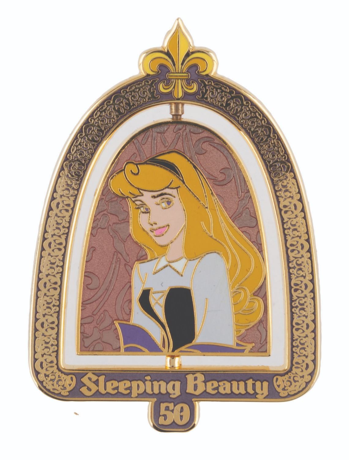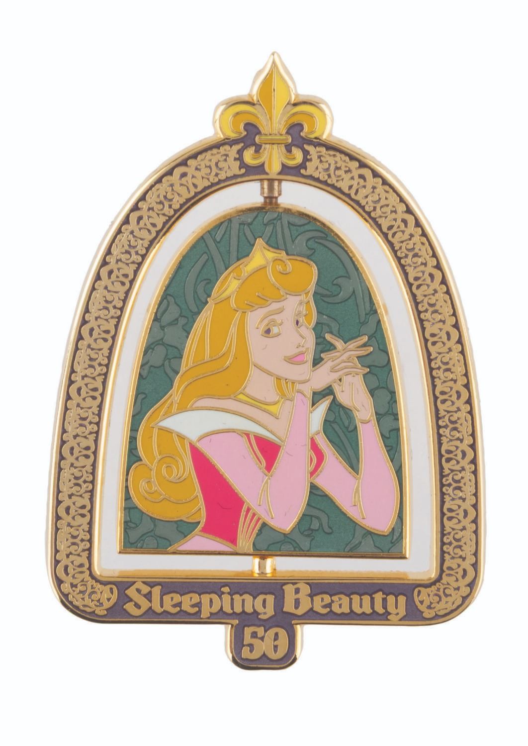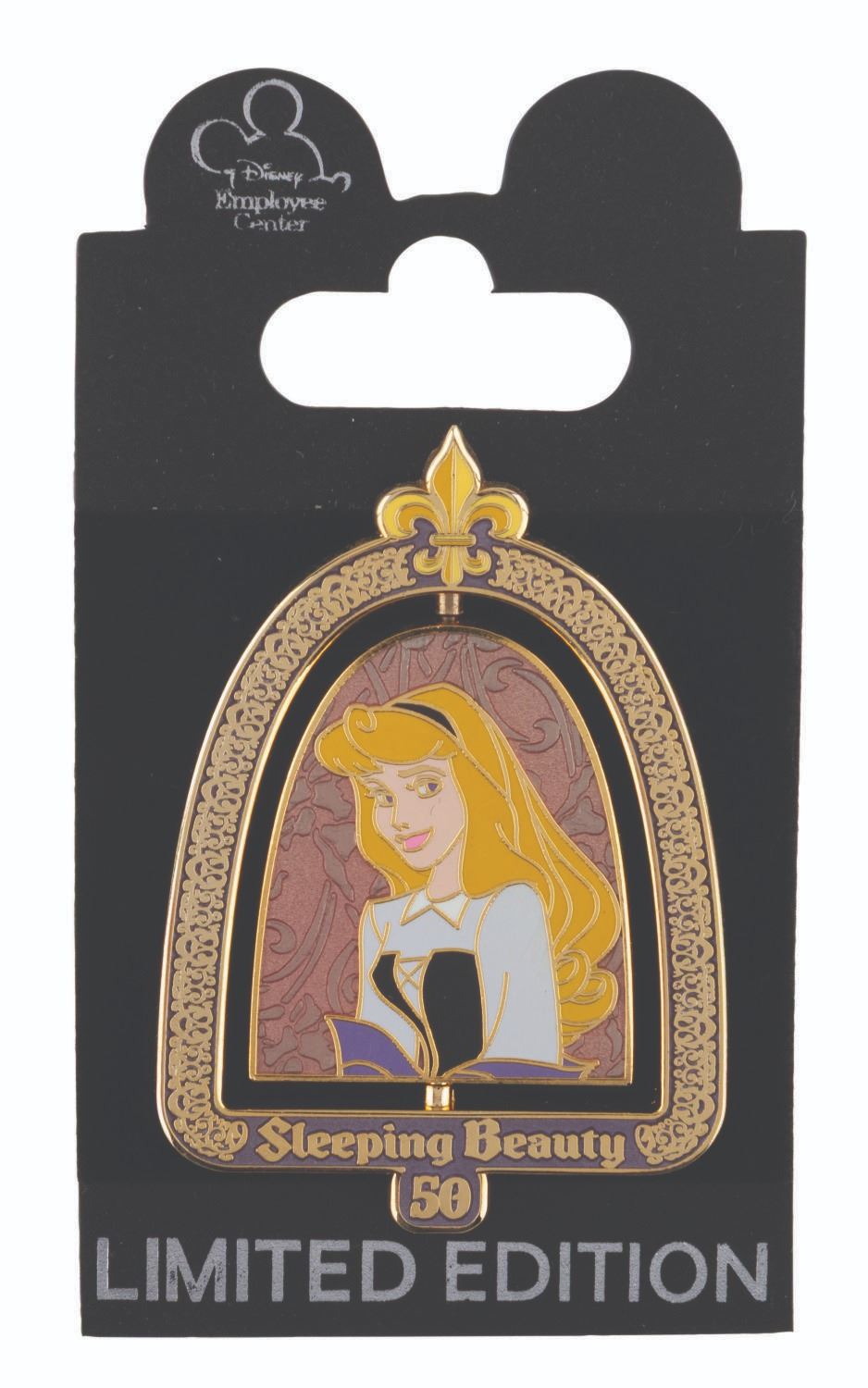 (Disney, 2009) A "Sleeping Beauty " spinner pin, with Briar Rose on one side and Princess Aurora on the other. The pin was released in a limited edition of 300 for the film's 50th anniversary and is in fine condition on its original card.