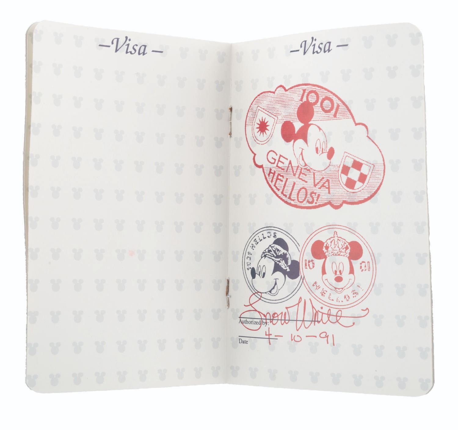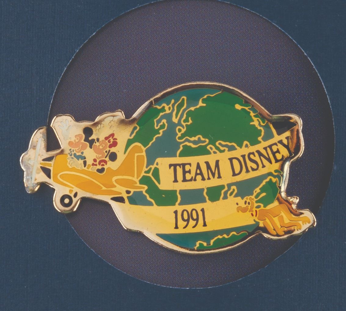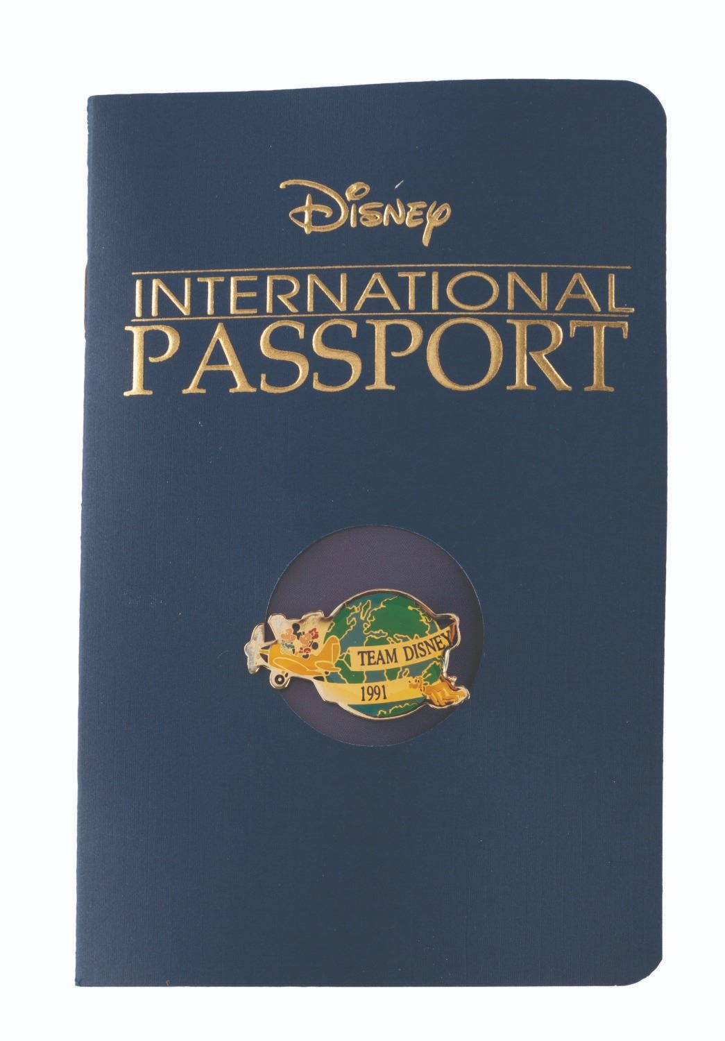 (Disney, 1991) A Disney Cast Member "Team Disney 1991 " pin with passport booklet, given to Cast Members who attended the Disney Studio employee forum on April 10, 1991. The pin and passport book are in very good condition, with some warping to the book and color shift to the pin, both from age.