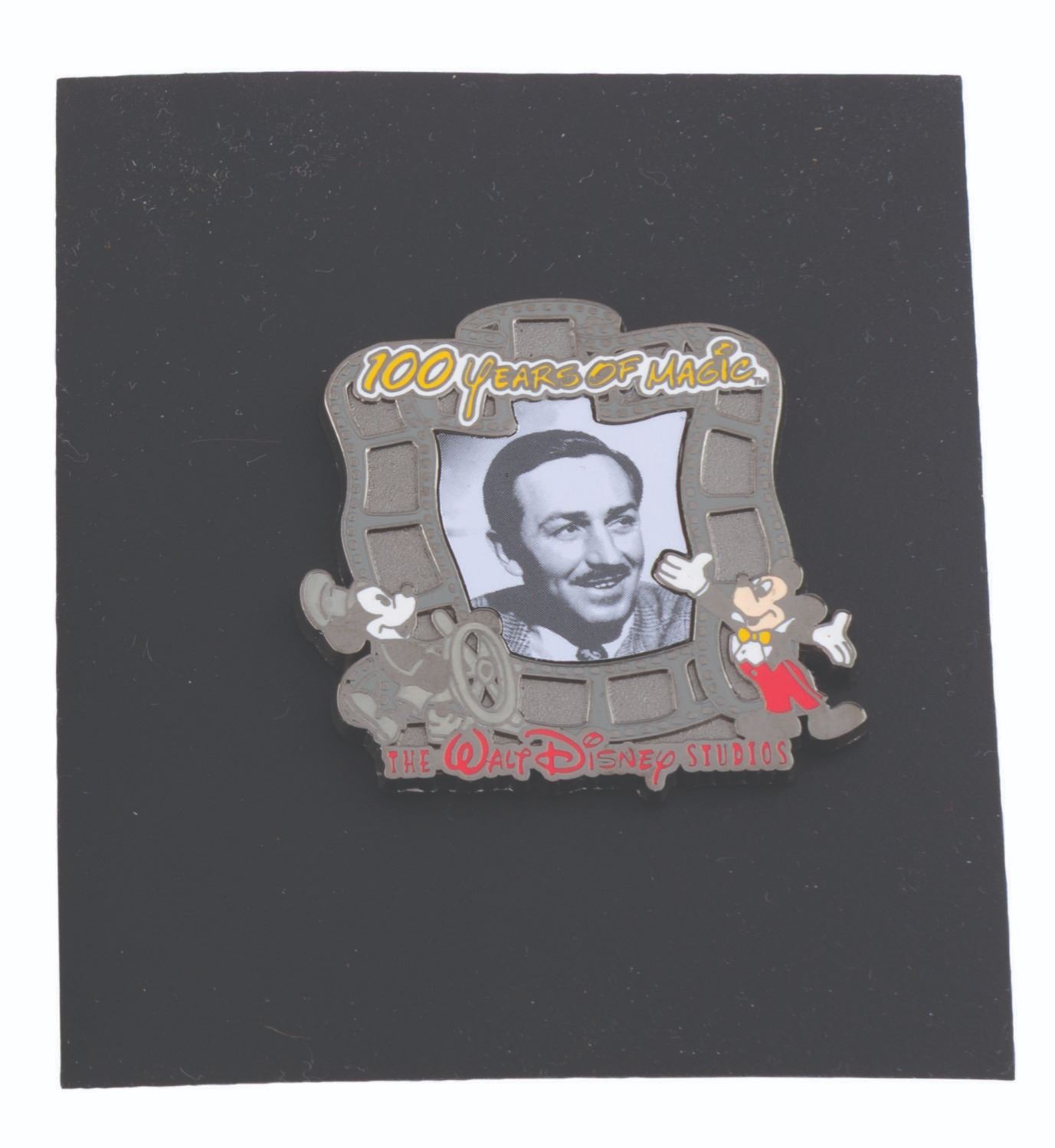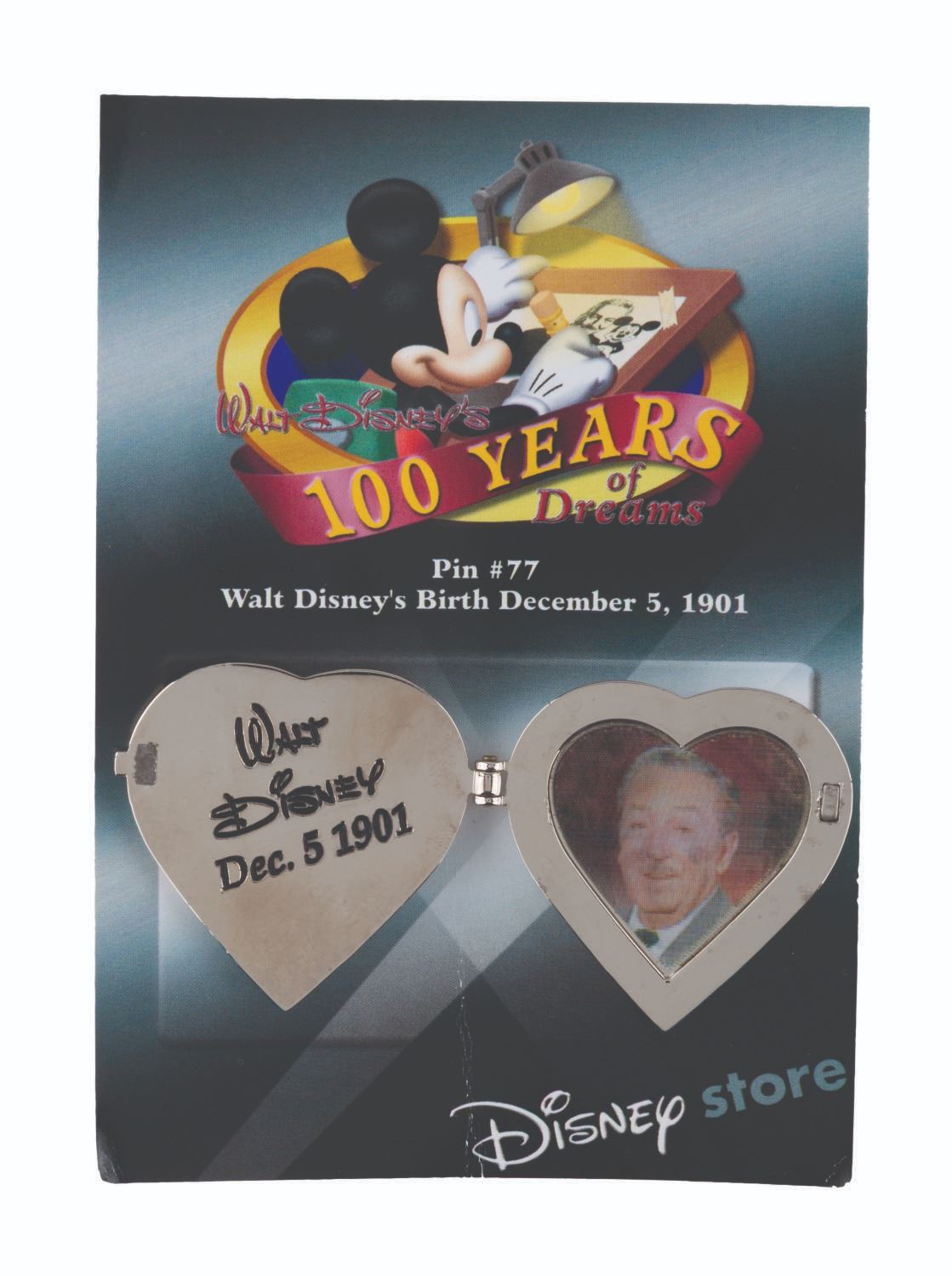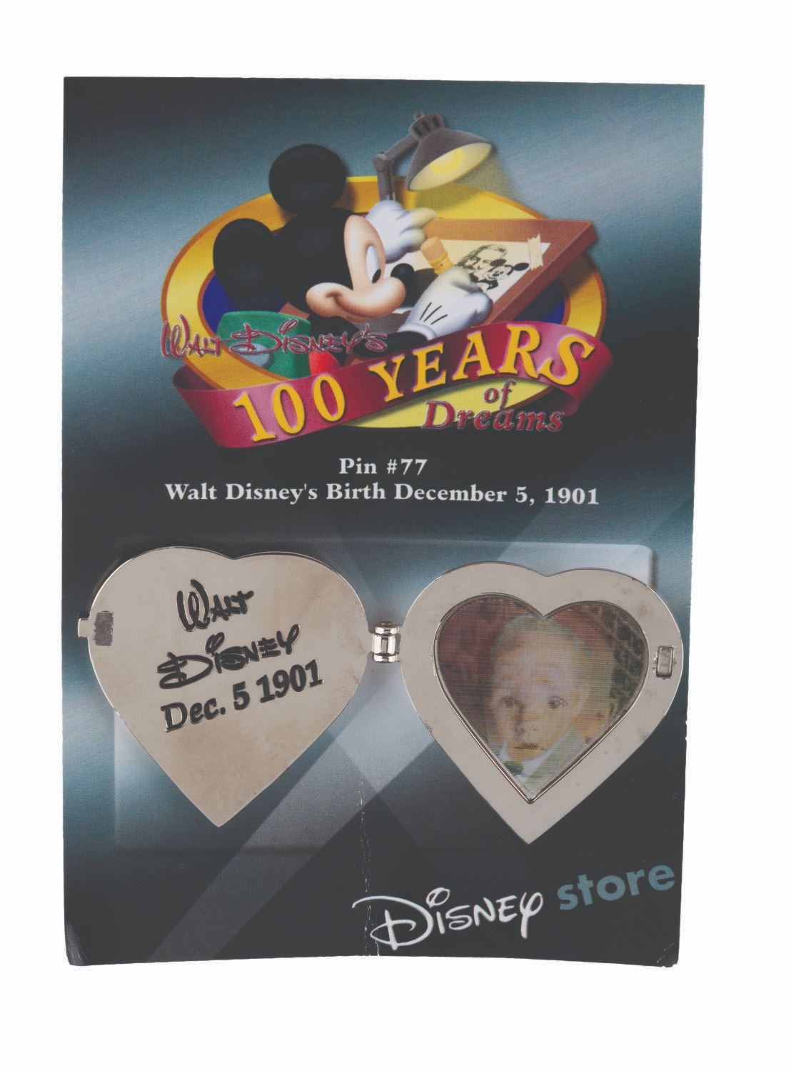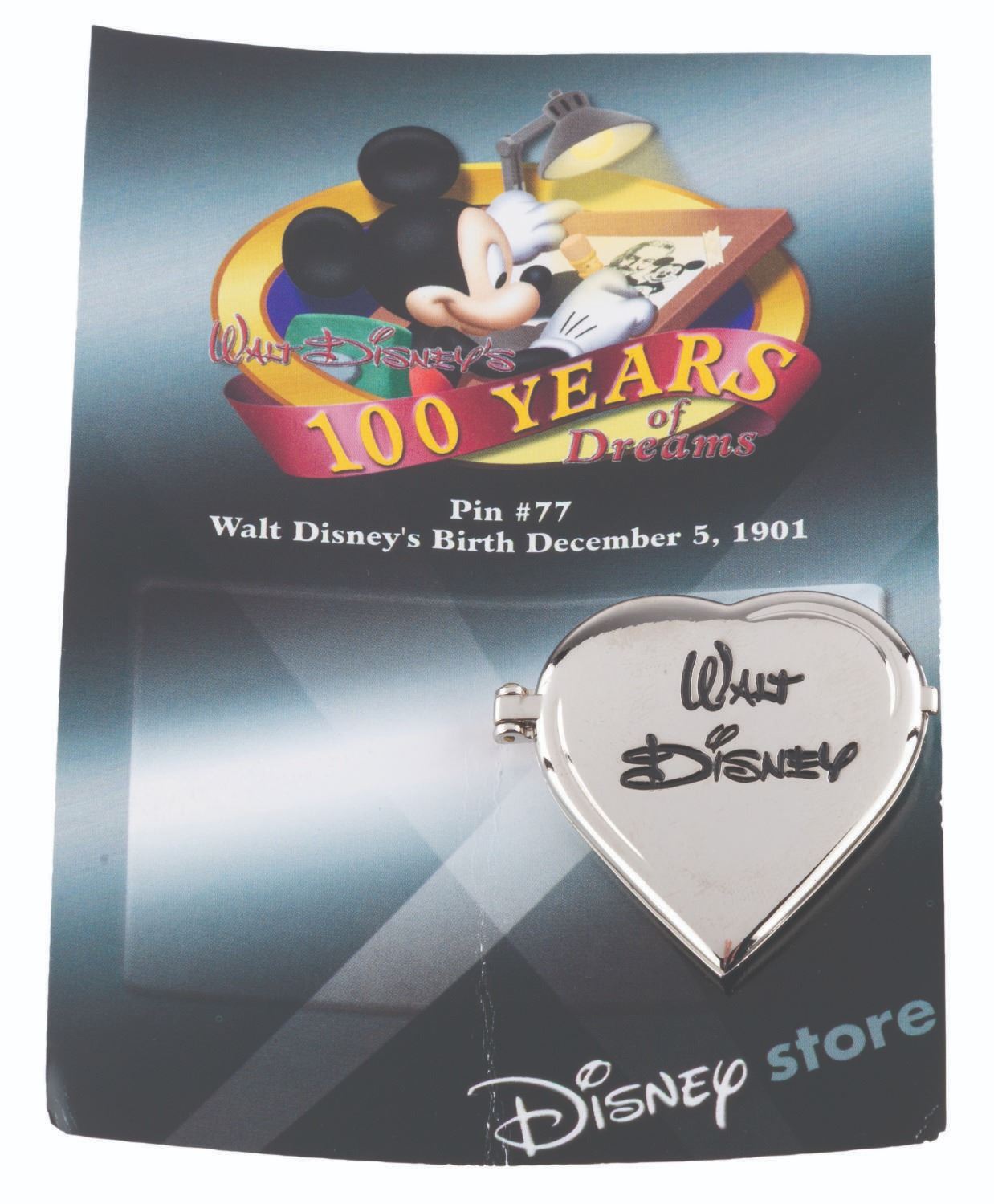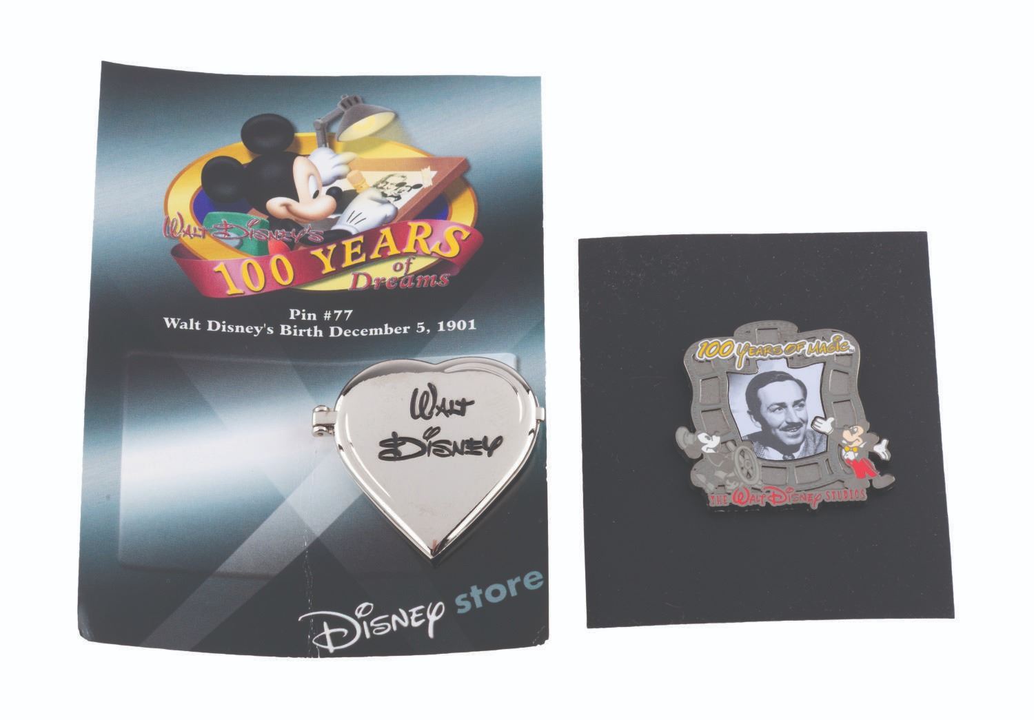 (Disney, 2001) A 100 Years of Dreams Walt Disney heart locket pin and 100 Years of Magic Walt Disney Studios pin, the latter a Cast Member exclusive released in a limited edition of 300. The pins are on their original cards and are in very good to fine condition with light wear.