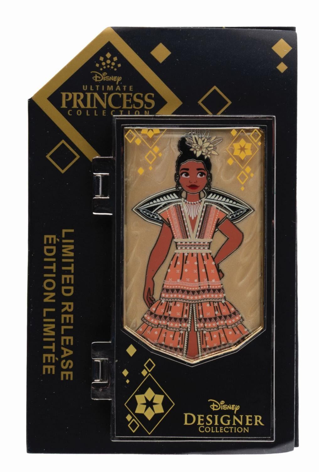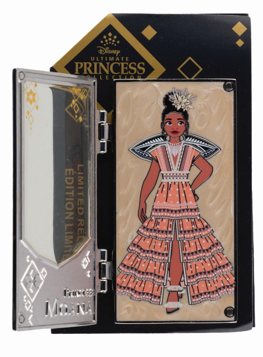 (Disney, 2022) A limited release pin inspired by the Disney Ultimate Princess Moana doll. The hinged front panel opens to reveal the full Moana inside, and the card highlights designer Nontra Null. Measuring 1.75 " x 3 " the pin is in fine condition on the original card.