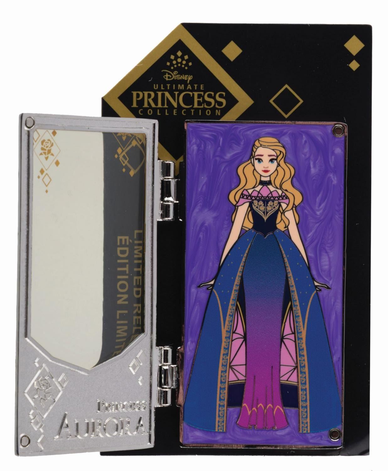 (Disney, 2022) A limited release pin inspired by the Disney Ultimate Princess Aurora doll. The hinged front panel opens to reveal the full Aurora, and the card highlights designer Victoria Hamilton. Measuring 1.75 " x 3 " the pin is in fine condition on the original card.
