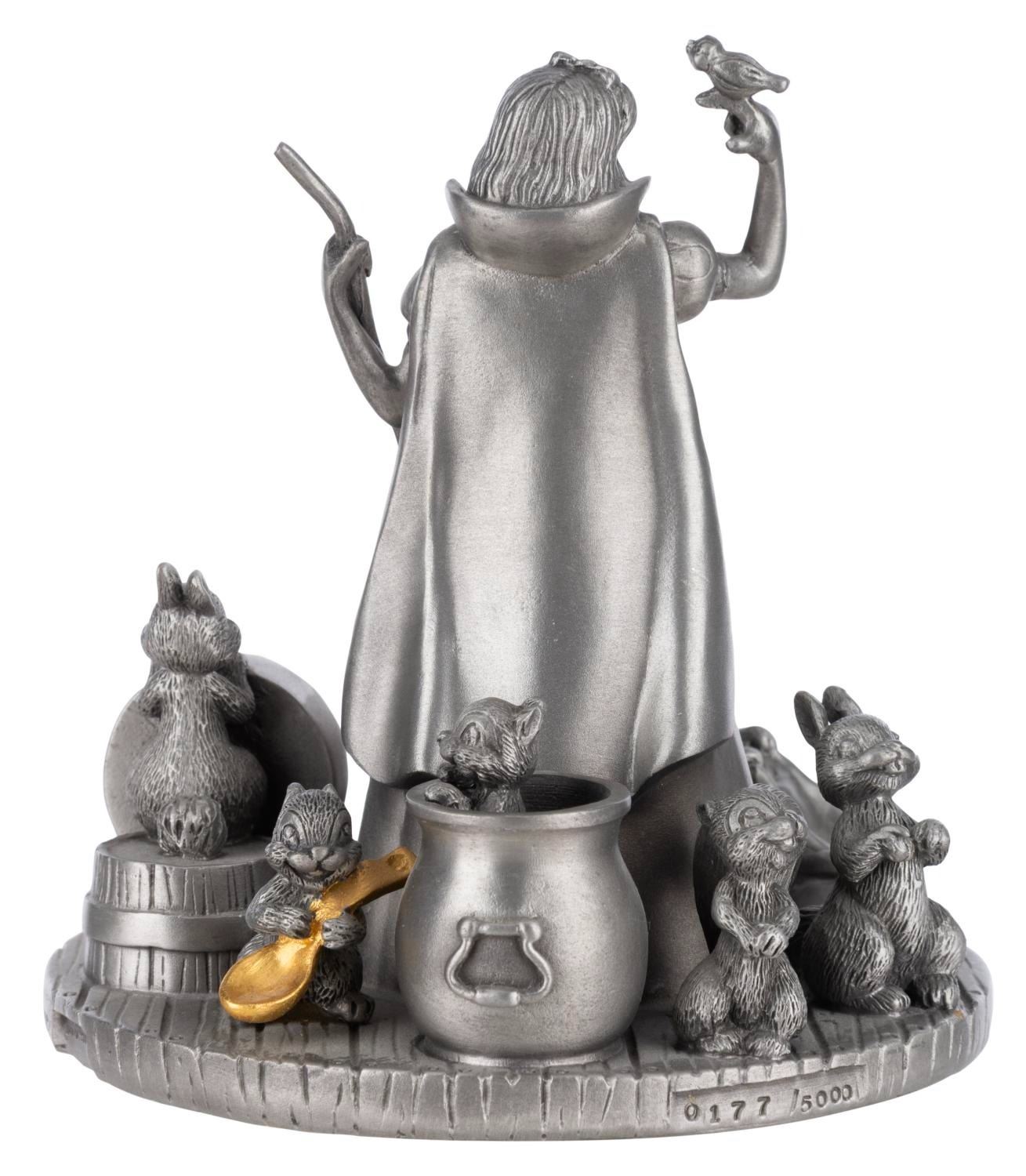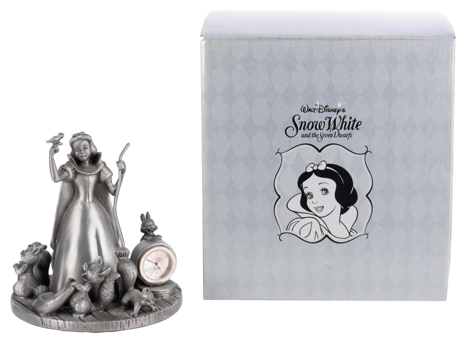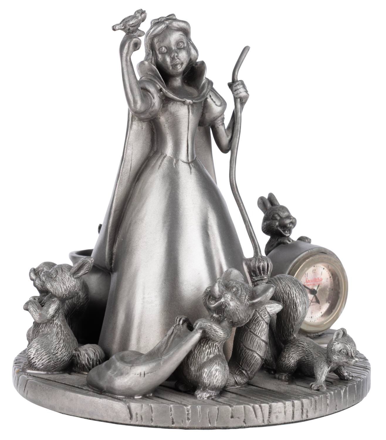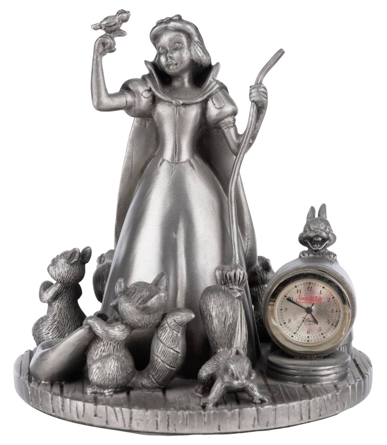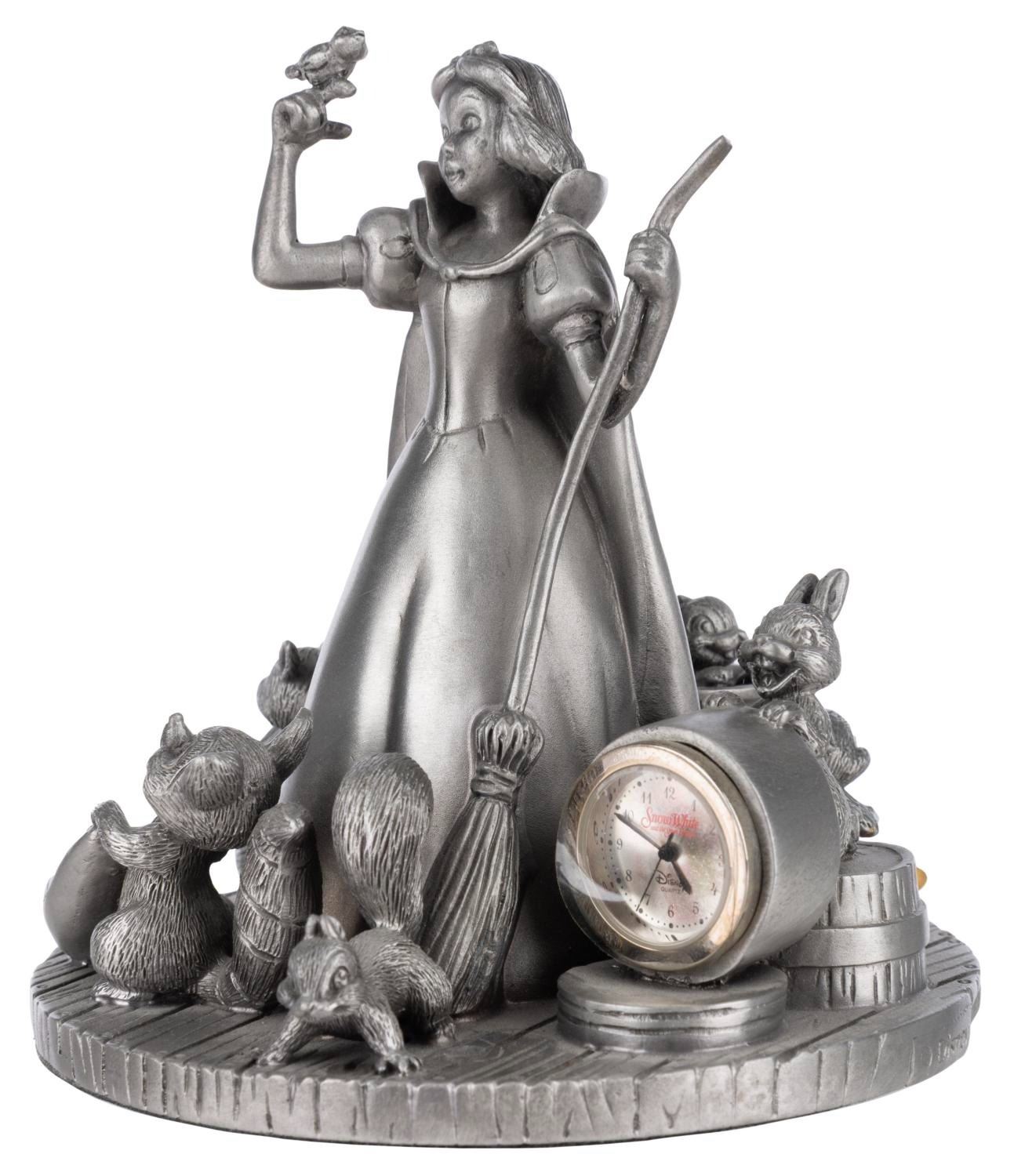 (Disney Parks, 1990s) A pewter figurine of Snow White and her forest friends, with a built-in quartz clock. Measuring 4.25 " in diameter x 4.5 " high, the piece is in fine as-new condition, with the clock requiring a battery and possibly service to function.