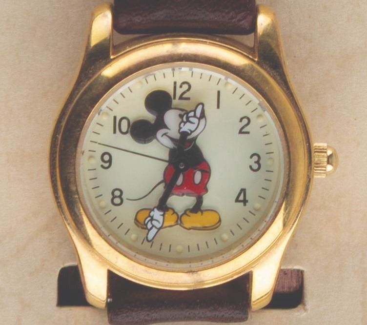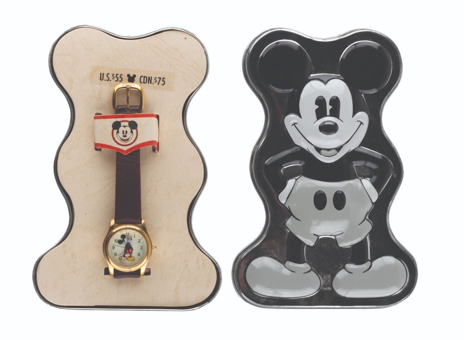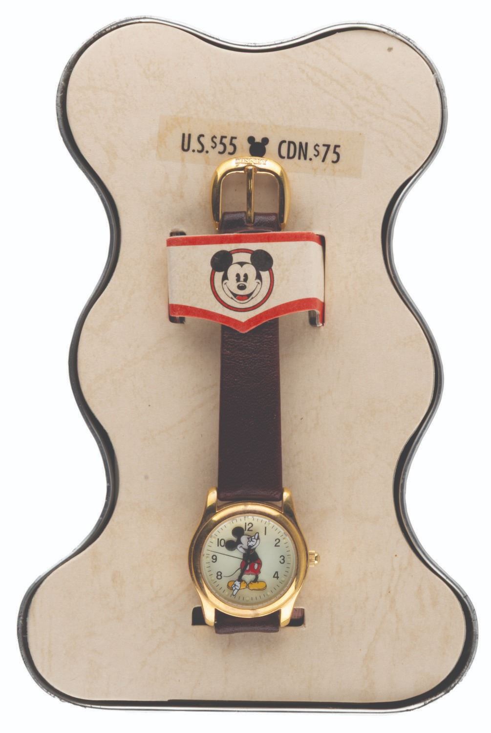 (Disney Store, 1990s) A Mickey Mouse ladies' watch in a character tin. The watch has Mickey Mouse on the face, with his arms as the clock’s hands. The watch is in good used condition, requiring a new battery and strap to function, and possibly service.