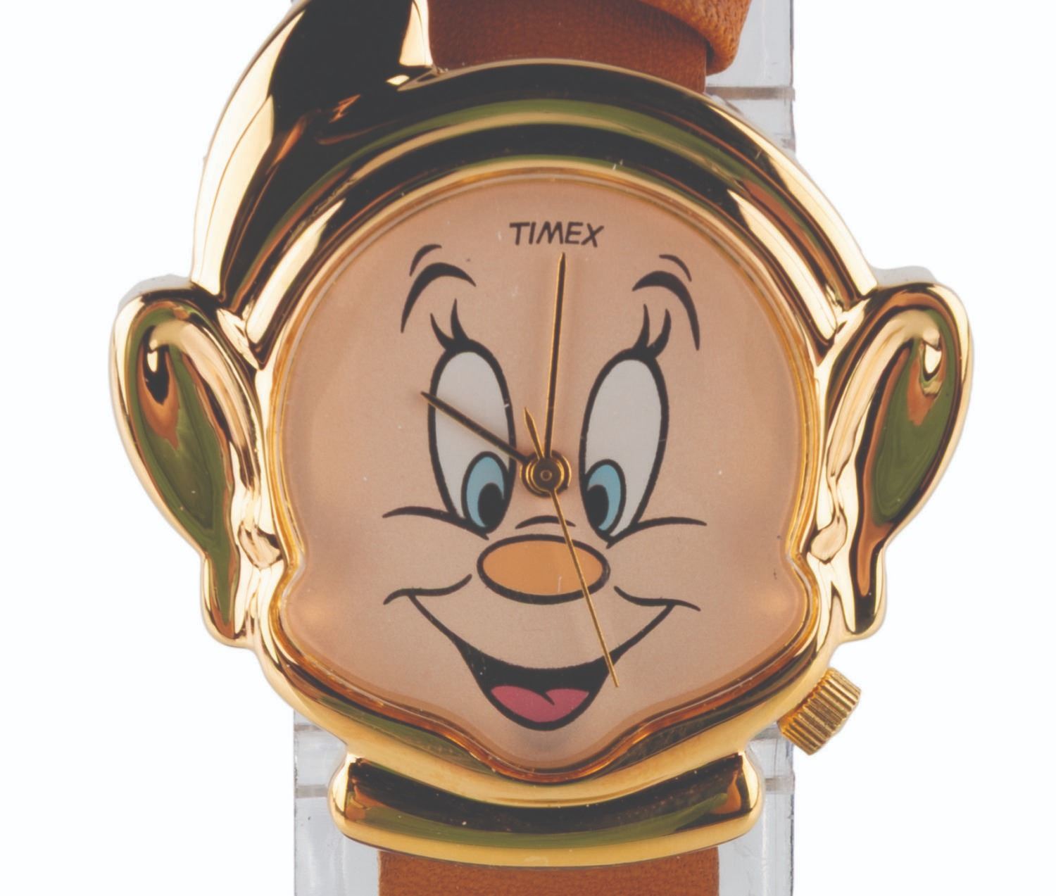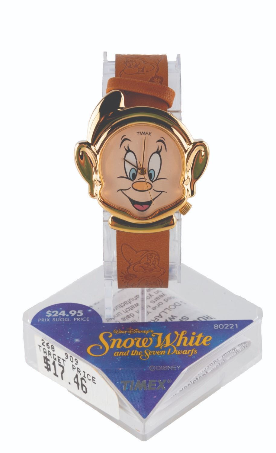 (Lorus, 1990s) A "Snow White " wristwatch featuring Dopey for the face and the Dwarfs embossed along the leather band. Measuring 1.5 " in diameter on an 8.25 " band, the watch is in fine, as-new condition with the original box, requiring a battery and possibly service to function. The box exhibits heavy creasing and edge wear.