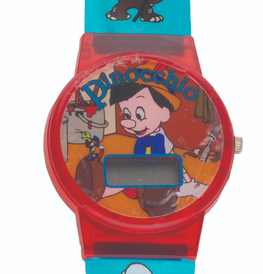 (Disney, 1990s) A "Pinocchio " digital watch, with images of characters from the film on the watch face and band. The watch is in very good unused condition, requiring a battery and possibly service to function.