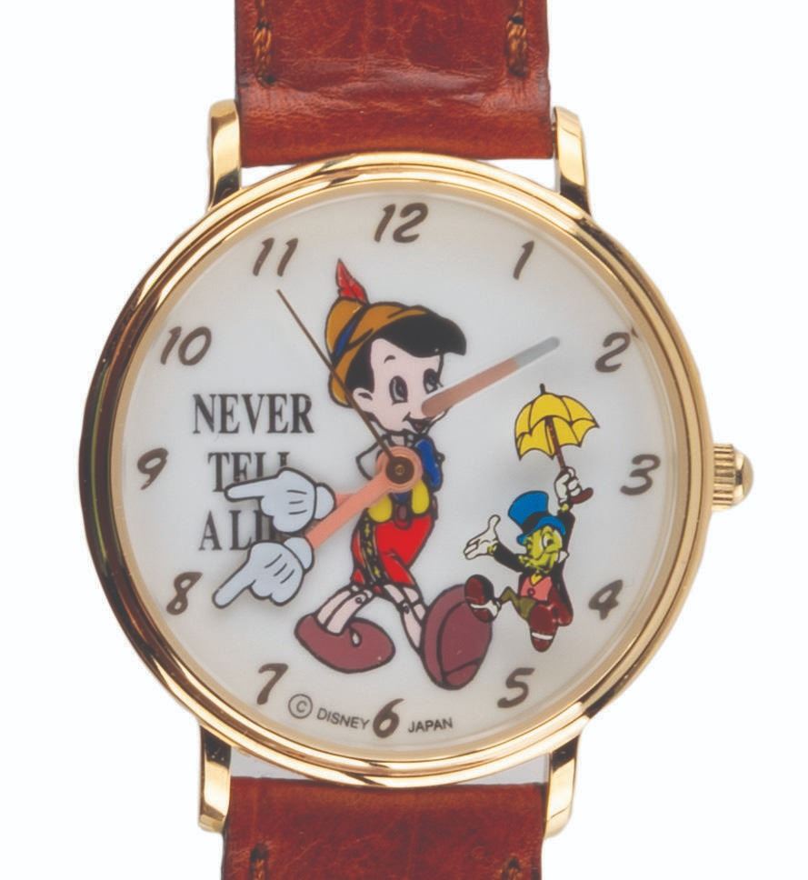 (Disney Store, 1990s) A "Pinocchio " wristwatch featuring Pinocchio and Jiminy Cricket. Measuring 1.25 " in diameter with a 9 " band, the watch is in fine, as-new condition in the original packaging, requiring a battery and possibly service to function. The original packaging exhibits light wear from handling and age.