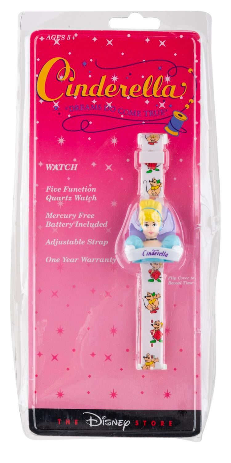 (Disney Store, 1990s) A children’s "Cinderella " wristwatch with a protective Cinderella cover over the face. Measuring 1.5 " x 7.5 ", the watch is in fine, as-new condition sealed in the original packaging, requiring a battery and possibly service to function. The original packaging exhibits heavy wear, including creasing and crushing.