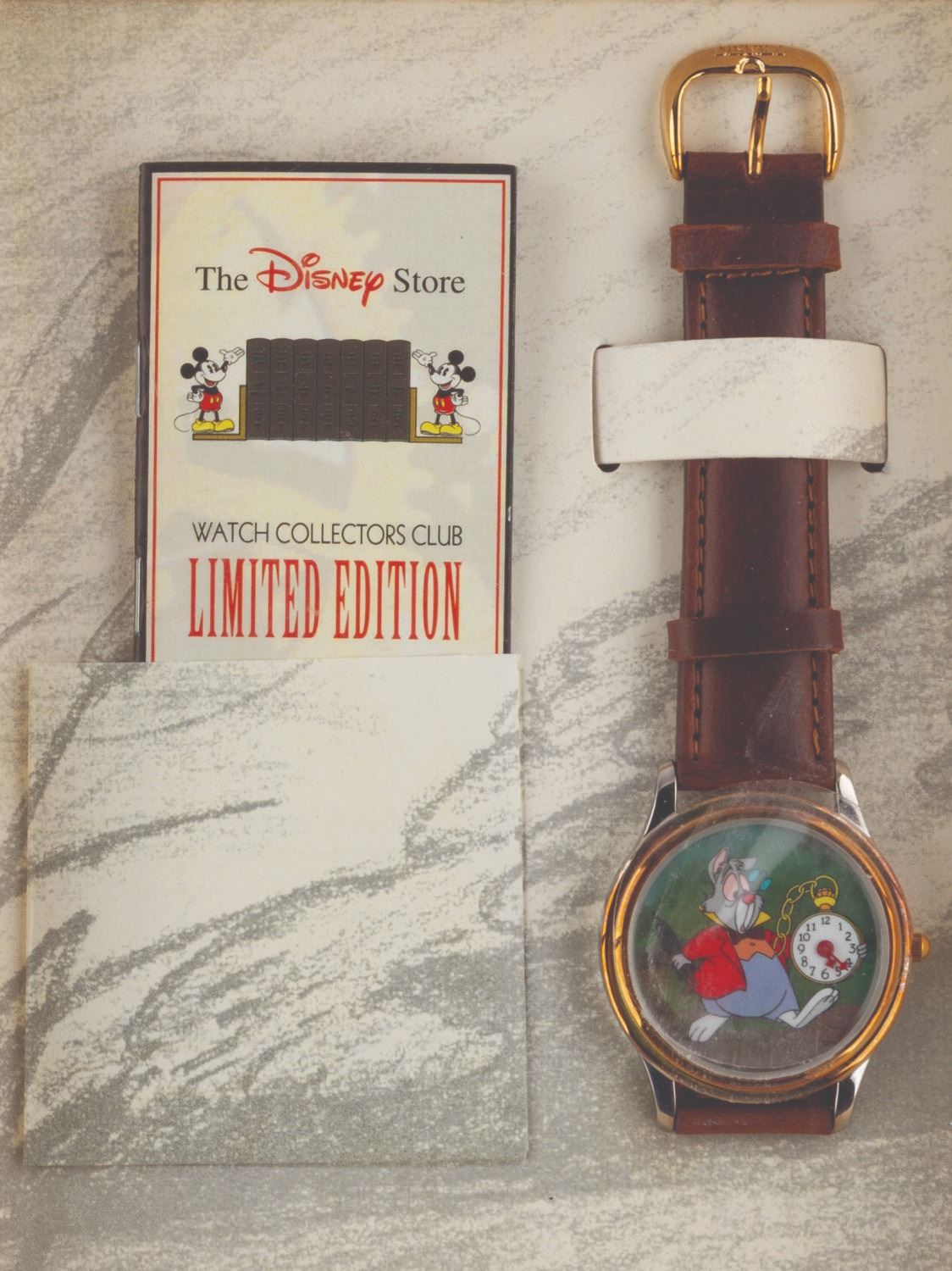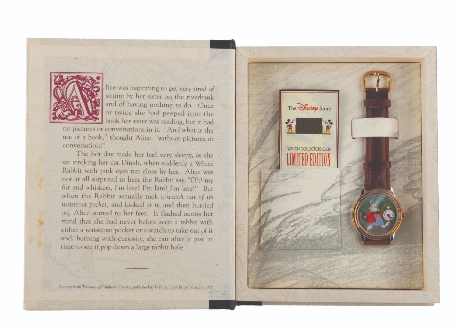 (Disney Store, 1993) A Watch Collector's Club, Series II "Alice in Wonderland " wristwatch featuring the White Rabbit. Numbered 415/7500 and measuring 1.5 " x 9.25 ", the watch is in fine, as-new condition with the original storybook box, requiring a battery and possibly service to function.