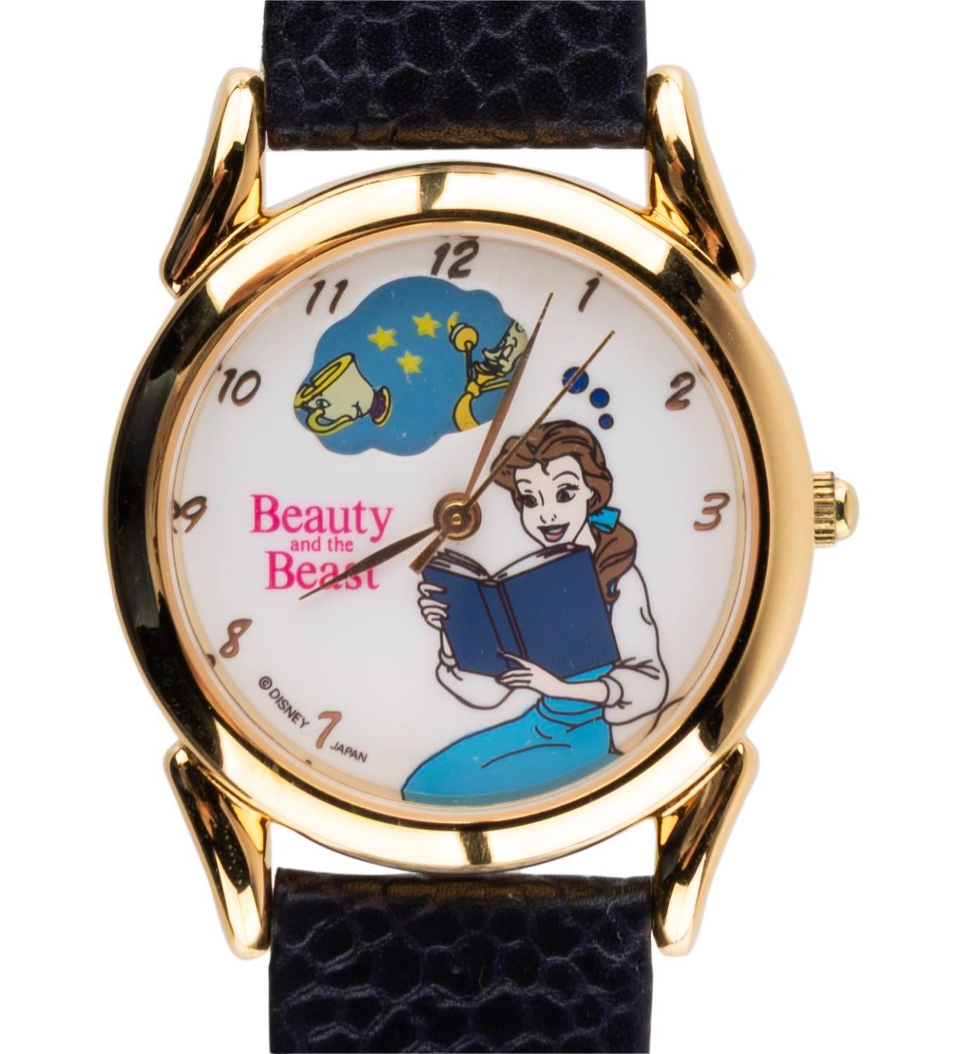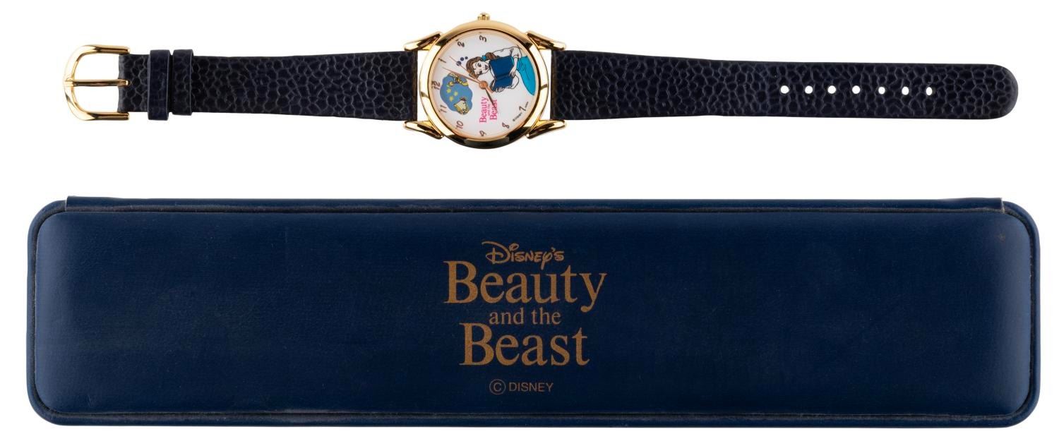 (Disney Store, 1990s) A "Beauty and the Beast " watch featuring Belle reading a book, with the other characters rotating into view throughout the day. The watch is in fine condition, requiring a battery and possibly service to function. The presentation box is in very good condition with light handling wear.
