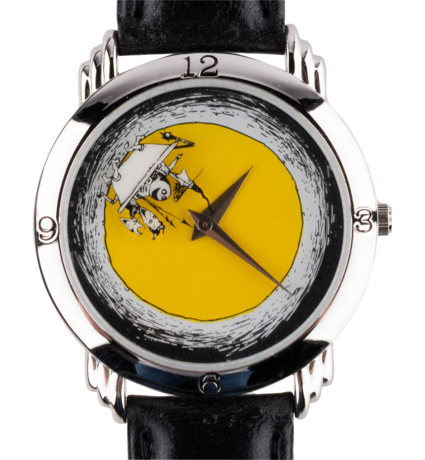 (Disneyland, 1993) A "Nightmare Before Christmas " Lock, Shock, and Barrel watch, sold exclusively at the Disneyland Cast Member Store Company D, in a limited edition of only 750. The second hand is the trio circling in the bathtub from the film, and the sleeve displays Jack’s formula for Christmas. The watch is in fine condition, requiring a battery and possibly service to function.