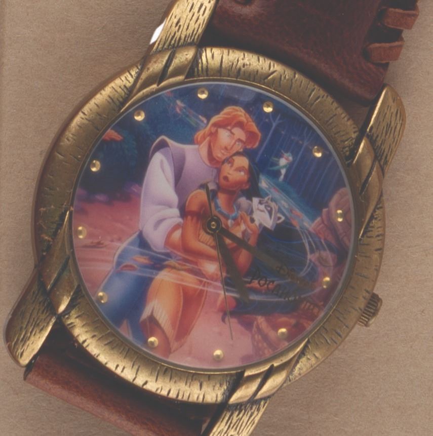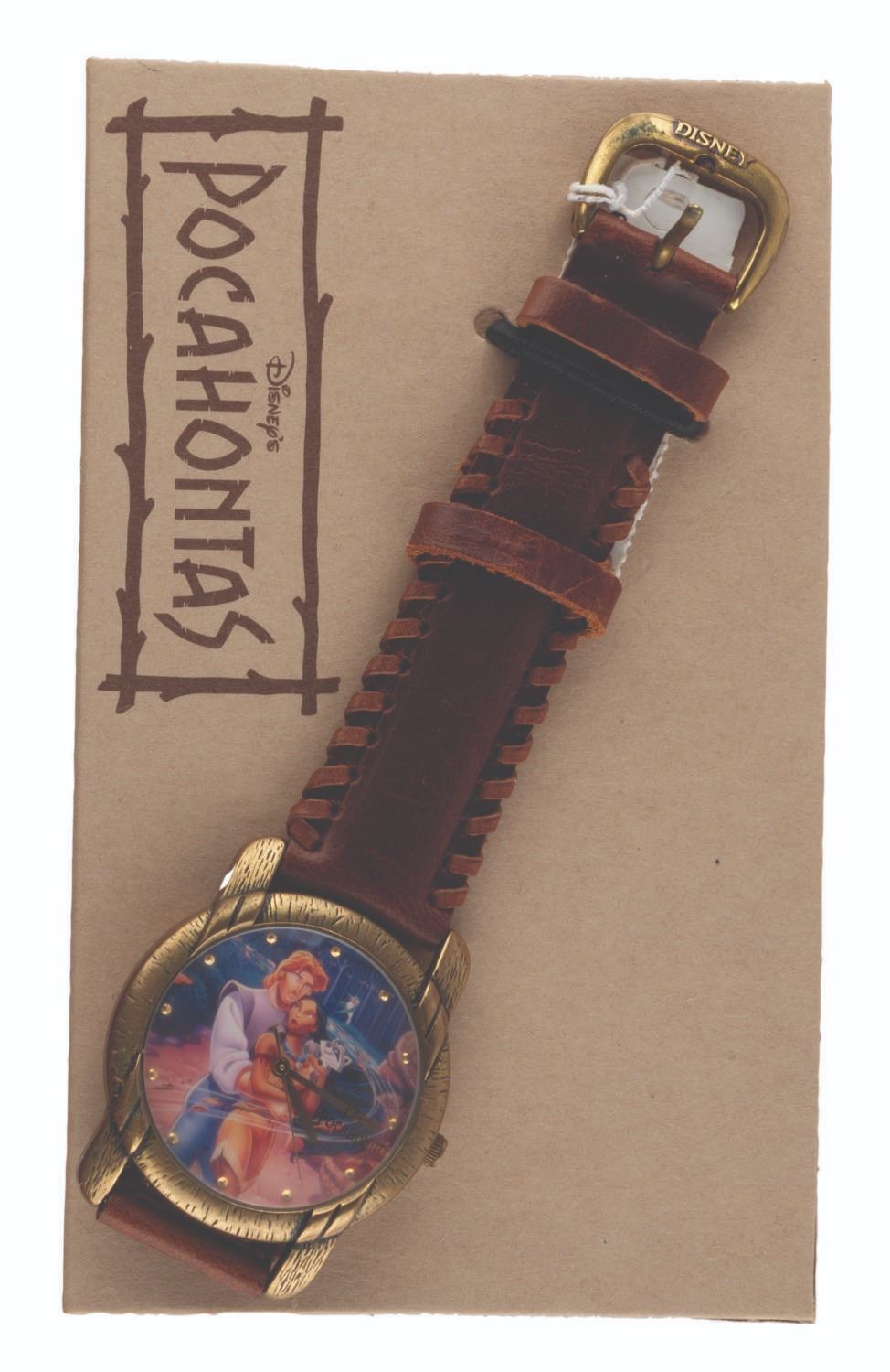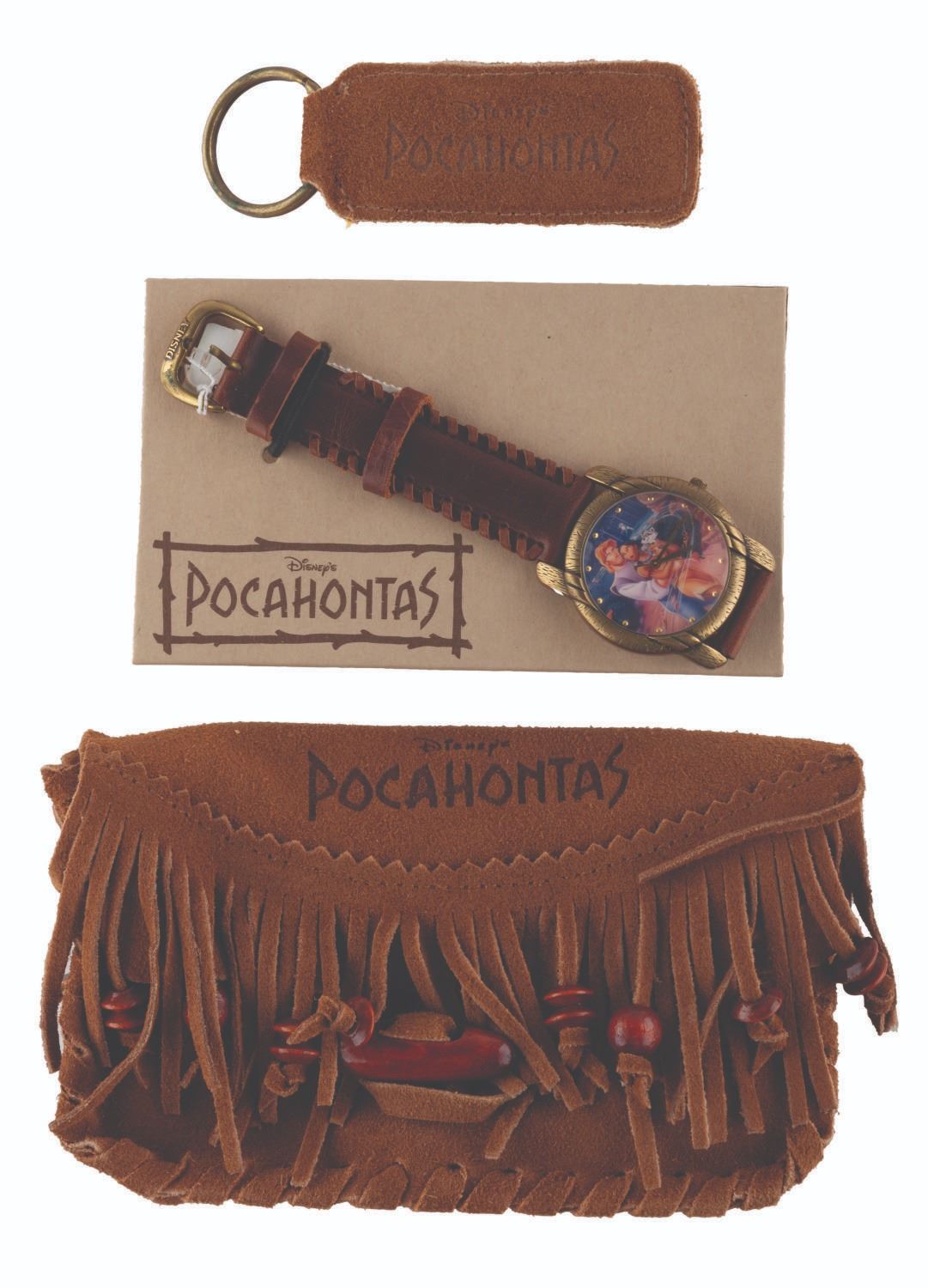 (Disney Parks, 1995) A "Pocahontas "leather coin purse, keychain, and watch, released in a limited edition of 5000 to commemorate the release of the film. In the purse measuring 6 " x 3.5 " x 2 ", the set is in very good condition with light handling wear, and the watch requiring a new battery and possibly service to function.