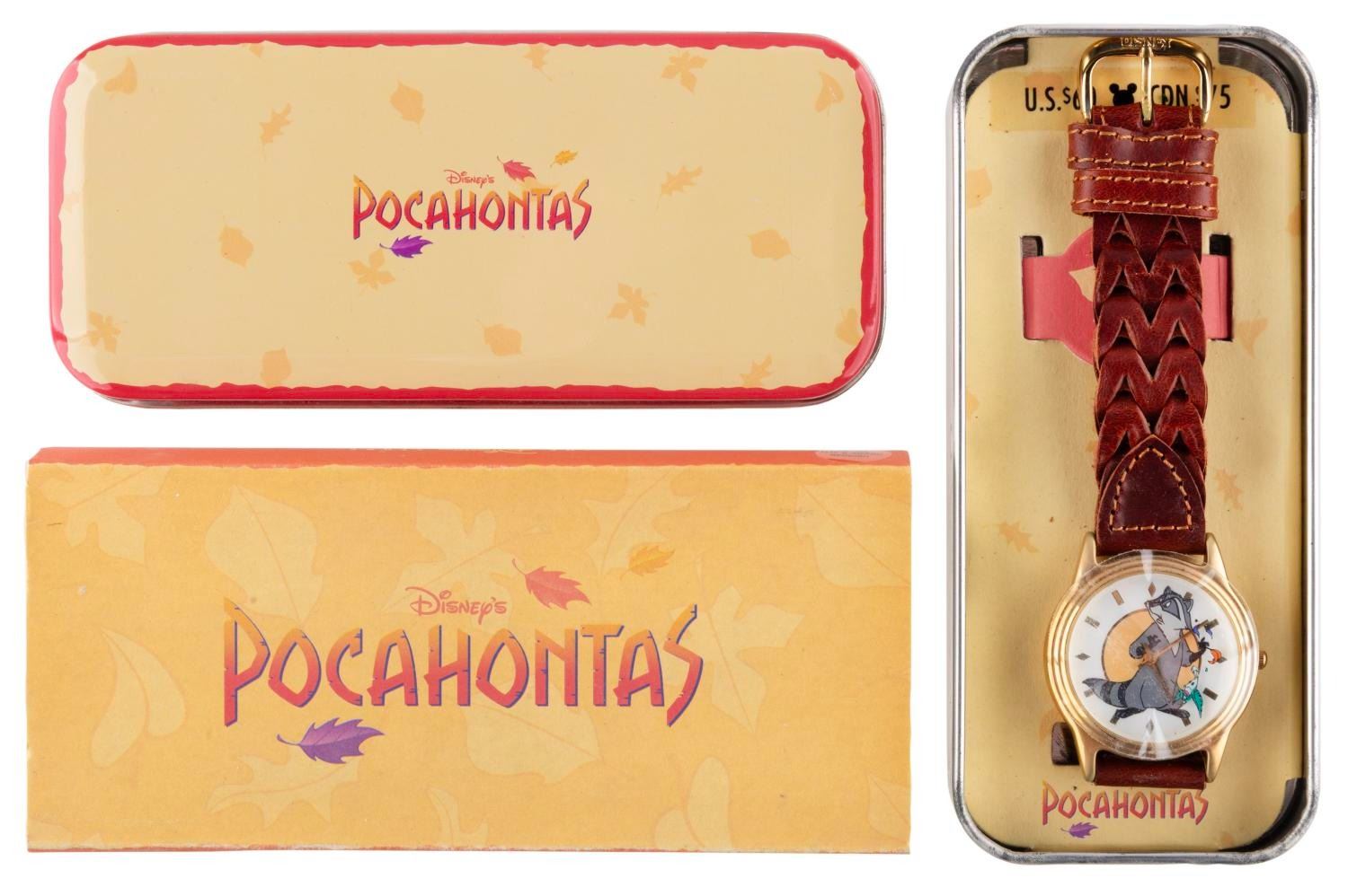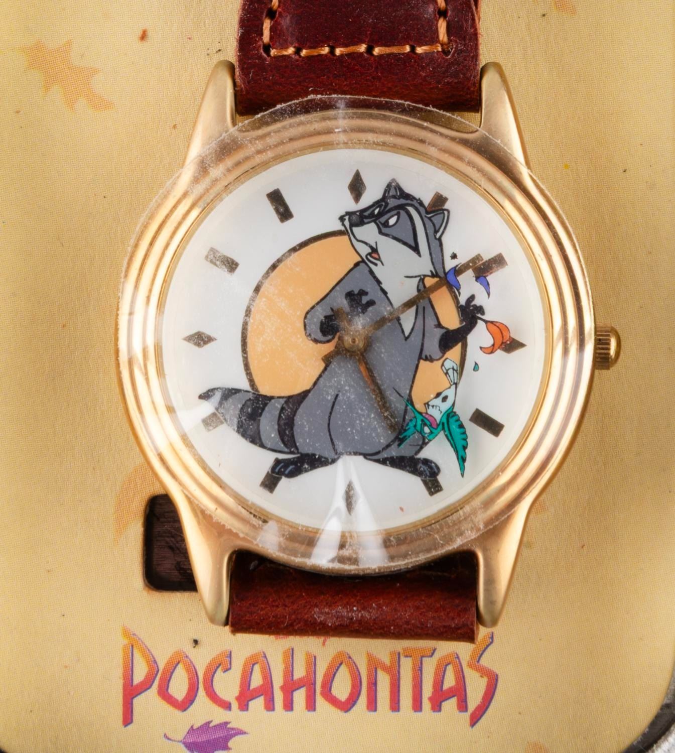(Disney Store, 1995) A "Pocahontas " watch in its original tin. The face of the watch features Meeko, with Flik circling as the seconds feature. The watch and tin are in fine as-new condition, requiring a battery and possibly service to function.