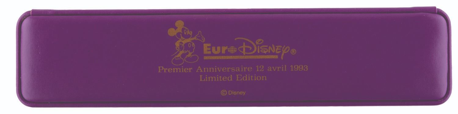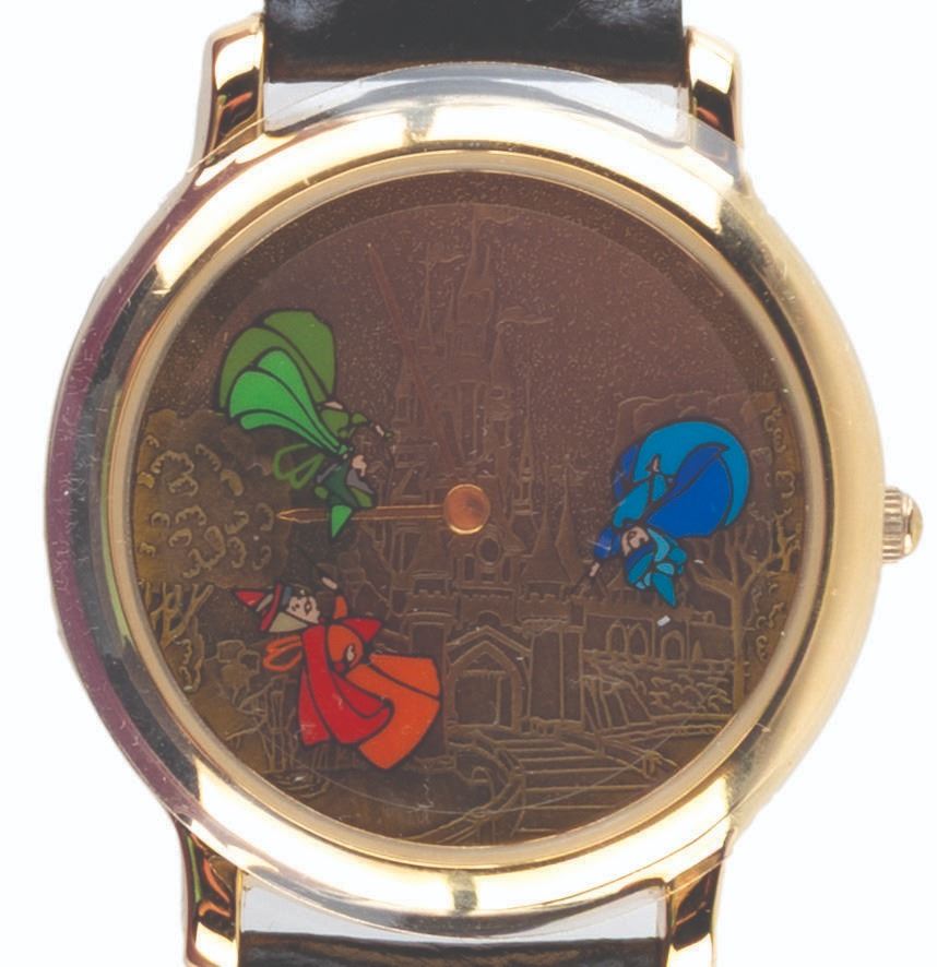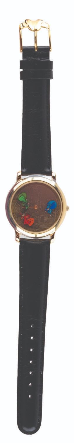 (Disneyland, 1993) A Euro Disneyland Premier watch, released exclusively to Disneyland (Anaheim) Cast Members with the opening of the new European Park. The watch shows the new Park castle, with the fairies from "Sleeping Beauty " circling as the second feature. Numbered 1361, the watch is in fine condition, requiring a battery and possibly service to function, with the presentation box.