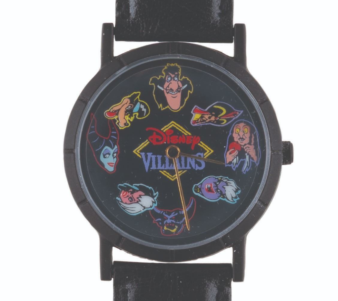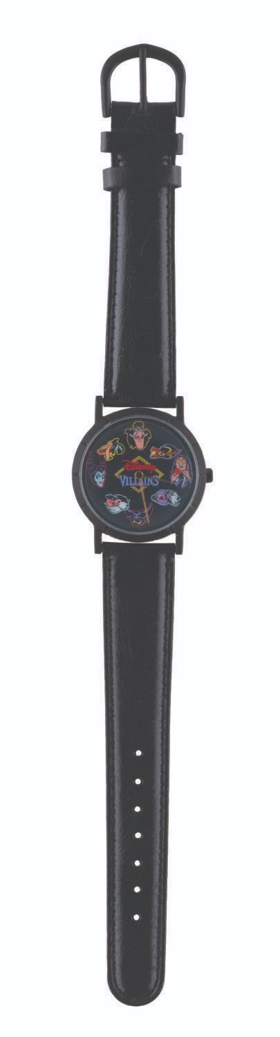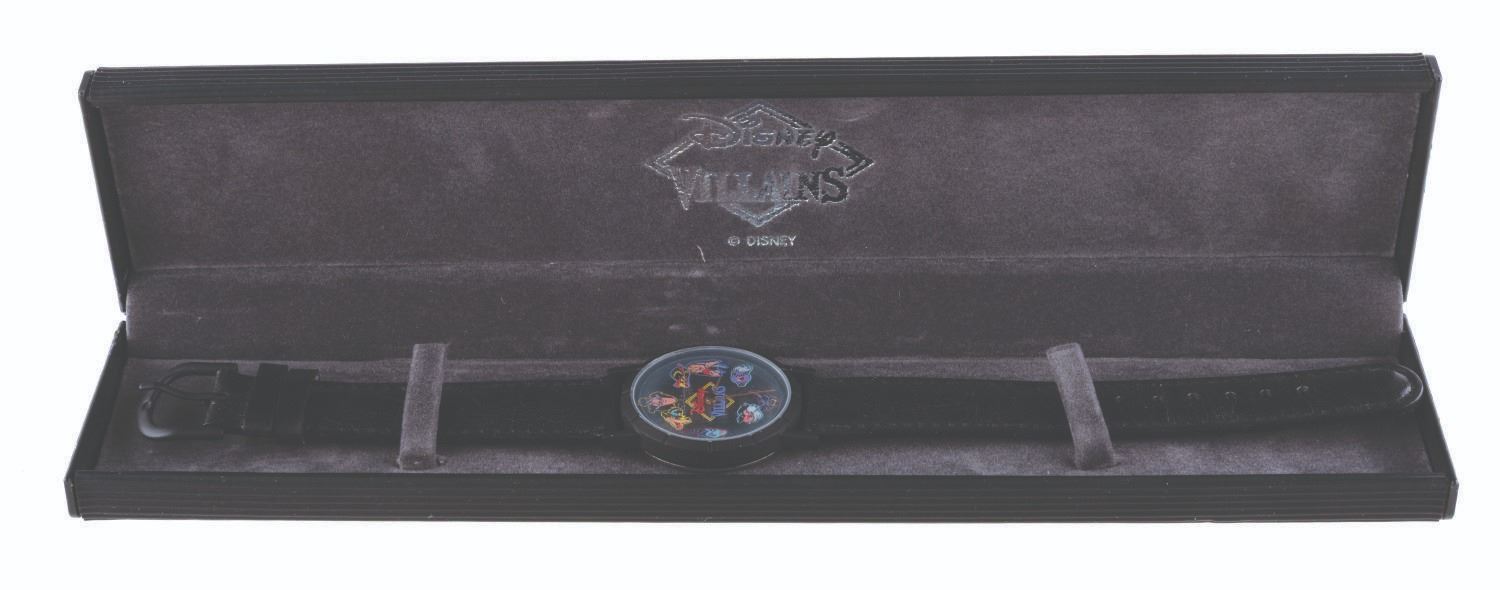 (Mickey Inc., 1990s) A Disney Villains wristwatch featuring the Big Bad Wolf, Captain Hook, Jafar, Ursula, the Old Hag, Maleficent, Cruella De Vil, and Chernabog. Measuring 1.25 " in diameter with a 9.25 " band, the watch is in fine, as-new condition with the original box, requiring a battery and possibly service to function. The original box exhibits light wear from handling and age.