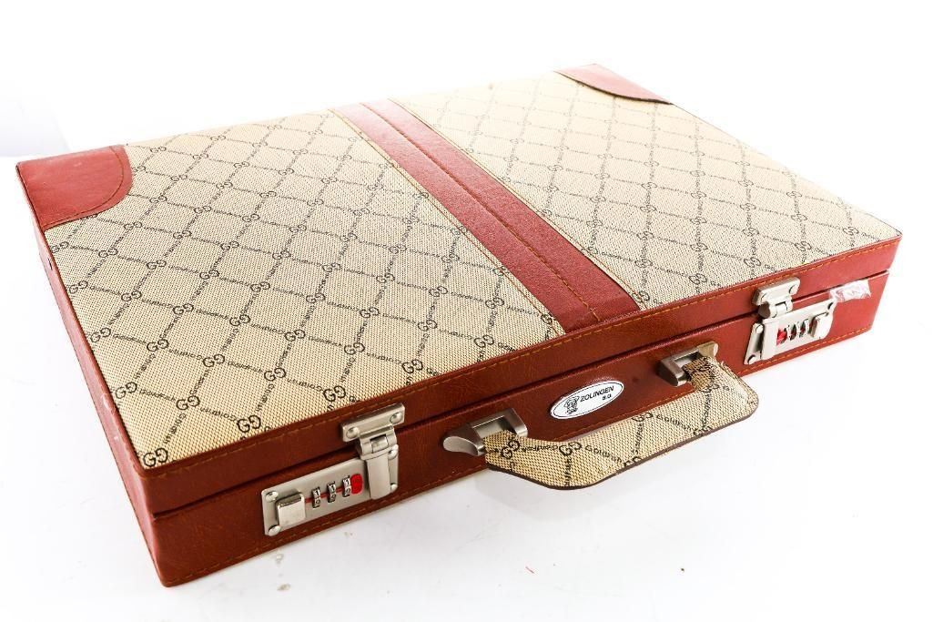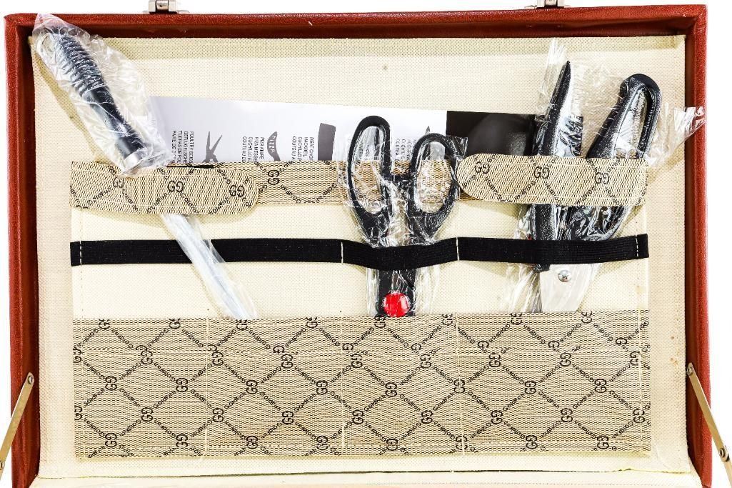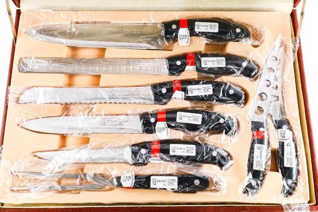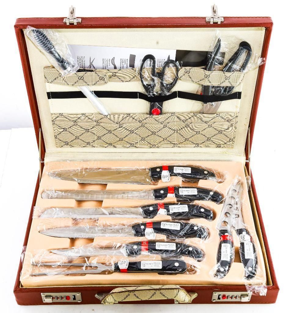 This is a Solingen S.G. (Germany) kitchen knife set presented in a hard-sided, briefcase-style storage case with combination latches and a carry handle. Inside, the set includes multiple stainless-steel knives with black riveted handles (several blades are still sealed in protective plastic), along with kitchen tools stored in the lid such as scissors and additional utensils/accessories. The interior has molded inserts to hold each piece securely, and the lid lining is marked ÒZOLINGEN S.G.Ó. The exterior features a tan/brown monogram-style patterned panel with contrasting trim (patterned designÑnot indicated as a luxury brand). Ð A8537