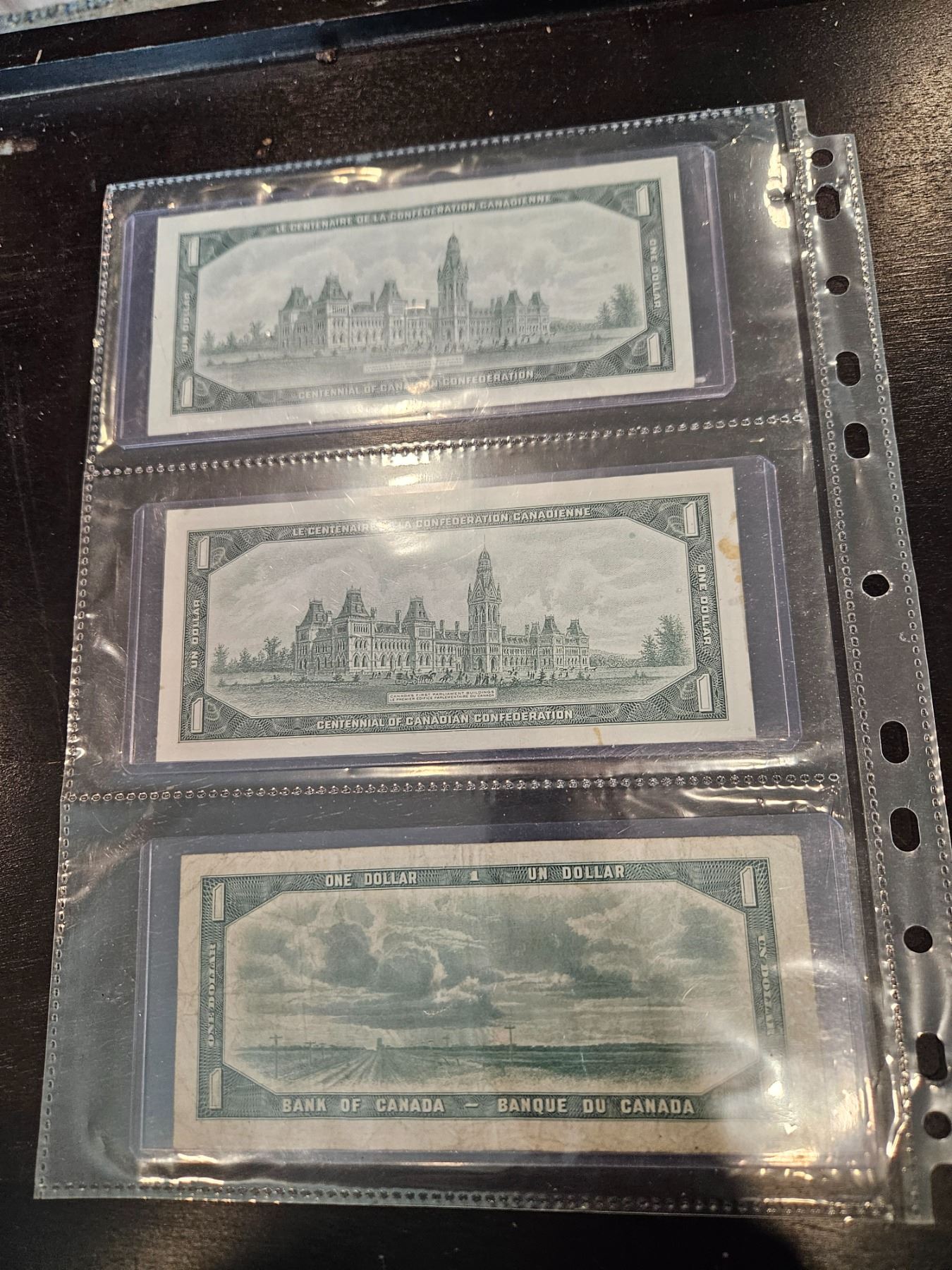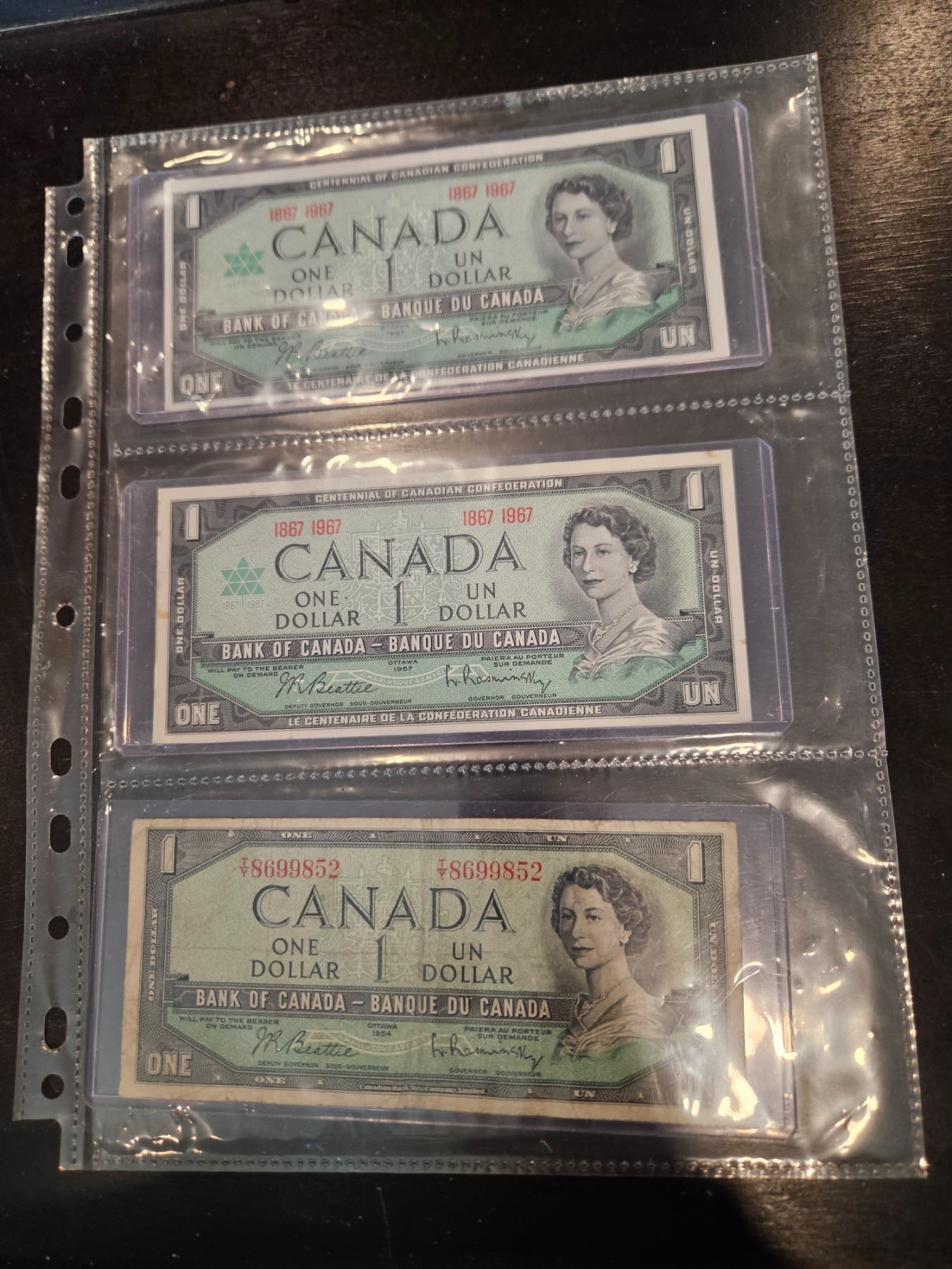 Lot 820a 2x 1967 & 1x 1954 Canadian $1 bills