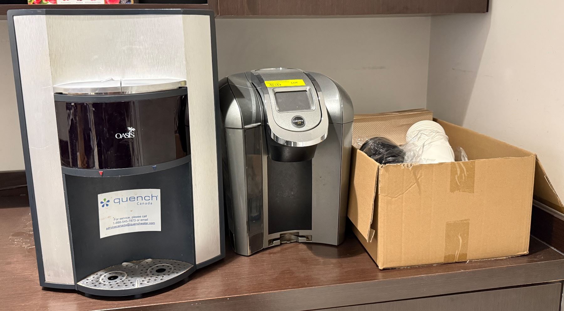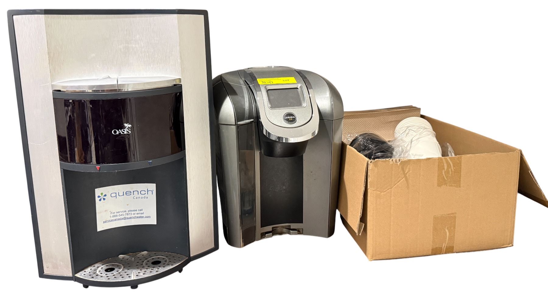 Lot 80D Oasis Quench Water Dispenser, Keurig 2.0 K500 Coffee Maker & Bulk Disposable Cups with Lids