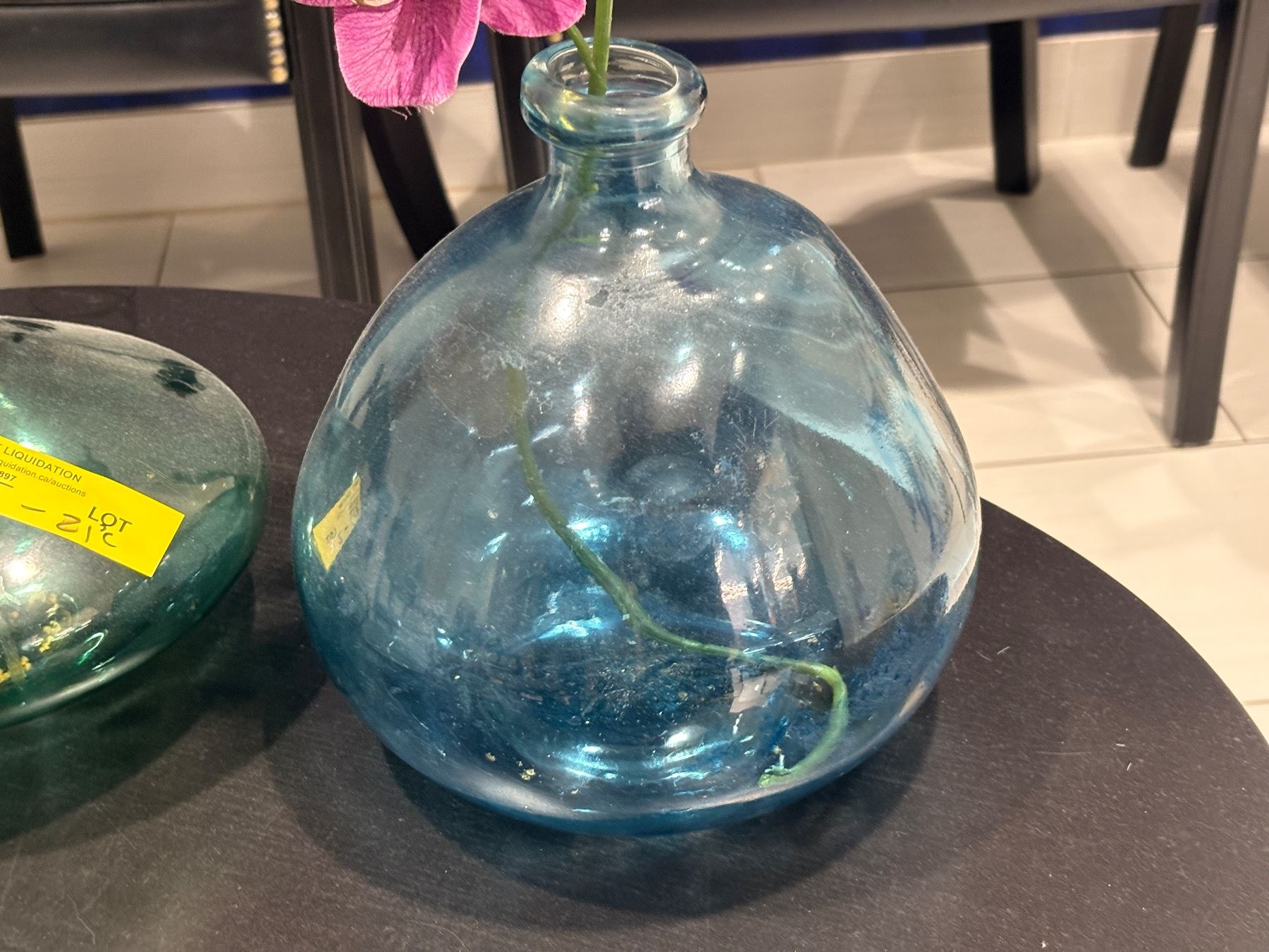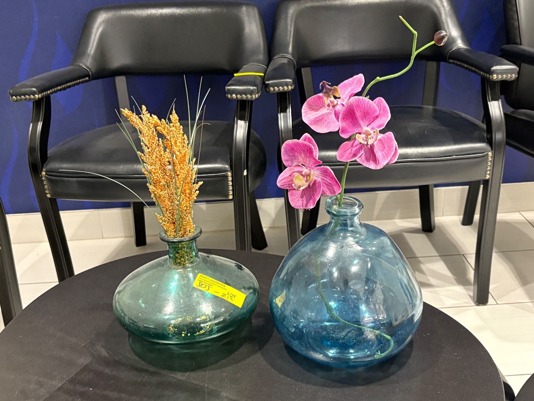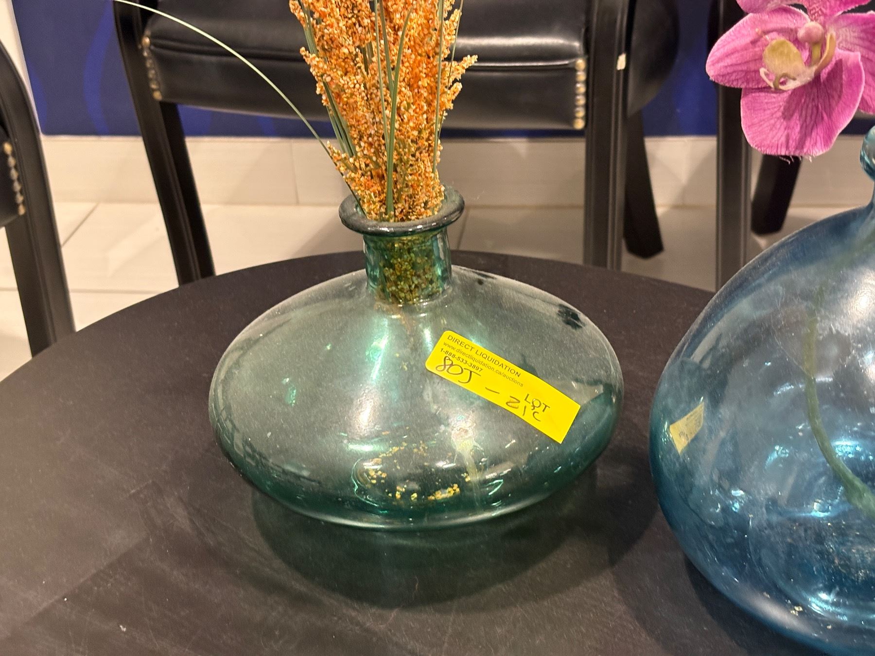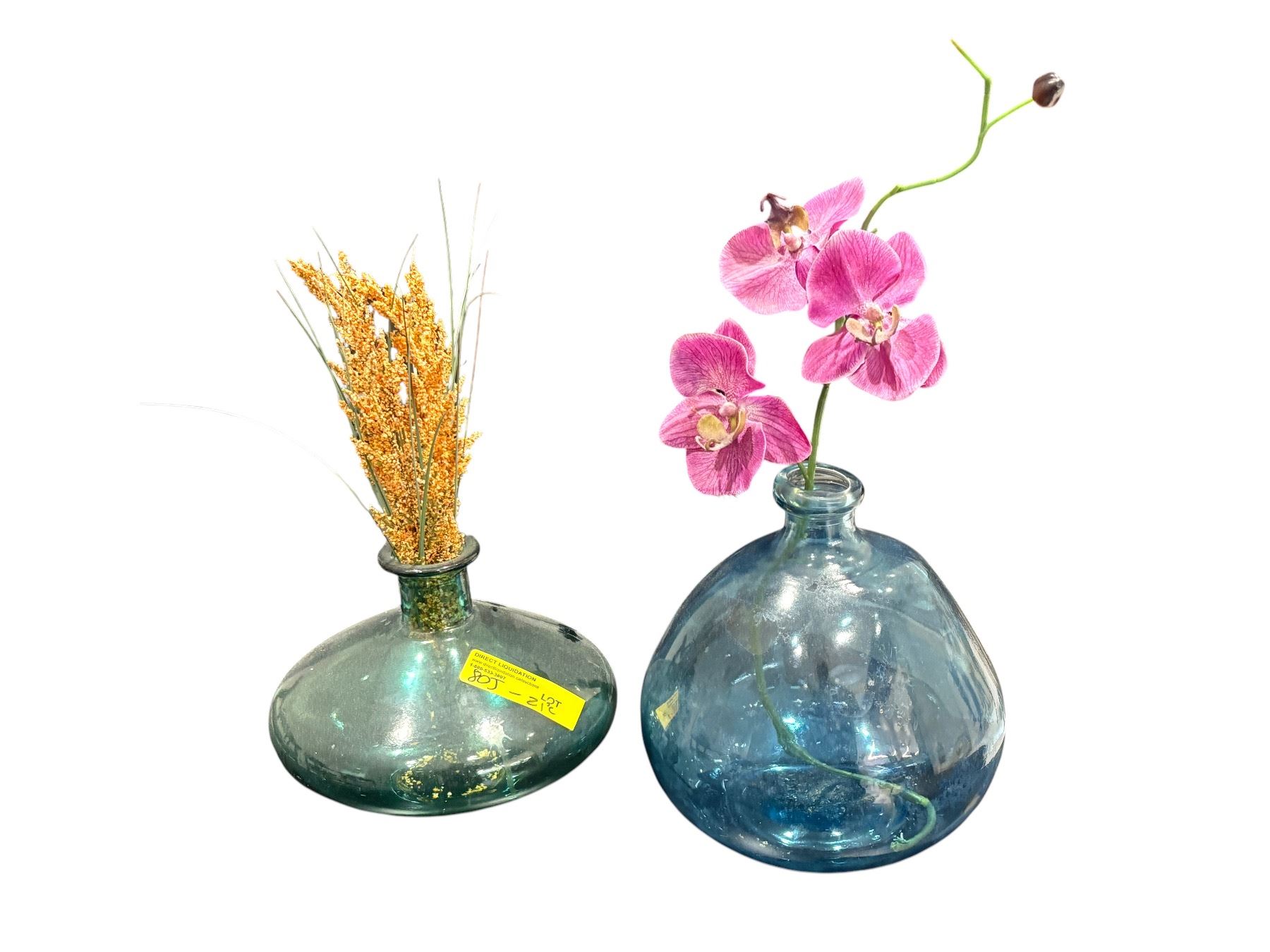 Lot 80J 2 Hand-Blown Iridescent Blue-Green Glass Vases with Faux Orchid and Floral Accents