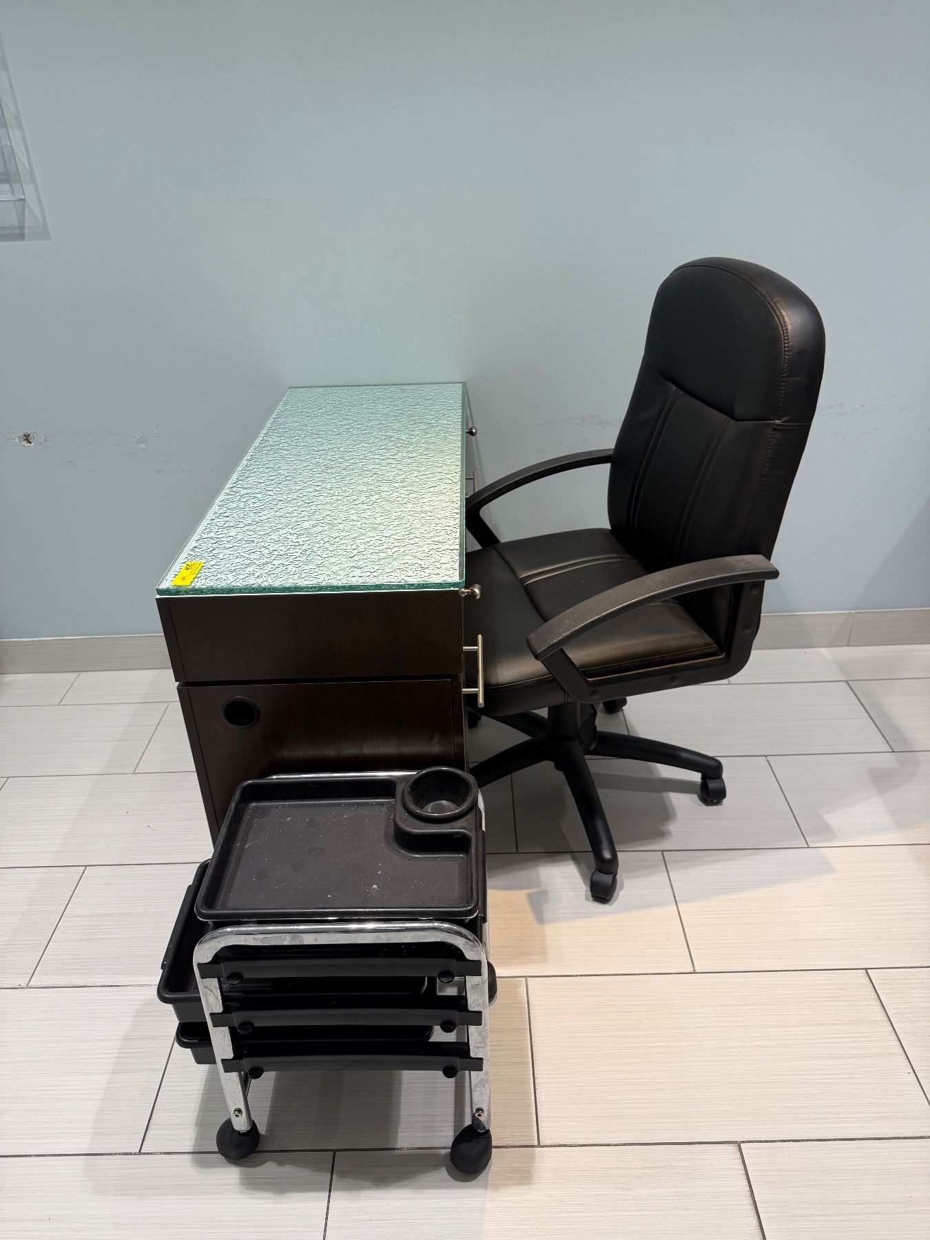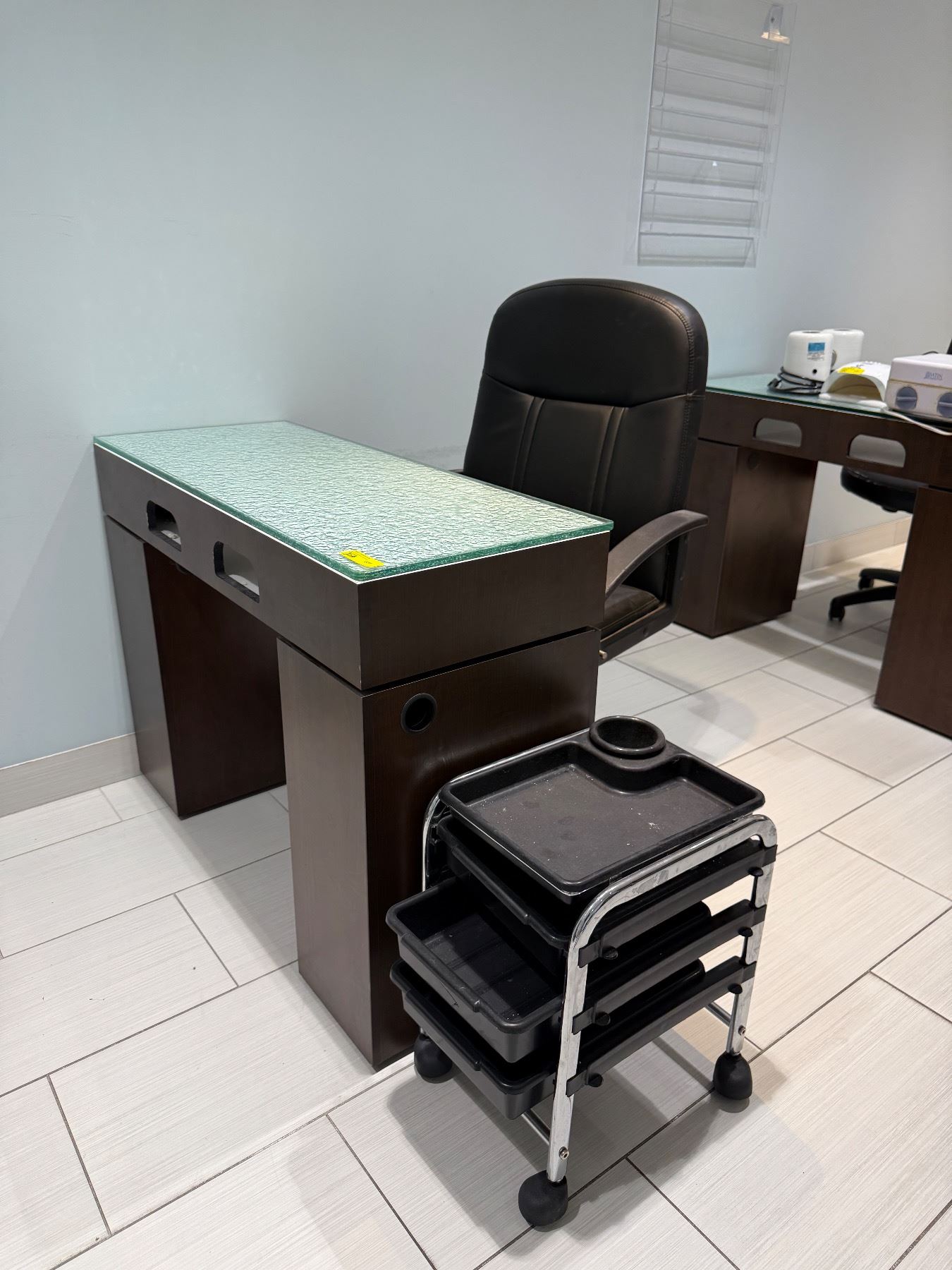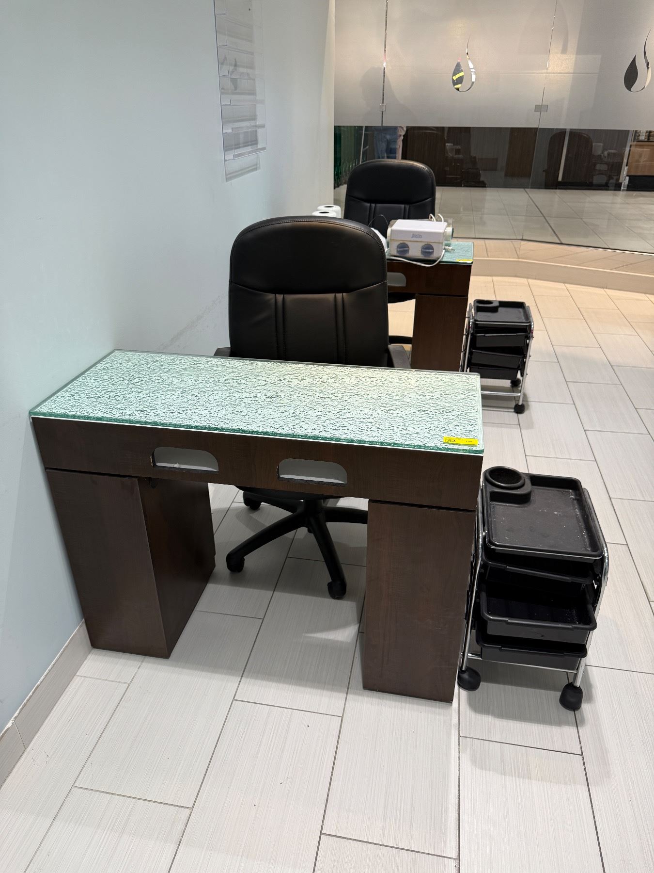 Lot 180A Professional Manicure Station Set - Glass Top Nail Desk, Rolling Technician Chair & Storage Trolley