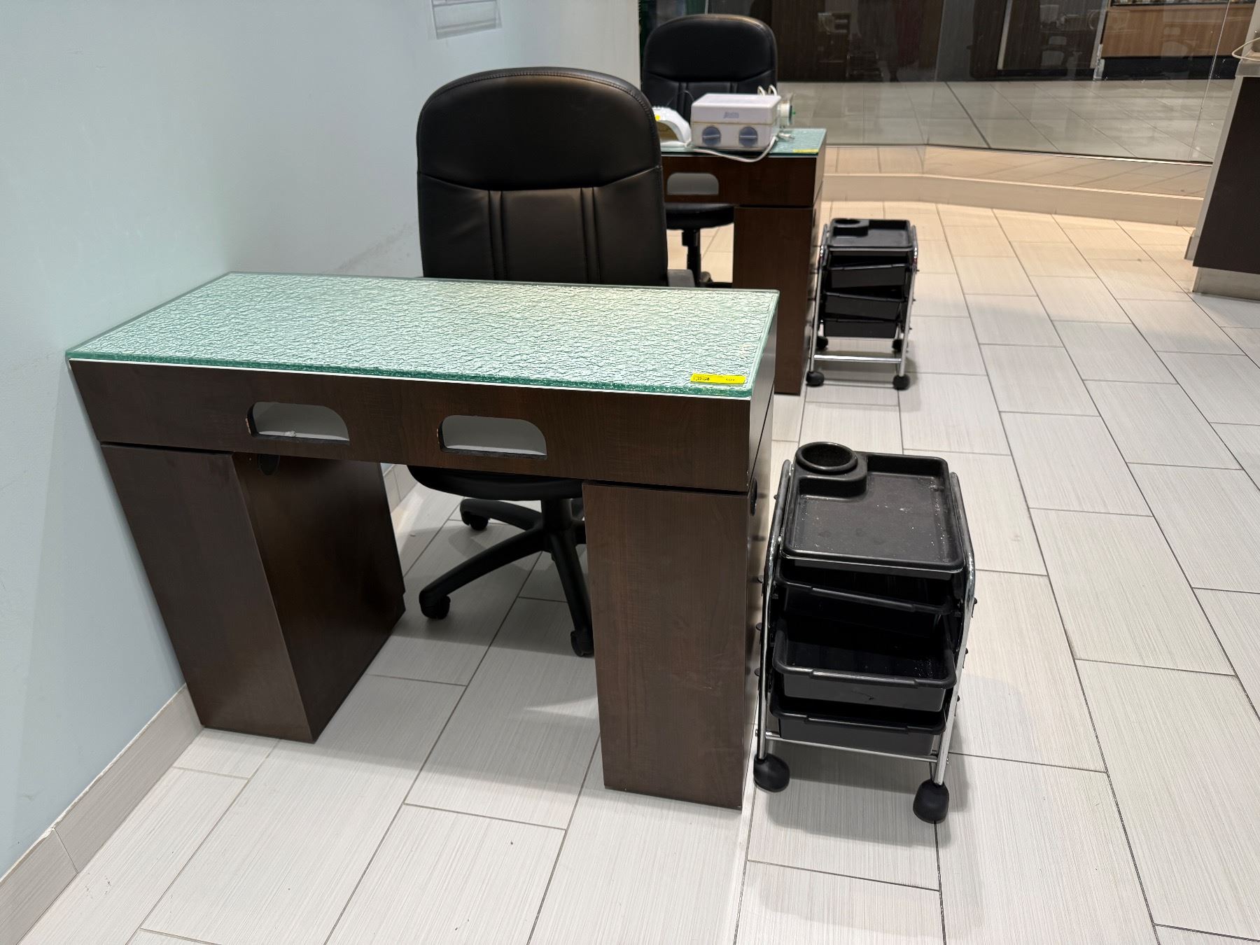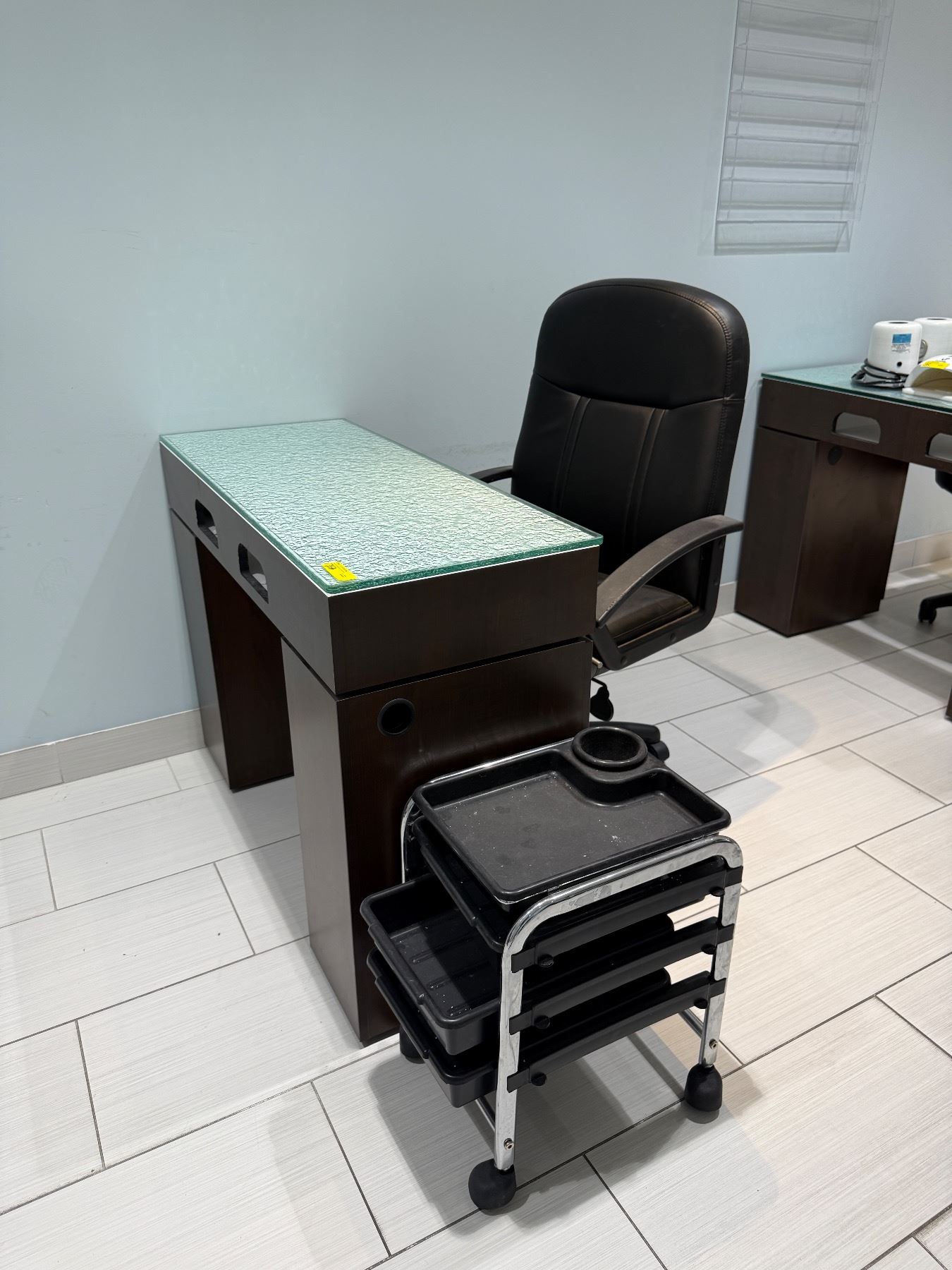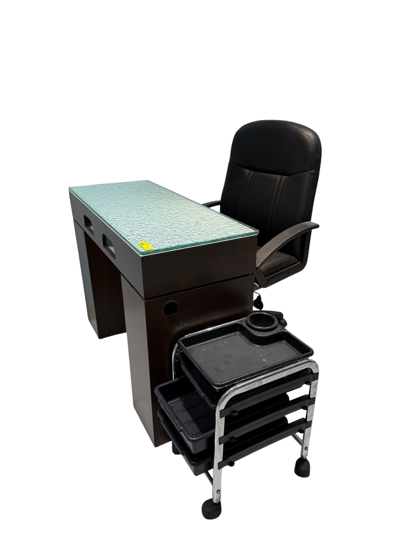 Lot 180B Professional Manicure Station Set - Glass Top Nail Desk, Rolling Technician Chair & Storage Trolley