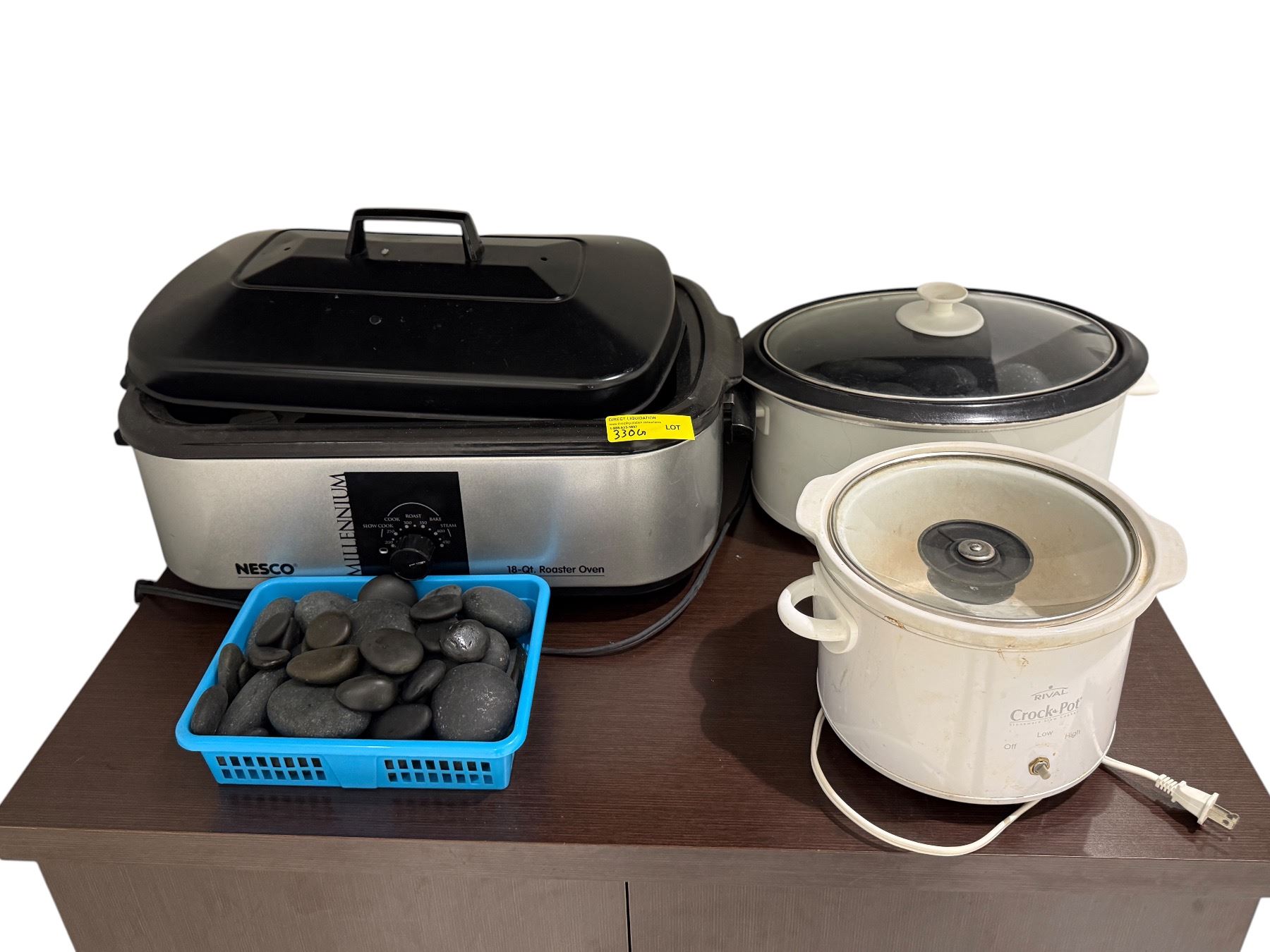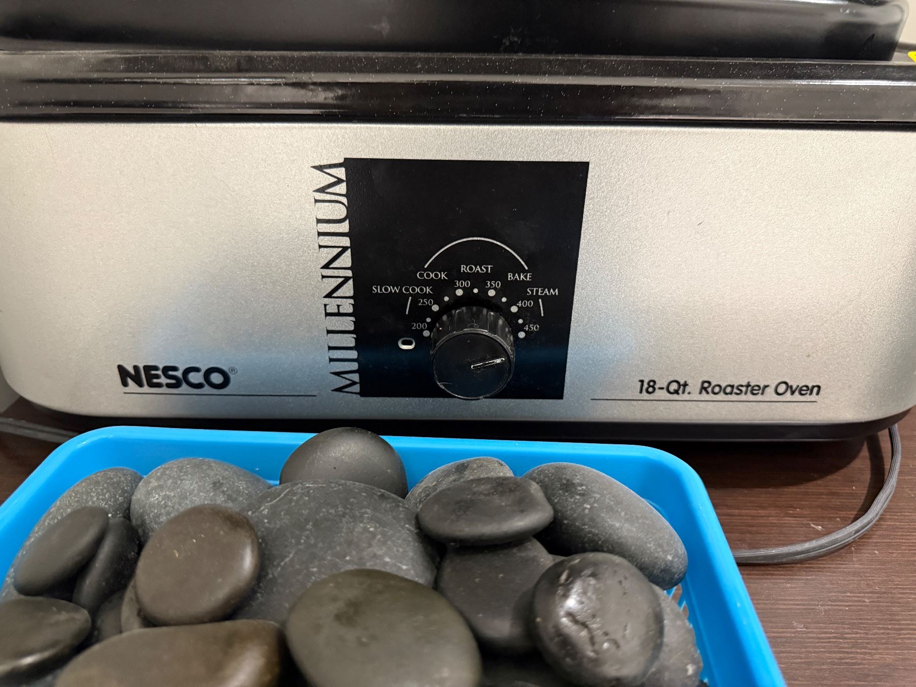 Professional Hot Stone Massage Lot - Nesco 18 Qt Roaster, 2 Crock-Pot Slow Cookers & 30+ Basalt Stones