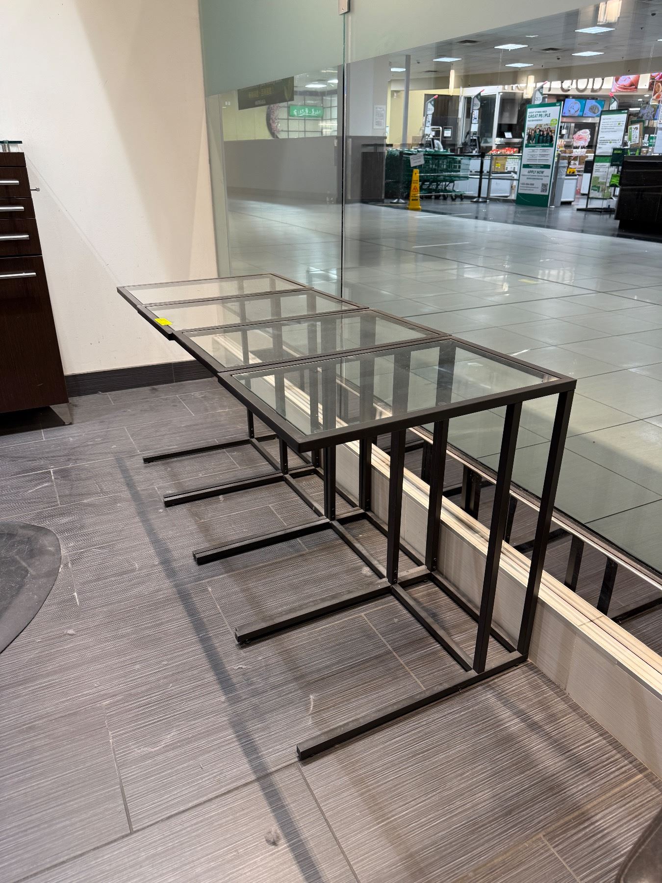 Set of 4 Black Metal C-Frame Side Tables - Smoked Glass & Granite Style Tops