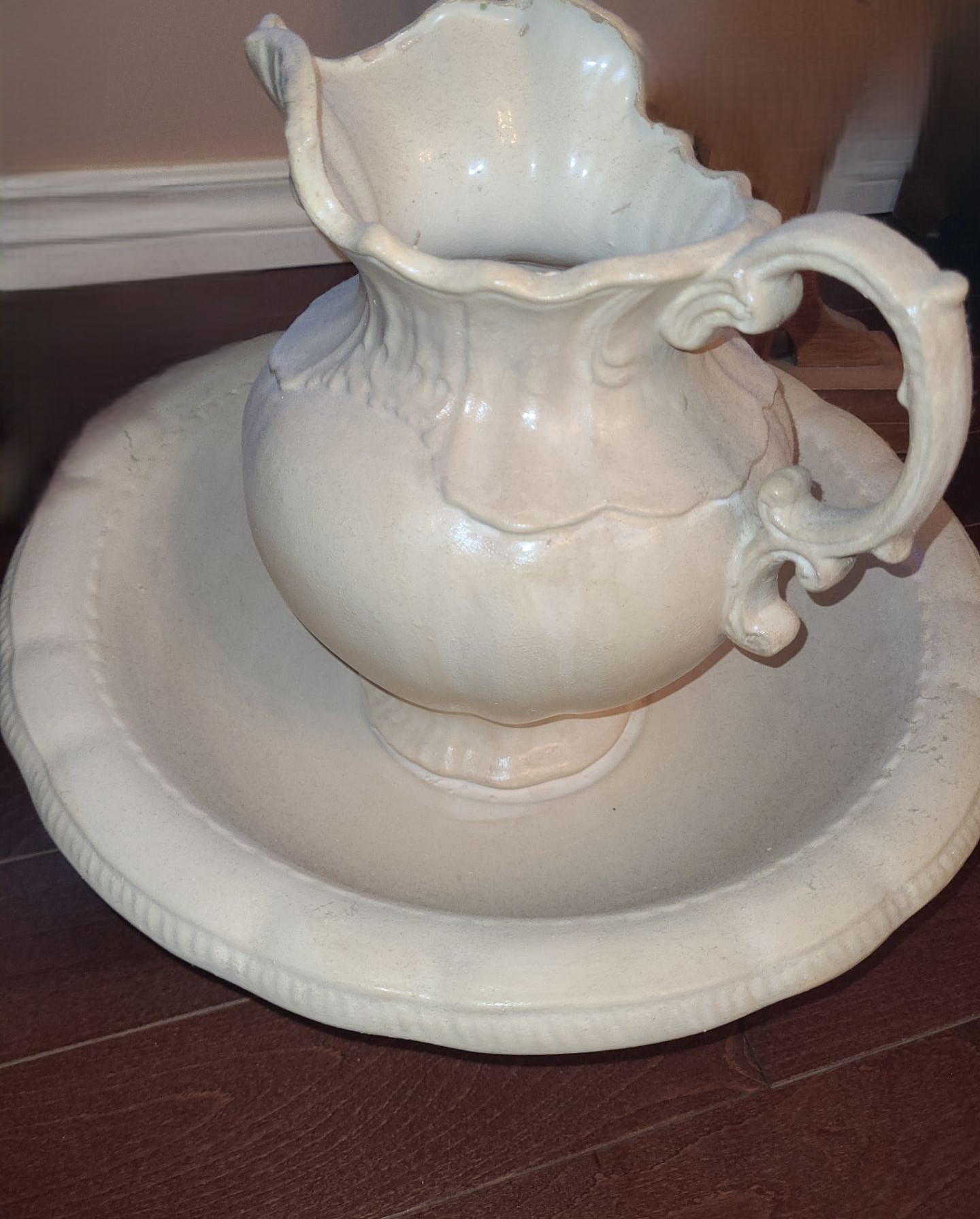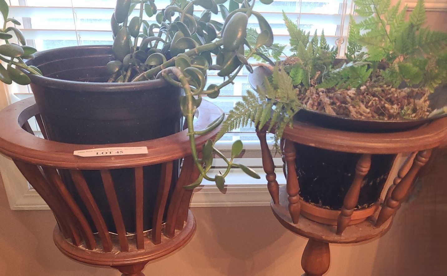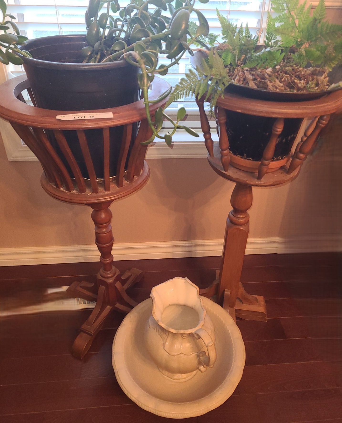 Lot 45 Pair of Wooden Planters w Fern & Jade plant. Wash Basin & Pitcher