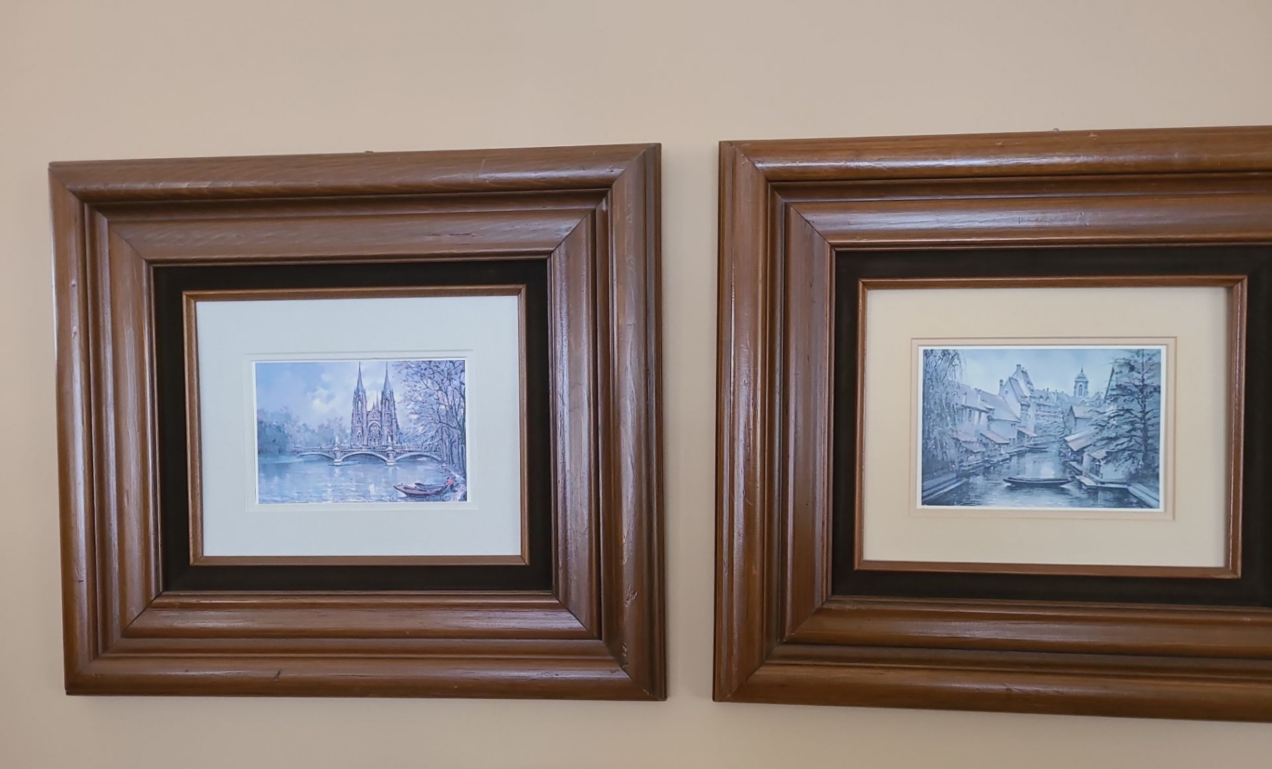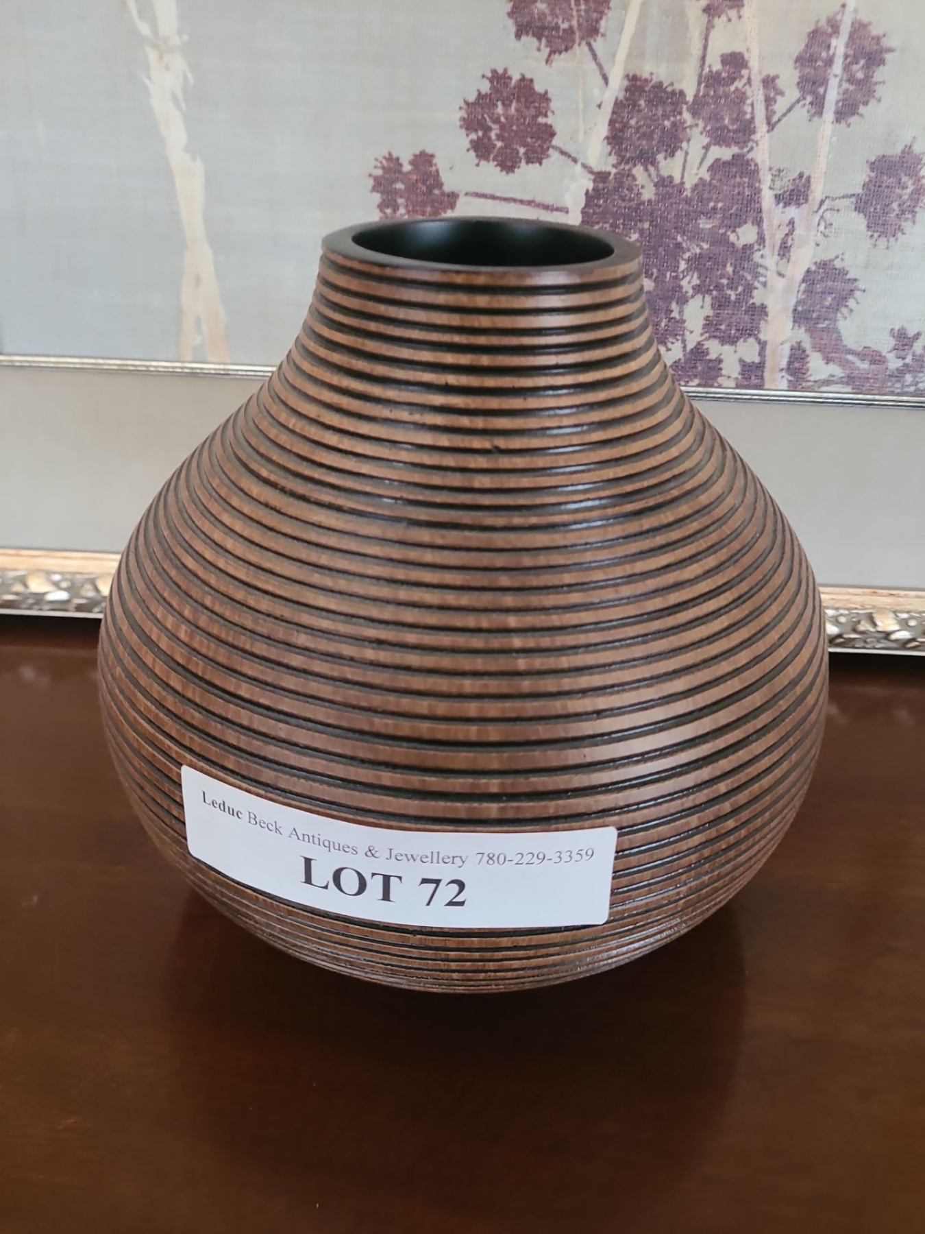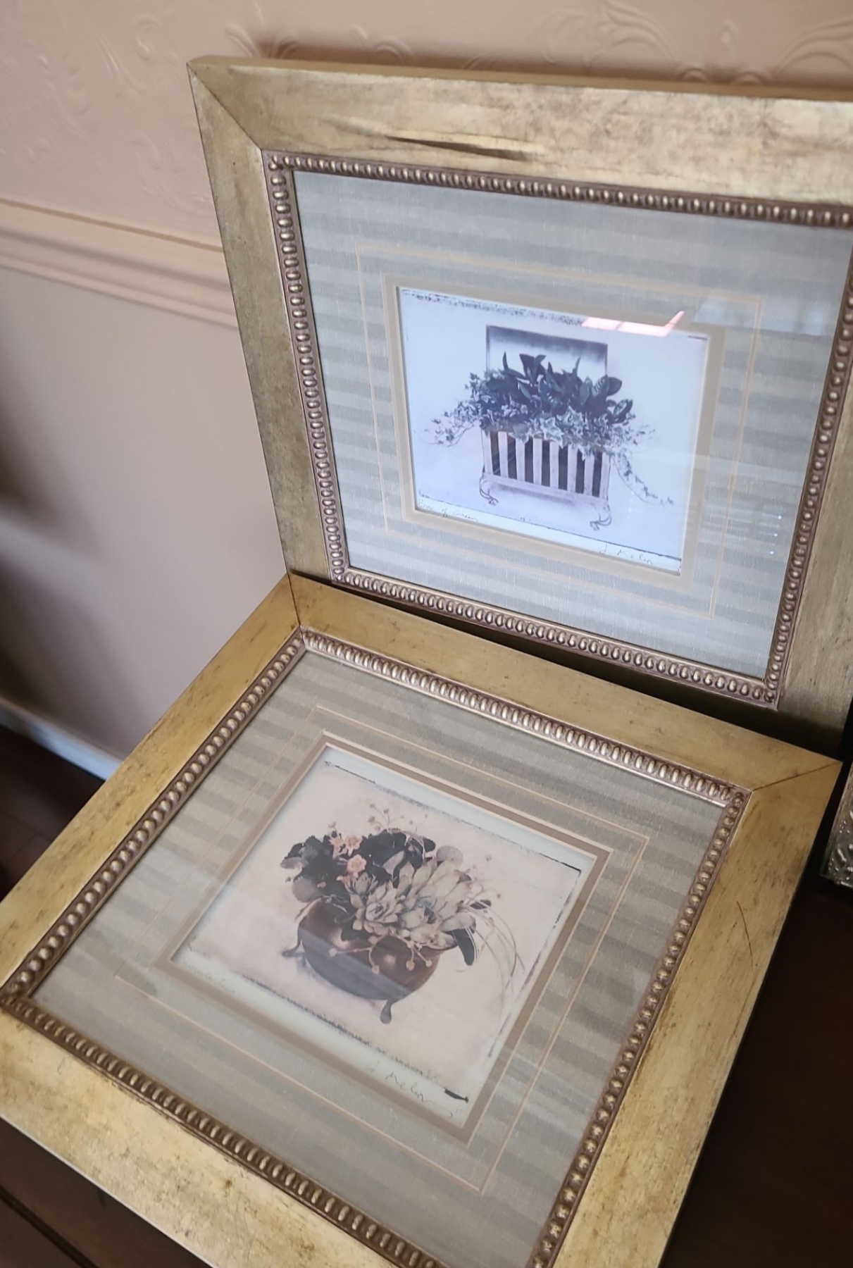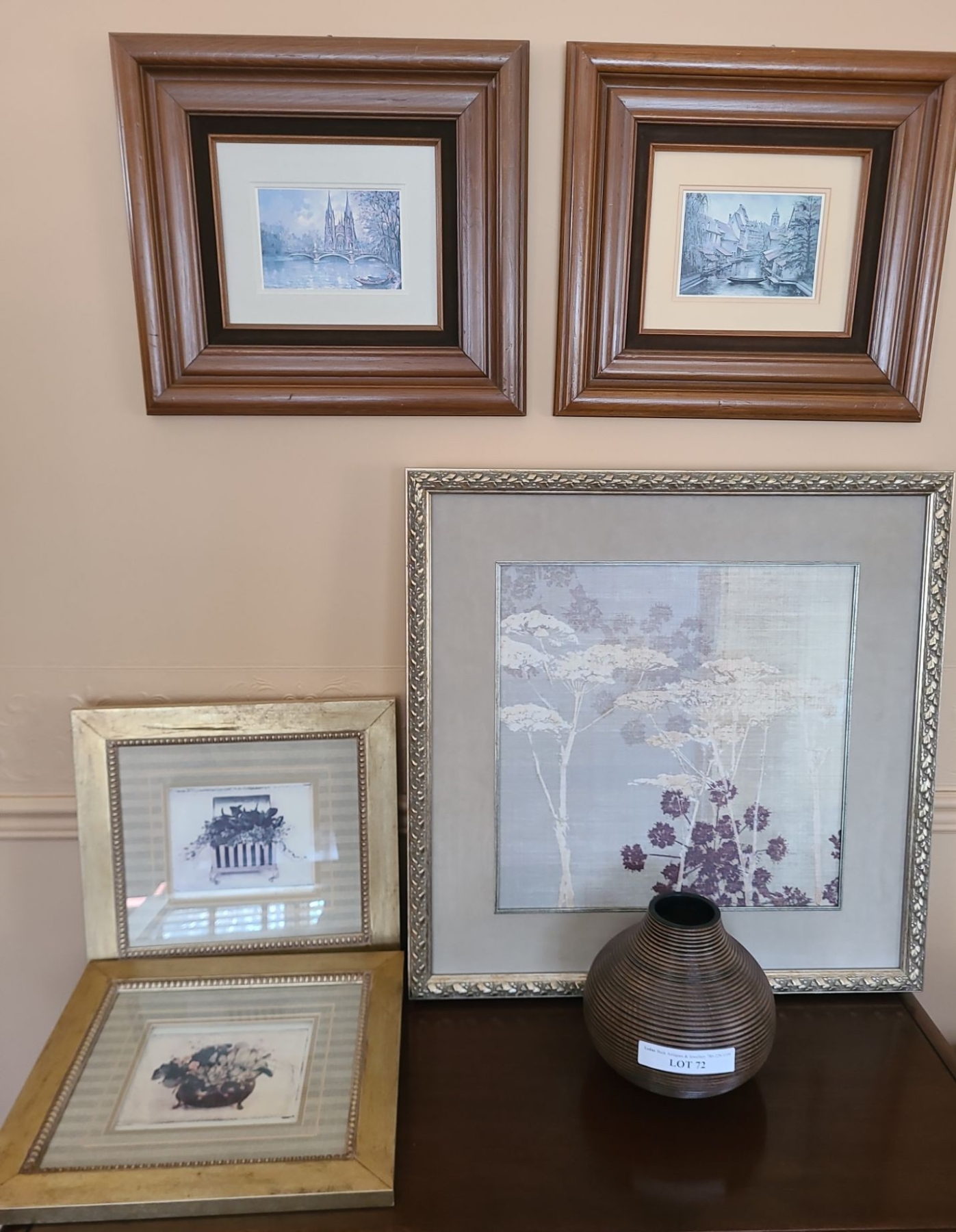 Lot 72 Vase & 4 Framed Prints. Silver Frame 26 w 26 h. Gold Frame 15 1/2 w 14 1/ h. Wood 18 w 16 h