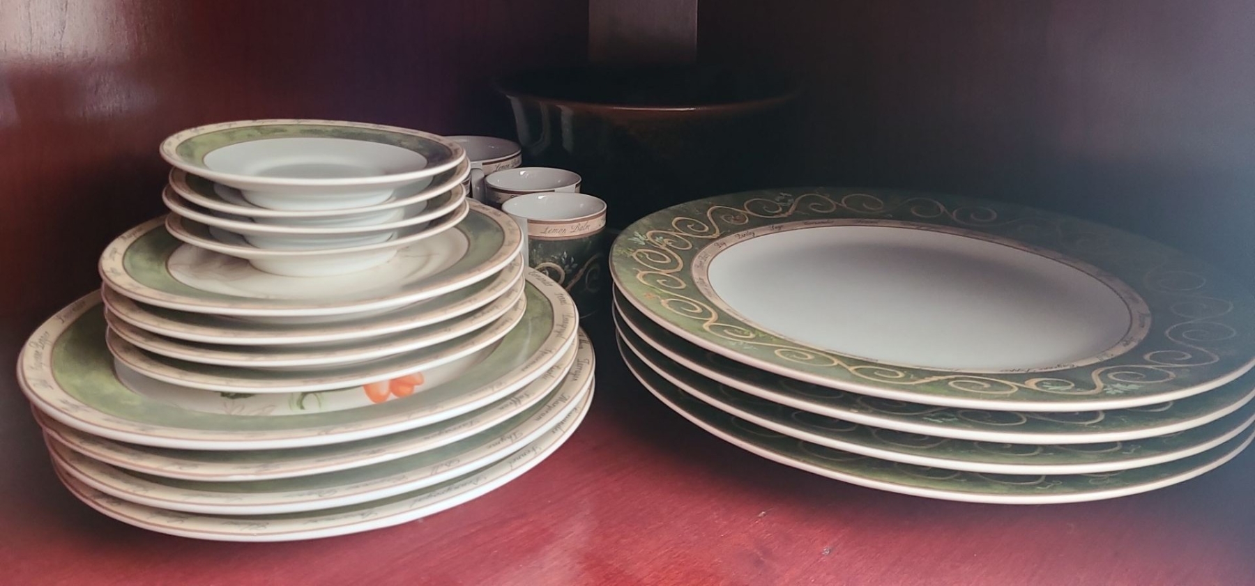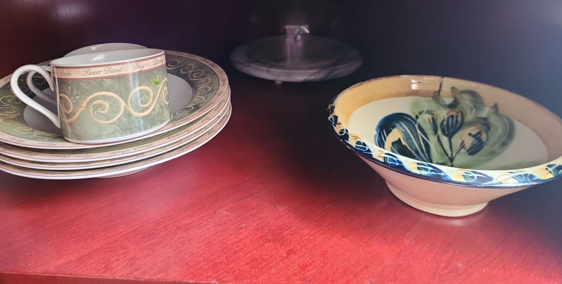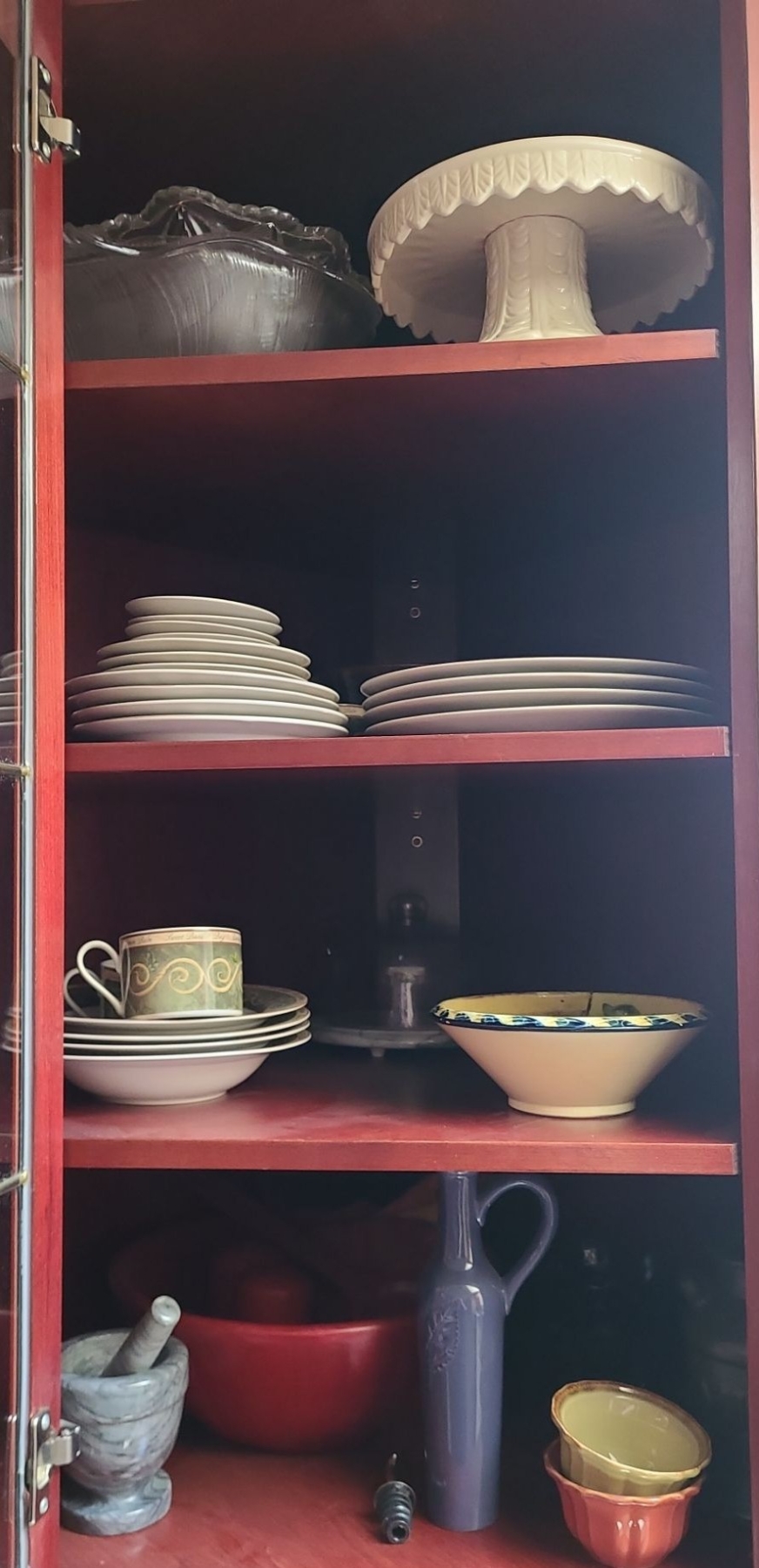 Lot 84 Contents of Cupboard, Dinnerware, Bowls, Cake Stand, Wooden Salad Set & more