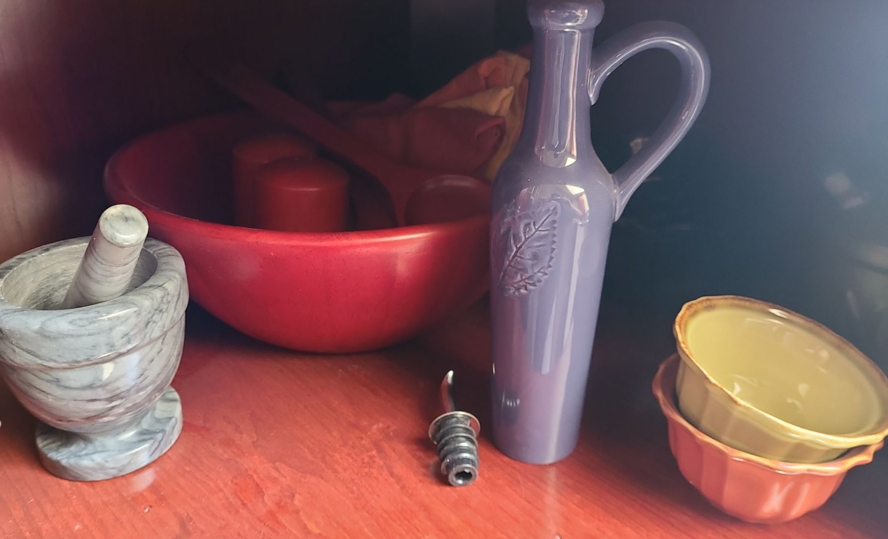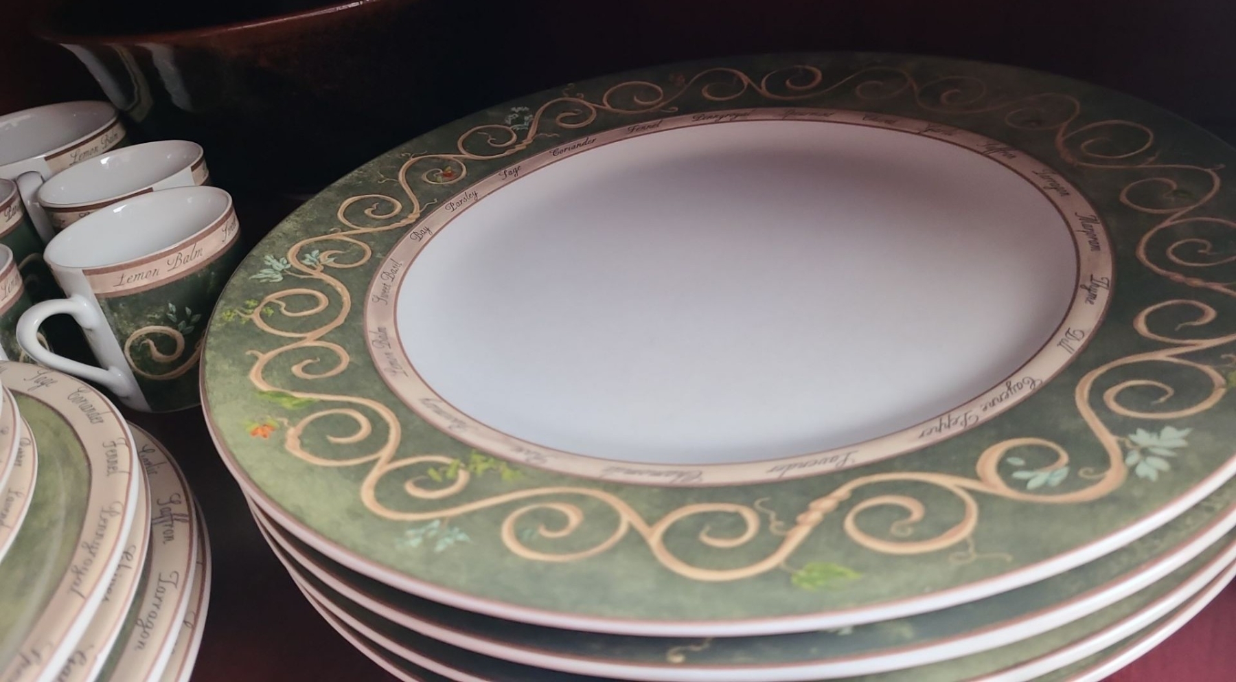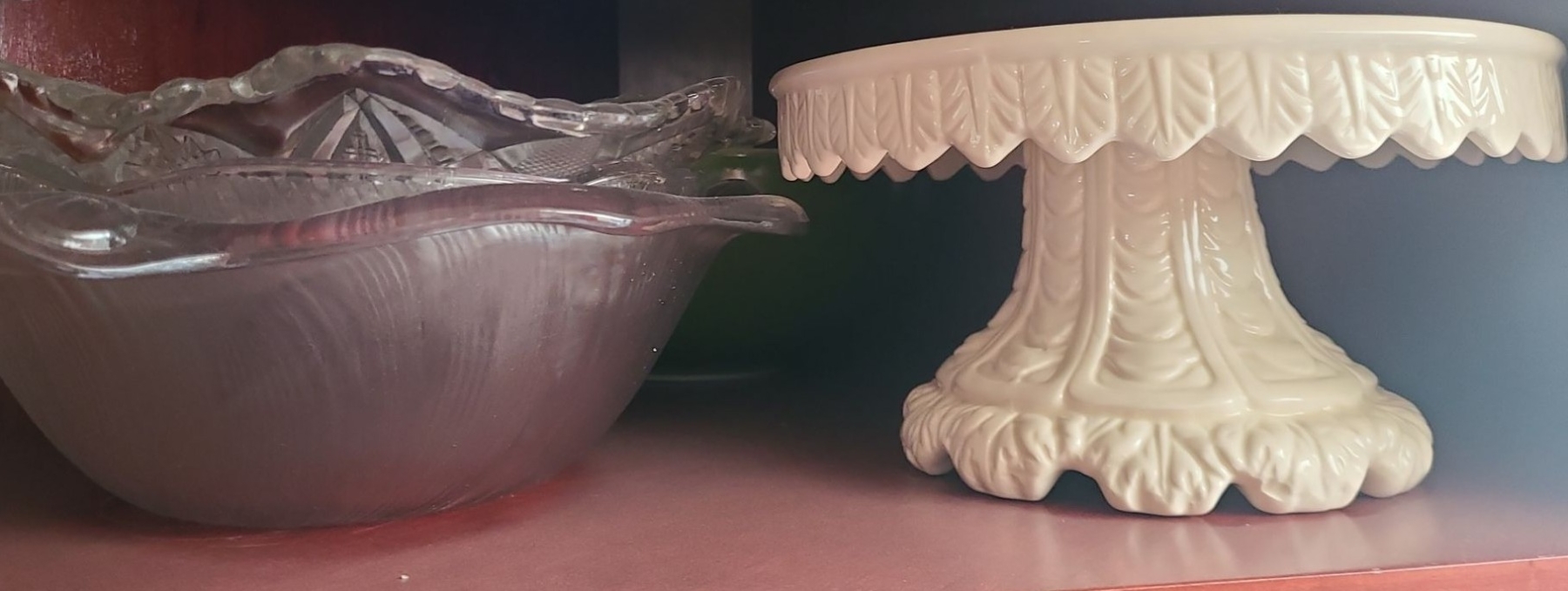 Lot 84 Contents of Cupboard, Dinnerware, Bowls, Cake Stand, Wooden Salad Set & more