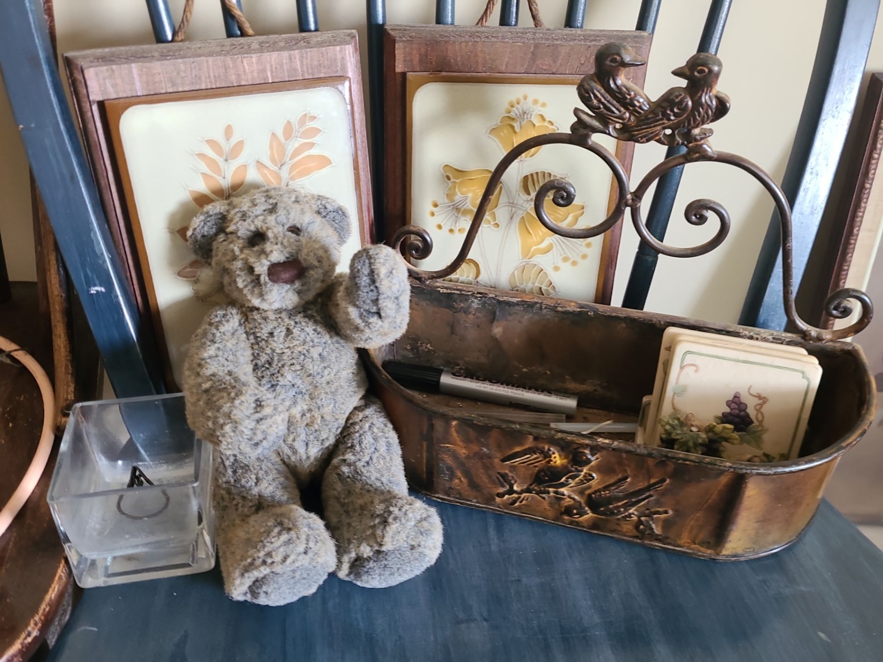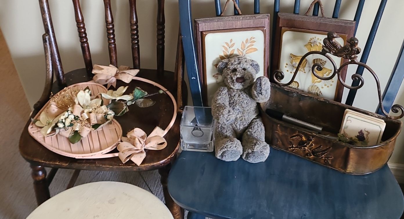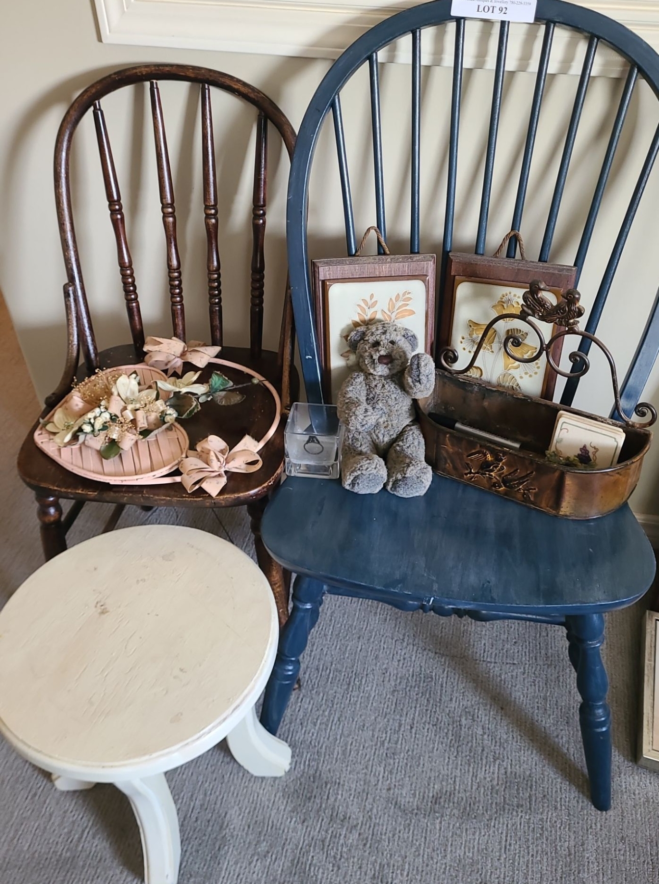 Lot 92 Wooden Dining Chairs, Blue 20 w 37 h, Small Table Teddy Bear Wall Art & more