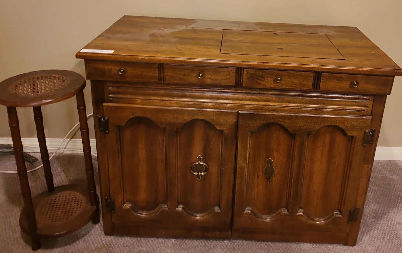 Lot 102 Wood Sewing Cabinet 41 w 31 h & Plant Stand