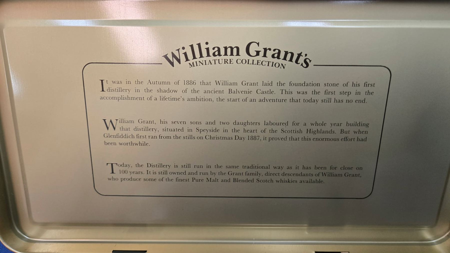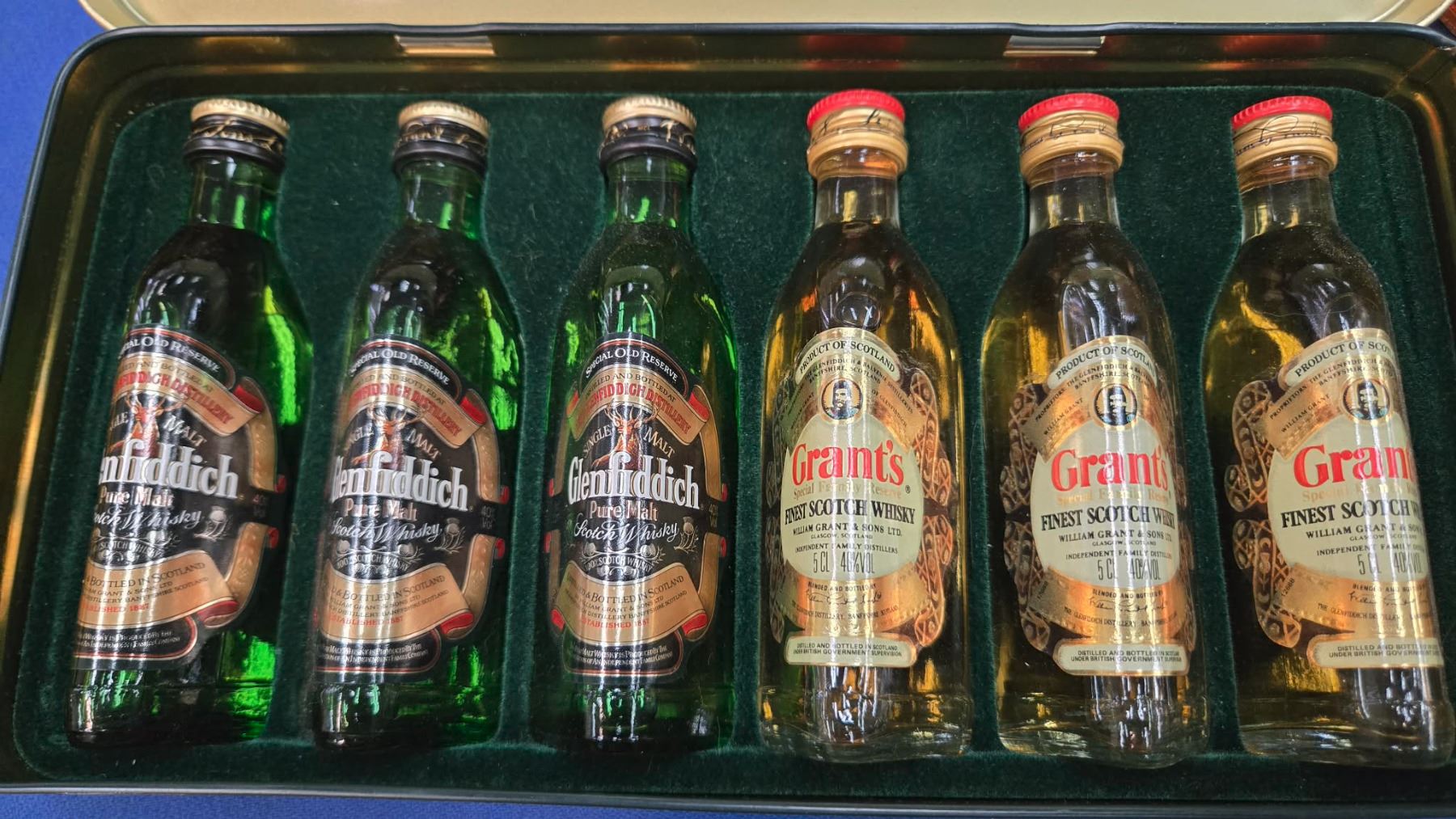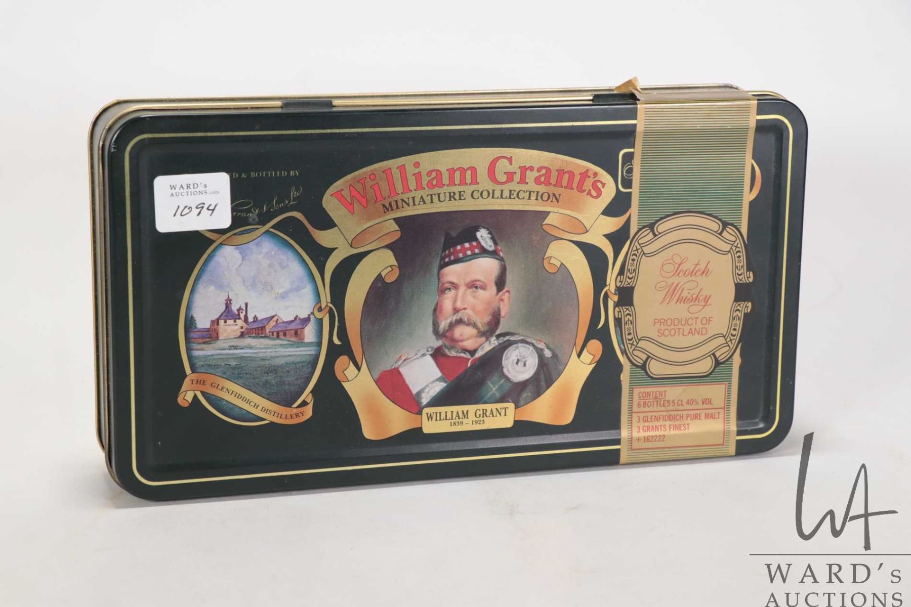 Set of six/ William Grant's miniature whisky collection including three Grant's Scotch Whisky/ 50 cl/ 40% ABV and three Glenfiddich/ Scotch Whisky/ 50 ml/ 40% ABV in metal tin Note: Alcohol cannot be insured by any courier in Canada. Local pick up is recommended. Canadian bidders only.